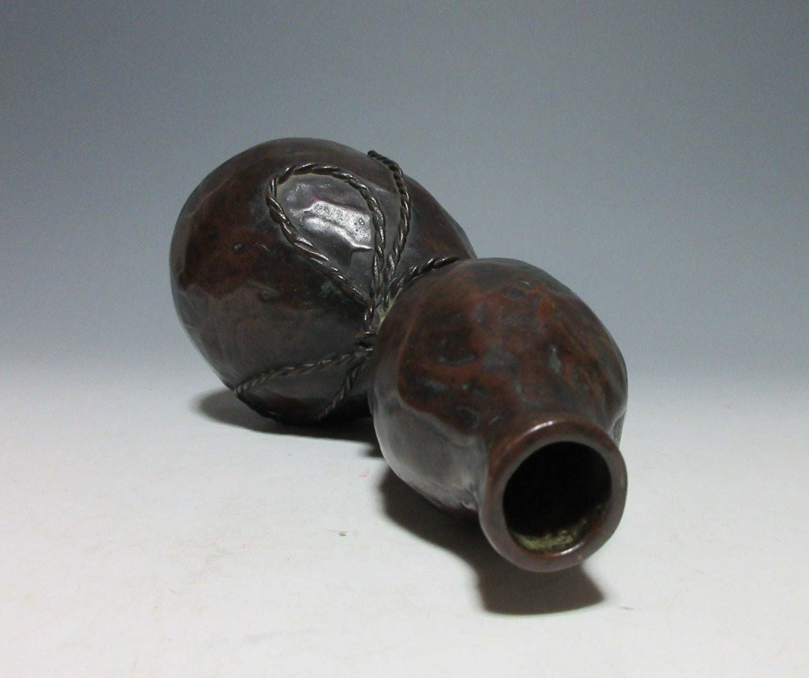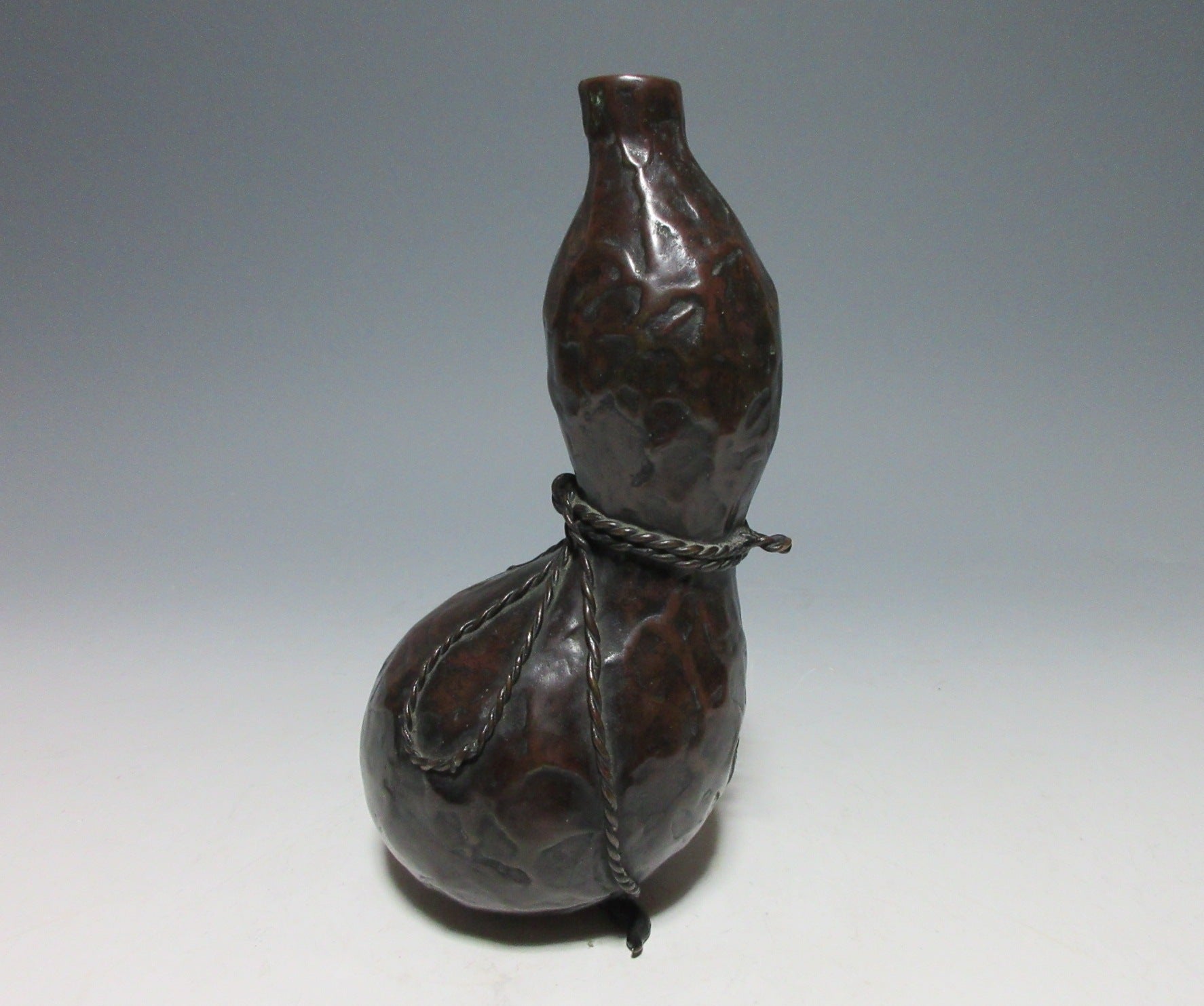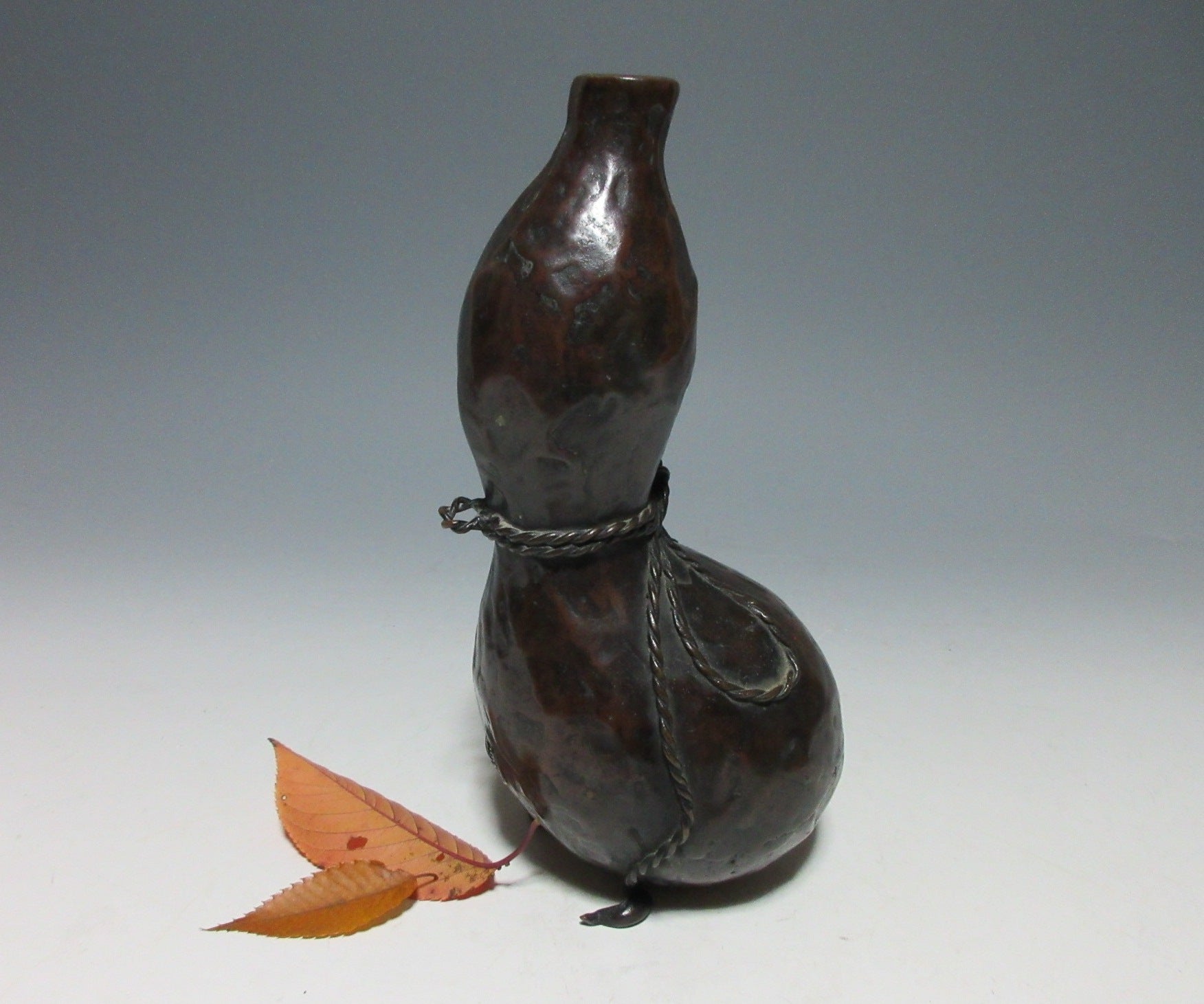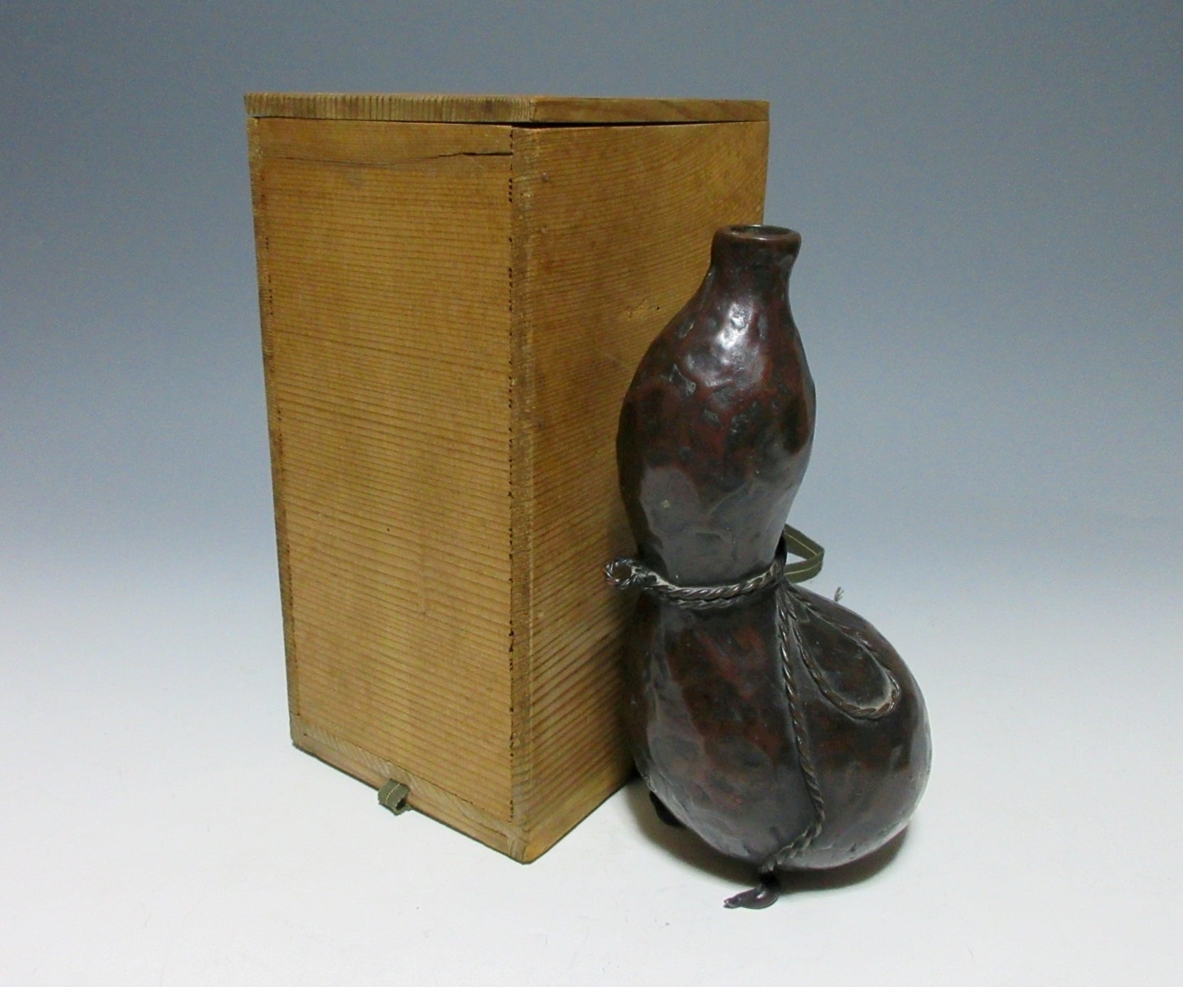 This listing is for an exquisite 19th century antique bronze vase, quite possibly made by the first generation master of the Honma Takusai lineage of bronze artisans from Sado Island. It is hyotan-shaped and cast using the lost-wax method. It has a beautiful patina and the opening is wide enough to fit just a few thin stemmed flowers, although I would be tempted to display it just on its own. The Honma ‘Takusai’ stamp can be found on one side, and it comes with a wooden storage box, however please note that the box is UNSIGNED. In the photos we included a grouping of Takusai stamps belonging to the first generation. The bottom row has red circles indicating an extra small line that the second generation stamps do not have. Also third, fourth etc generations have different stamps to the first two generations. Basically, this vase is either the first or second generation, however research relating to that small extra line suggests that this does indeed belong to the Honma Takusai I (1812-1891).