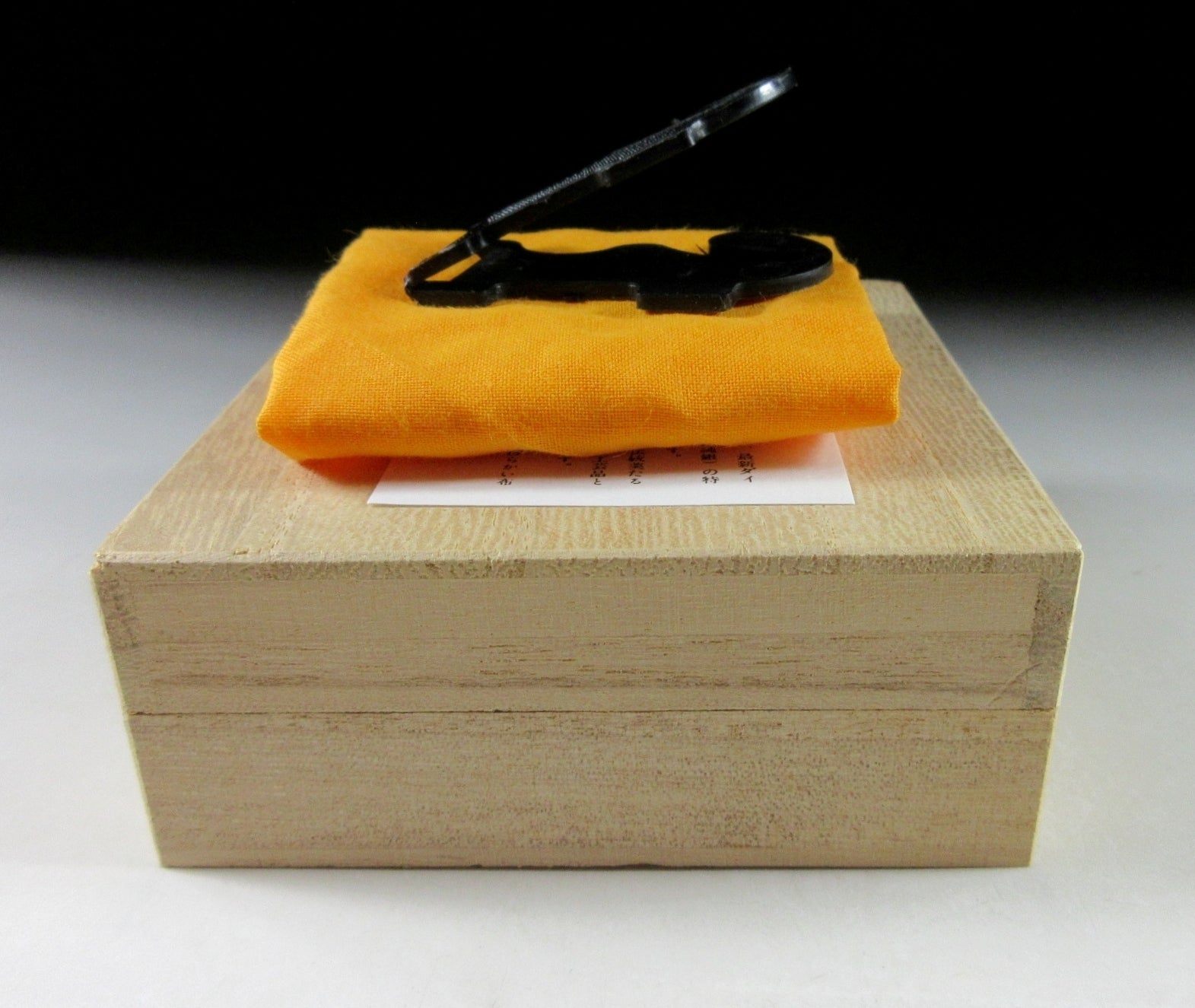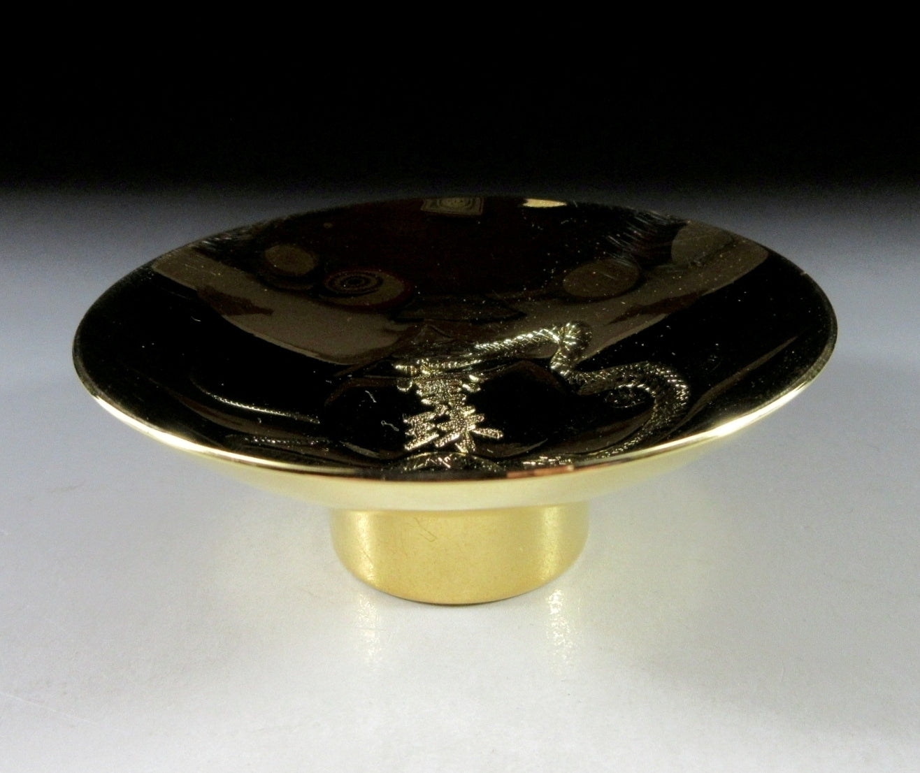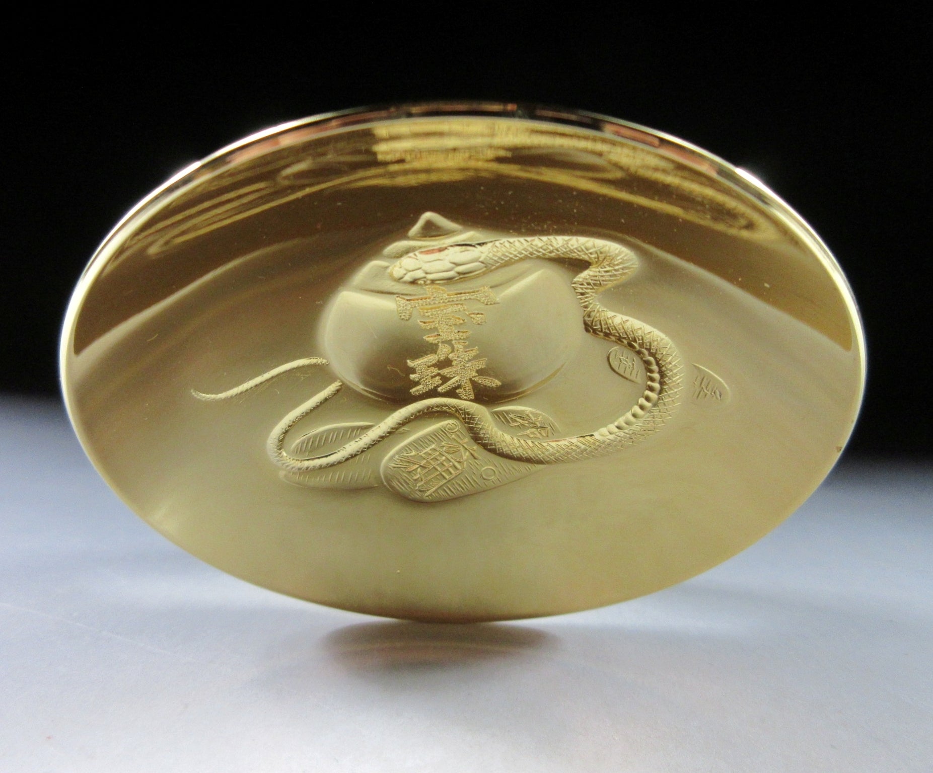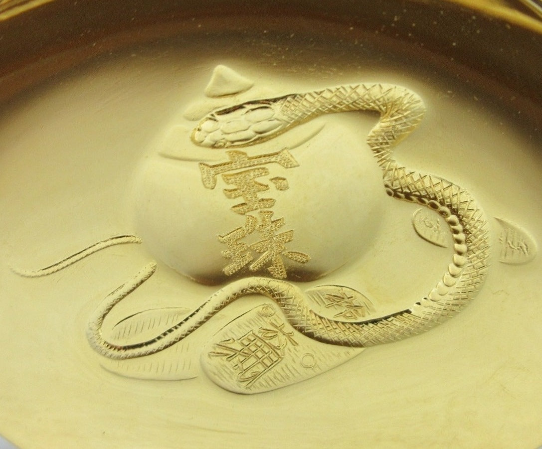 This listing is for a 24KGP gold plated high-purity zinc alloy sake cup. This type of cup is called a sakazuki, which means a flat traditional style of sake cup. Sakazuki are mainly reserved for ceremonial use at weddings or other special occasions such as the tea ceremony. The cup in this listing features a snake and koban gold coins and was most likely made to commemorate the Year of the Snake back in 2001 or 2013. The bottom is marked with 24KGP, and it comes with its original wooden storage box. It also comes with a turmeric coloured wrapping cloth, as well as a plastic stand and a Japanese language profile paper about the materials and manufacturing process.