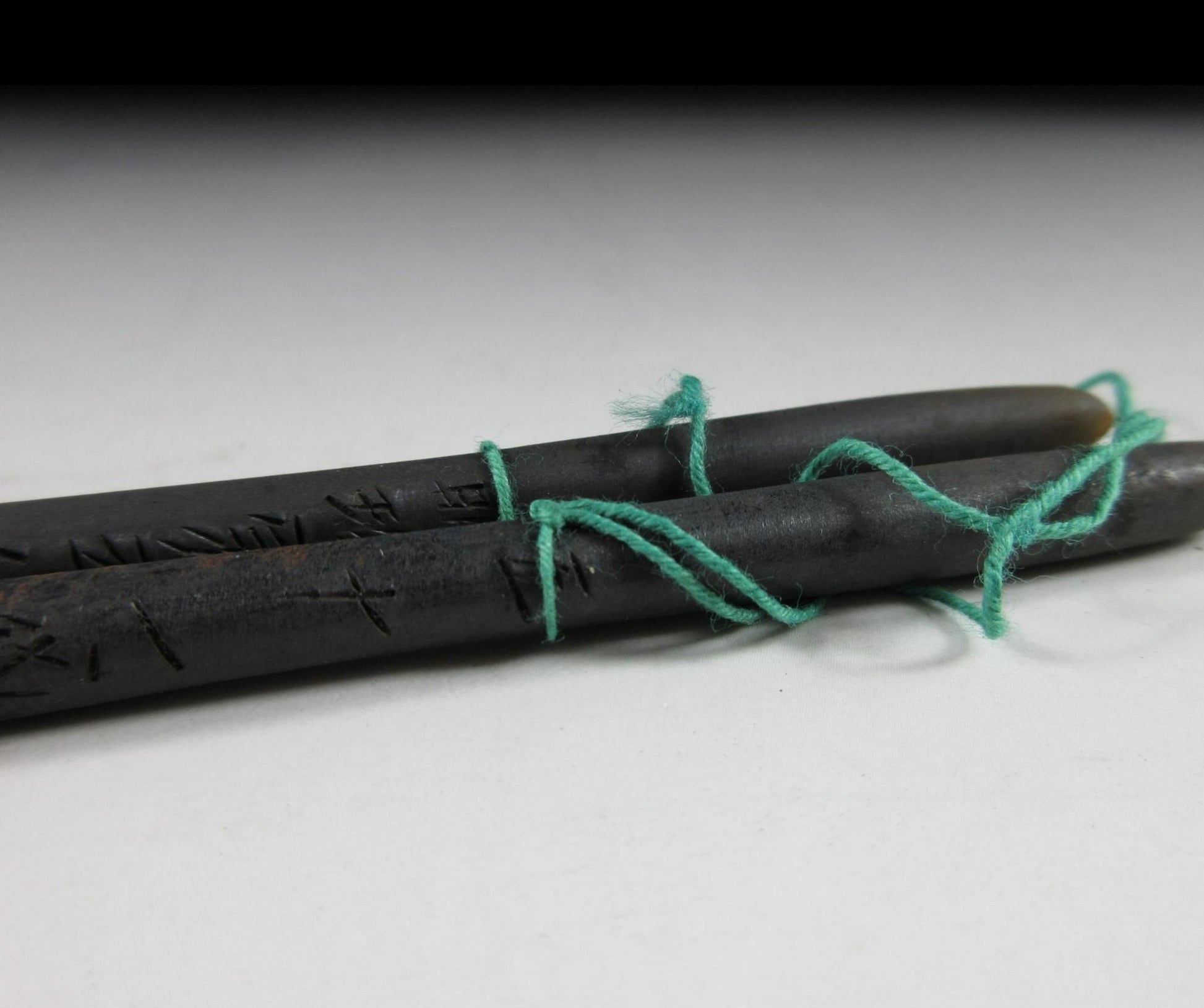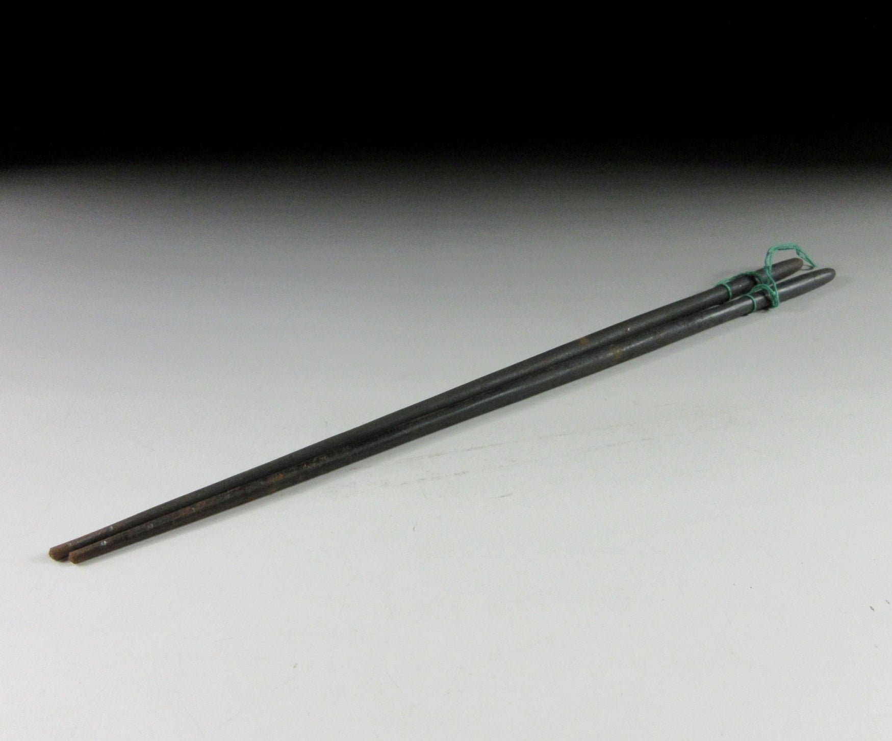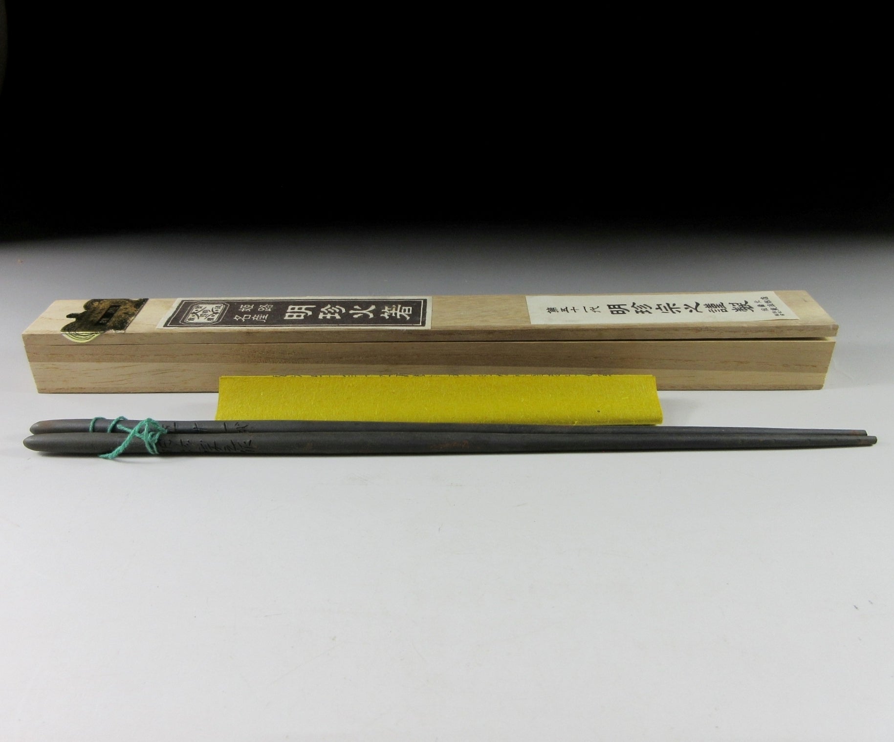 This listing is for a pair of hibashi made around 60 years by 51st generation blacksmith, Myochin Muneyuki. Hibashi are chopsticks used for handling hot charcoal when using a hibachi (brazier). They are usually longer than regular chopsticks and the more expensive type sometimes have a metal decoration on top. The pair of hibashi in this listing are intended for use during the tea ceremony, and they are made of forged tamahagane steel. Tamahagane refers to a type of Japanese steel used for making swords, knives and utensils. Tamahagane steel is made by drying and heating iron sand in a clay tub furnace. It’s heated to around 1000 degrees and then mixed with charcoal to add carbon. Carbon allows the steel to harden, and then the clay tub is broken and the steel is removed. They are signed and come with their original signed wooden storage box. They also come with a Japanese language profile paper about tamahagane hibashi and the Myochin family.