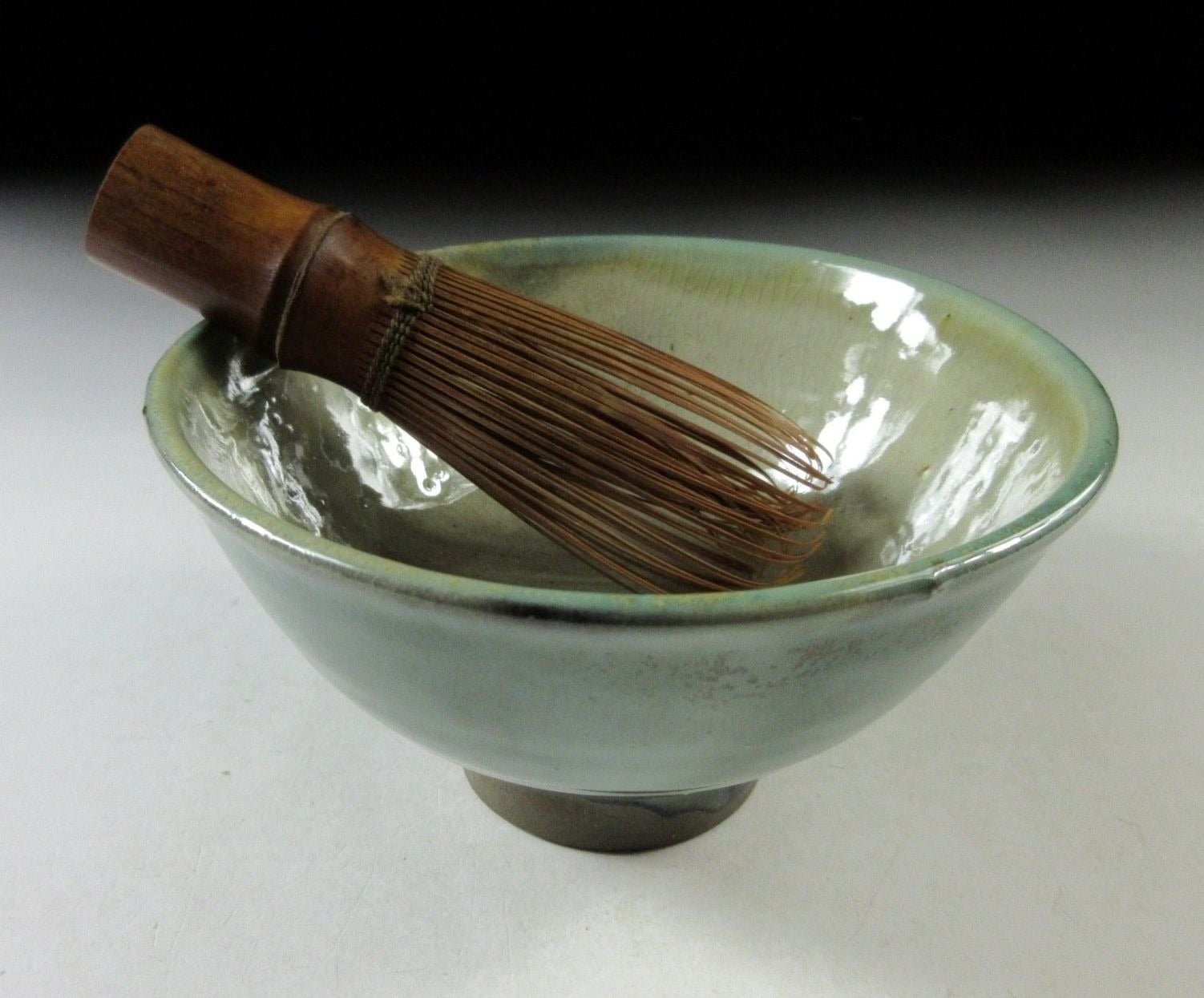 This listing is for a VERY SMALL Agano-ware nodate-sized chawan made around 20-30 years ago. It is wheel-thrown and the exterior is coated in very pale Ryokusho glaze over a high-fired stoneware base. Please note that nodate chawan are smaller than regular sized tea bowls, and are used for outdoor tea ceremonies. This piece is unsigned and doesn’t come with a storage box. *PLEASE NOTE THAT THE CHASEN TEA WHISK IS NOT INCLUDED.