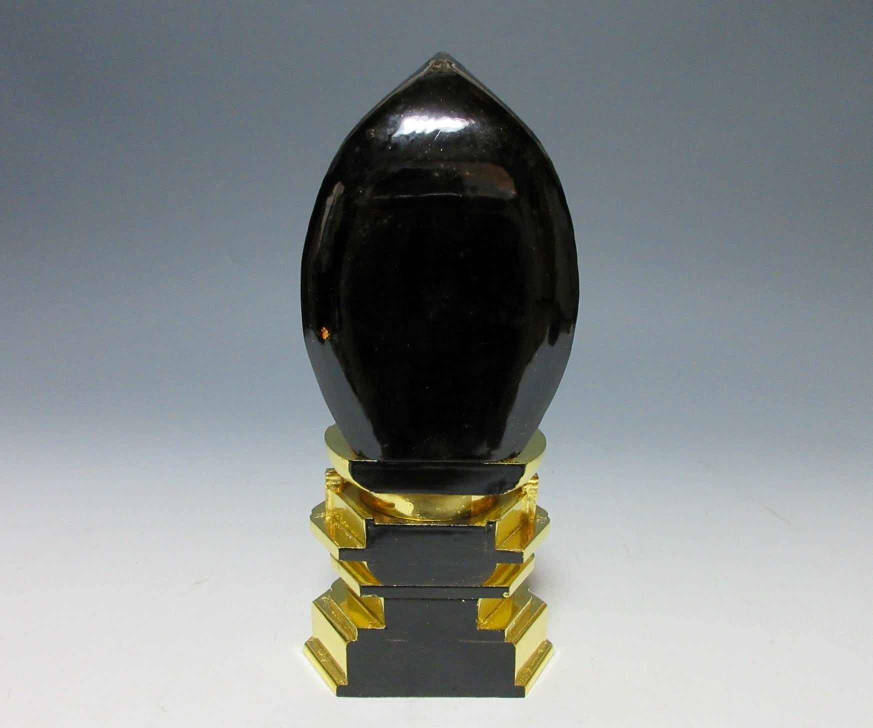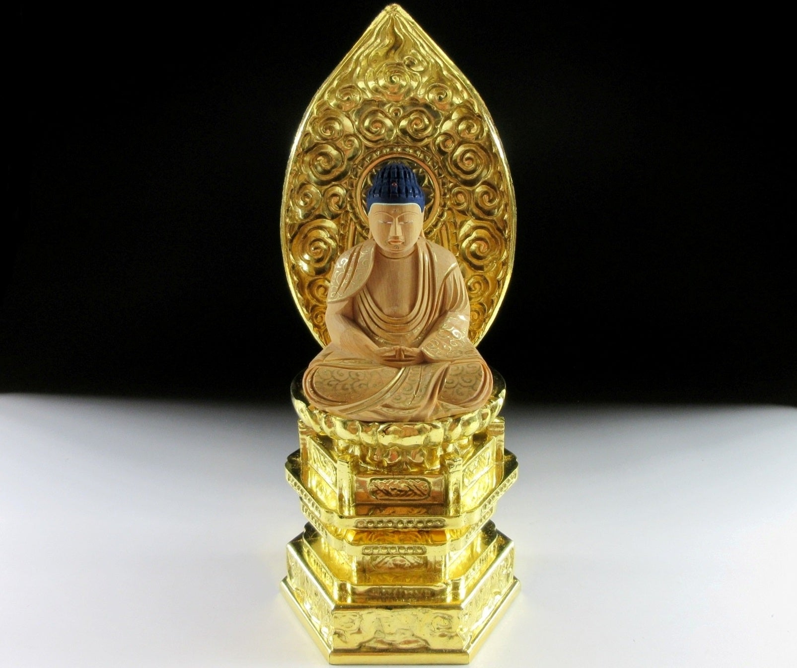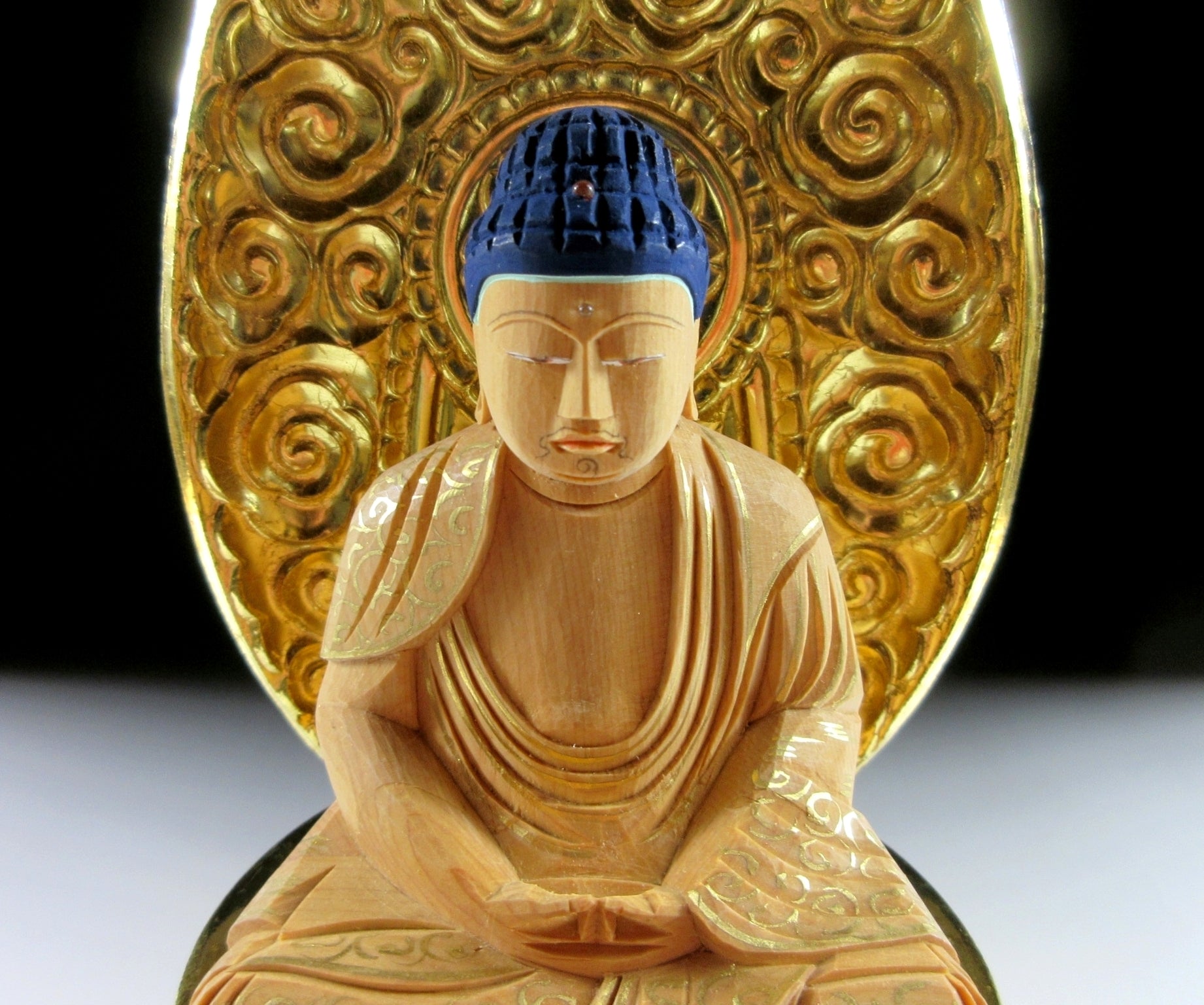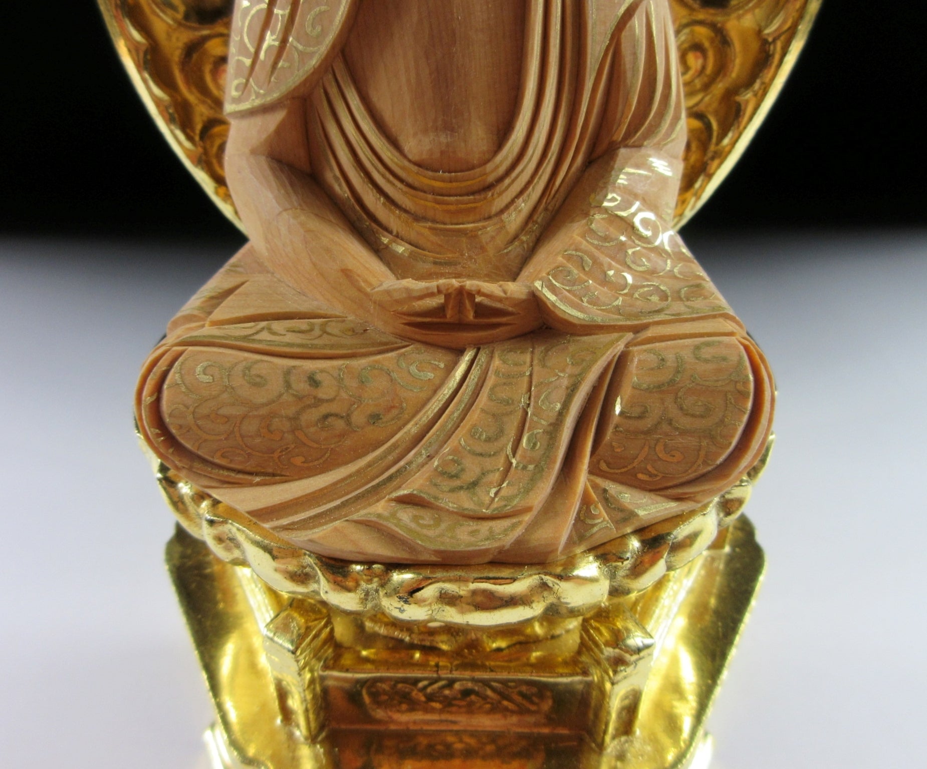 This listing is for an Amida Nyorai Buddha made around 30 years ago. It is made of wood and the pedestal has a lacquer and gilt finish. His hands are in the ‘Jobon Josho’ mudra , which is achieved by making a circle with the thumb and forefinger with the palm facing upward, then placing the hands on one’s lap. Jobon Josho represents a person who has a desire to be reborn in paradise, symbolised by the three minds (sincerity, a deep heart, and dedication). Also this Buddha is seated on an elaborately carved tiered pedestal, and behind him sits an almond shaped mandorla with a cloud pattern. The mandorla is formed when two circles partly overlap, and it symbolises the overlap between heaven and earth.