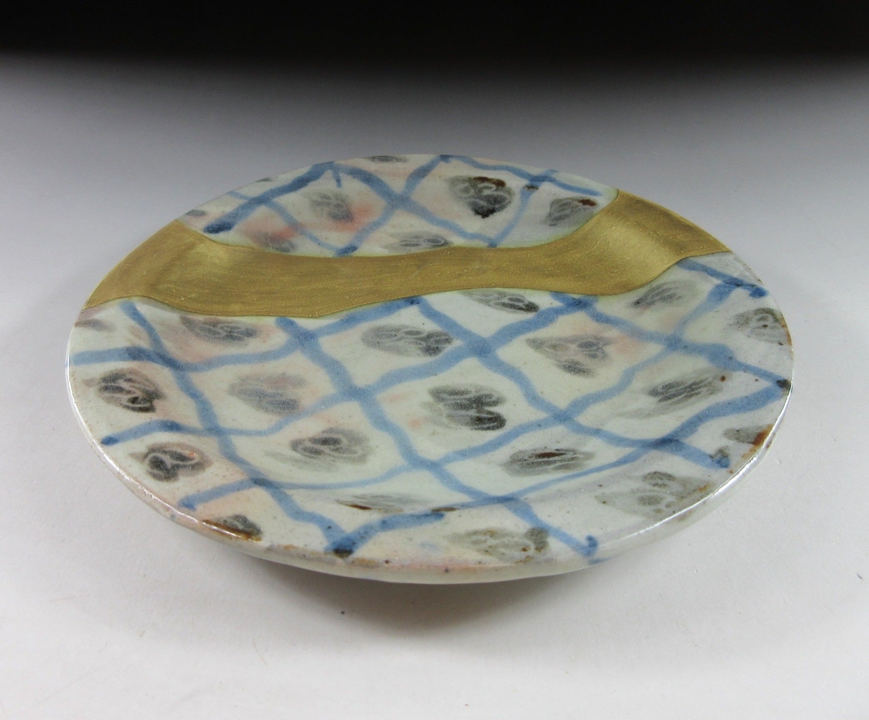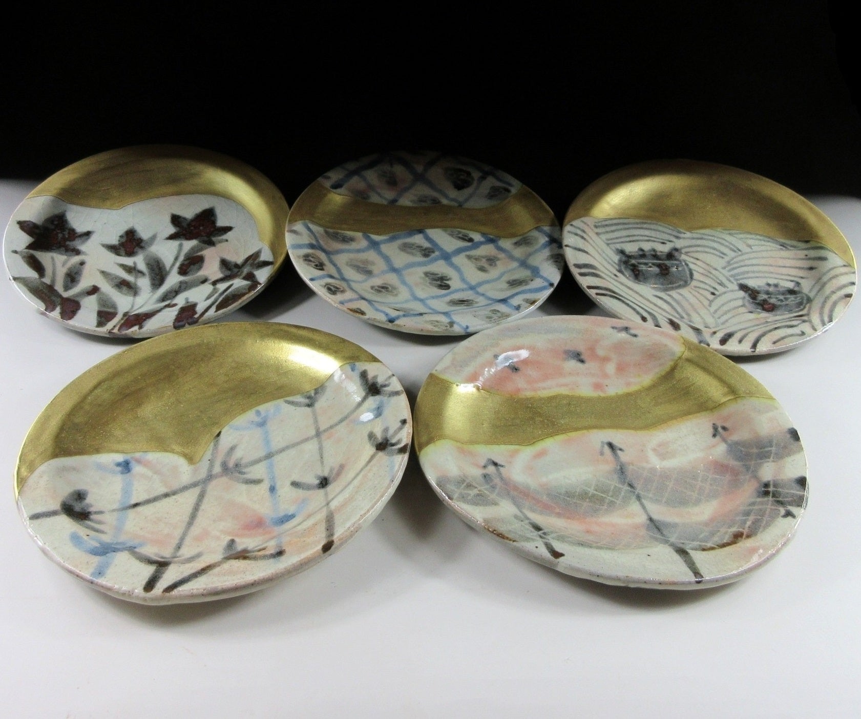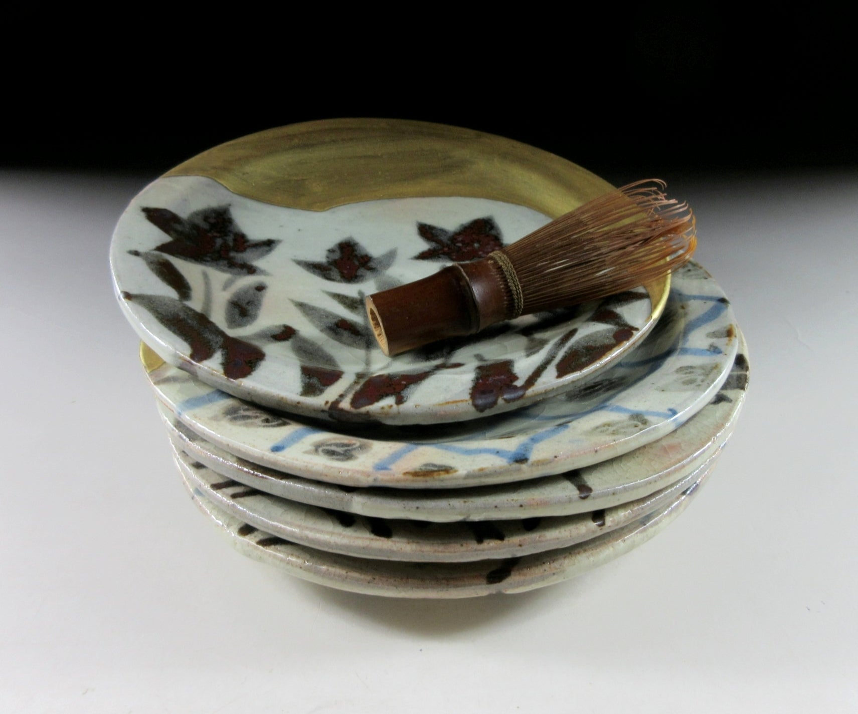 This listing is for a set of five Rosanjin inspired plates made around 10 years ago by Important Intangible Cultural Asset potter, Andou Hidetake. They are made of stoneware clay and each plate is hand-painted and features a small panel of gold enamel emulating the works of master potters Rosanjin and Ninsei. This is a particularly beautiful set of plates ideal for entertaining and special occasions. The mark of the potter can be found on the back of each plate, and they come with their original signed wooden storage box. They also come with five turmeric coloured wrapping cloths for when the plates are not in use. *PLEASE NOTE THAT THE BAMBOO TEA WHISK IS NOT INCLUDED.