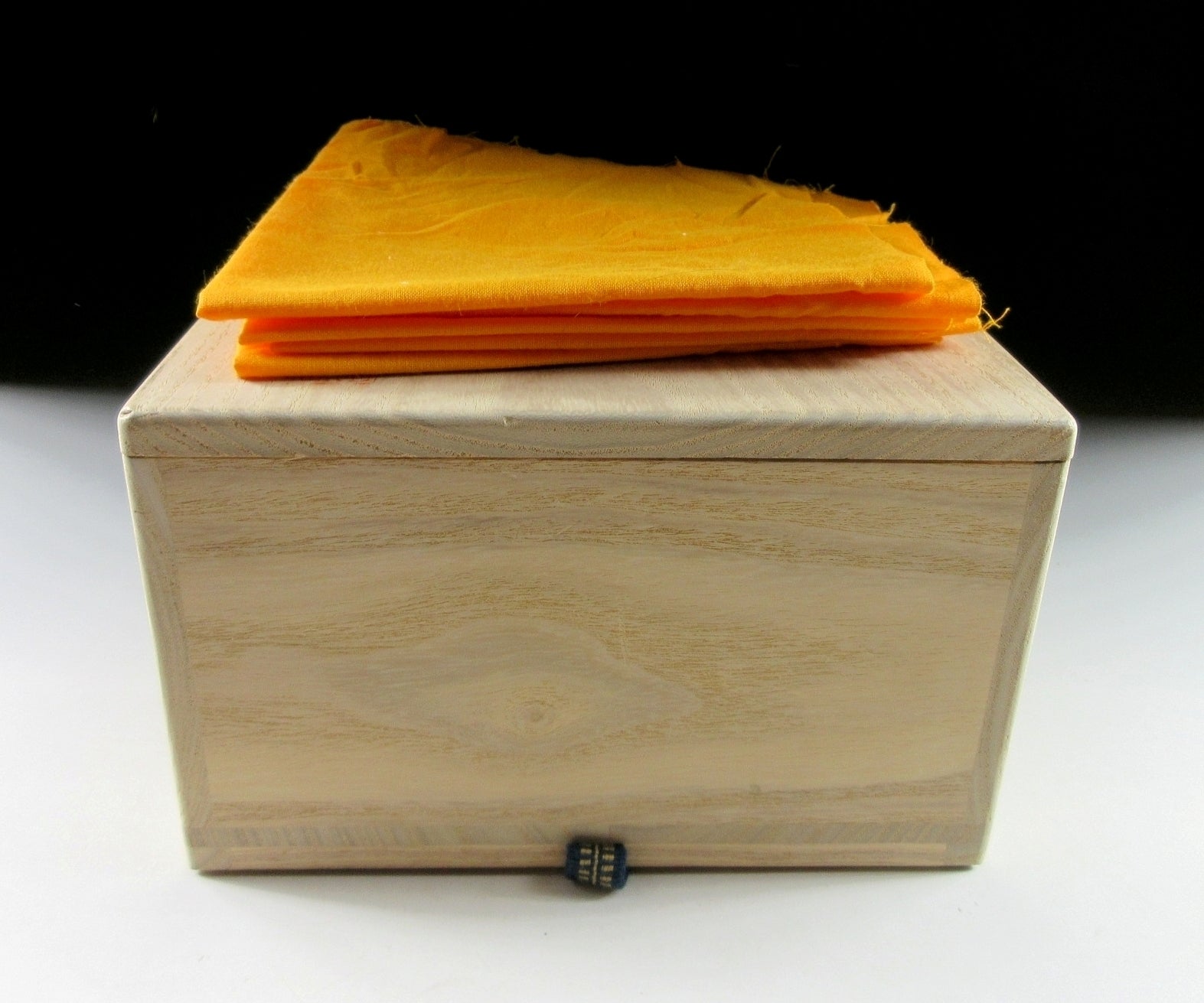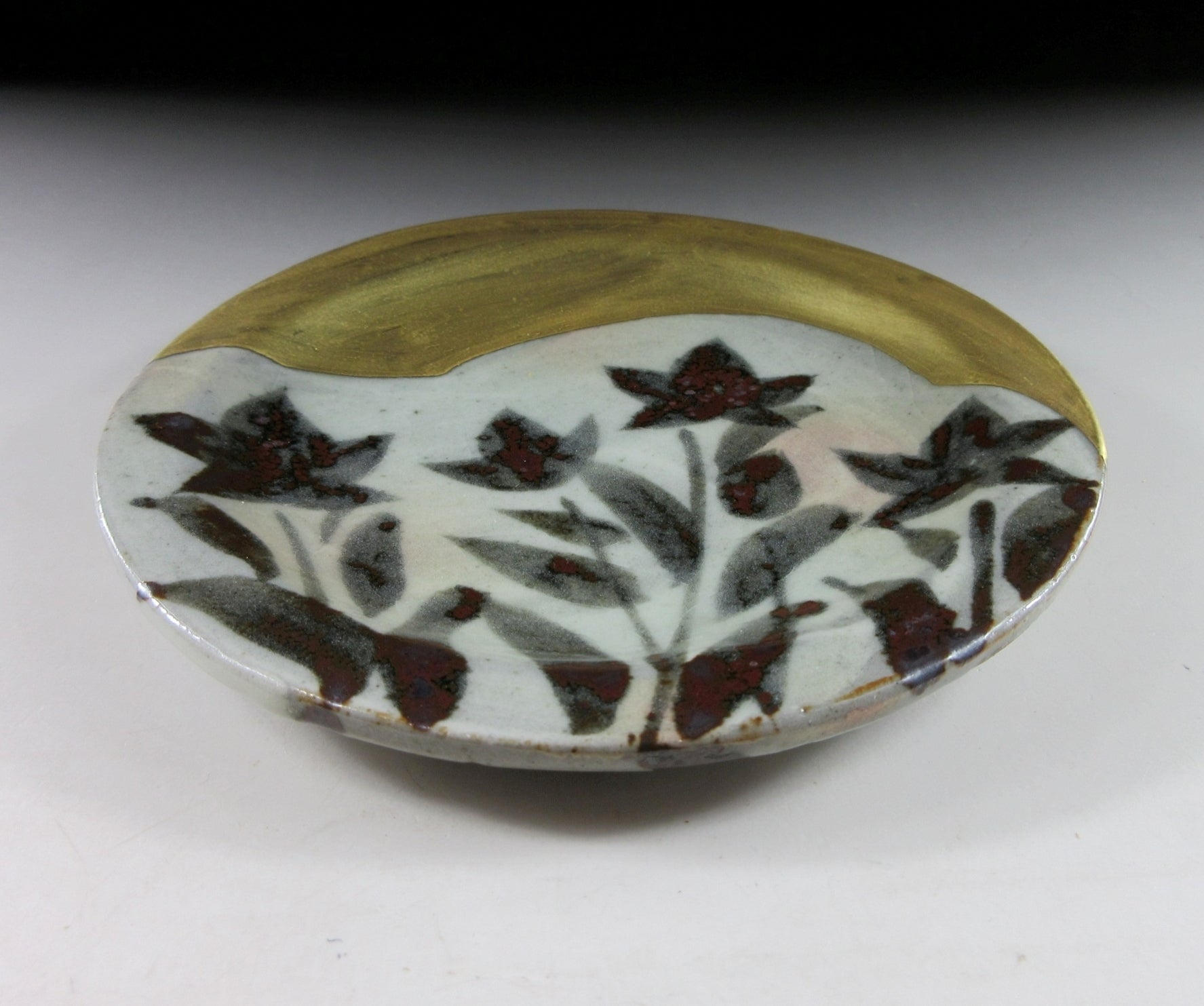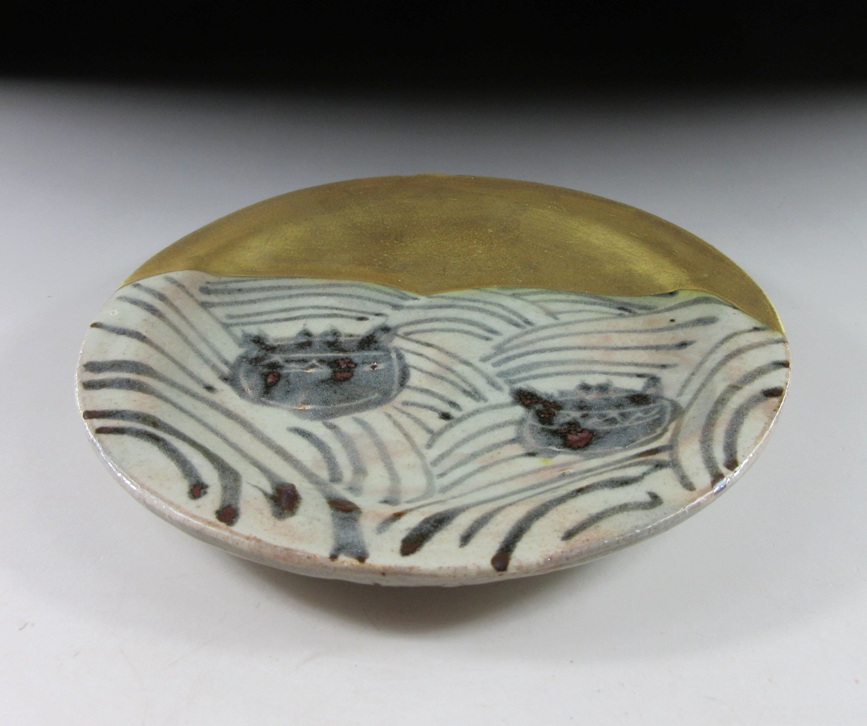 This listing is for a set of five Rosanjin inspired plates made around 10 years ago by Important Intangible Cultural Asset potter, Andou Hidetake. They are made of stoneware clay and each plate is hand-painted and features a small panel of gold enamel emulating the works of master potters Rosanjin and Ninsei. This is a particularly beautiful set of plates ideal for entertaining and special occasions. The mark of the potter can be found on the back of each plate, and they come with their original signed wooden storage box. They also come with five turmeric coloured wrapping cloths for when the plates are not in use. *PLEASE NOTE THAT THE BAMBOO TEA WHISK IS NOT INCLUDED.