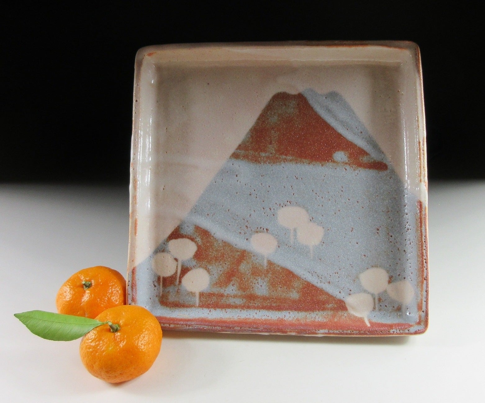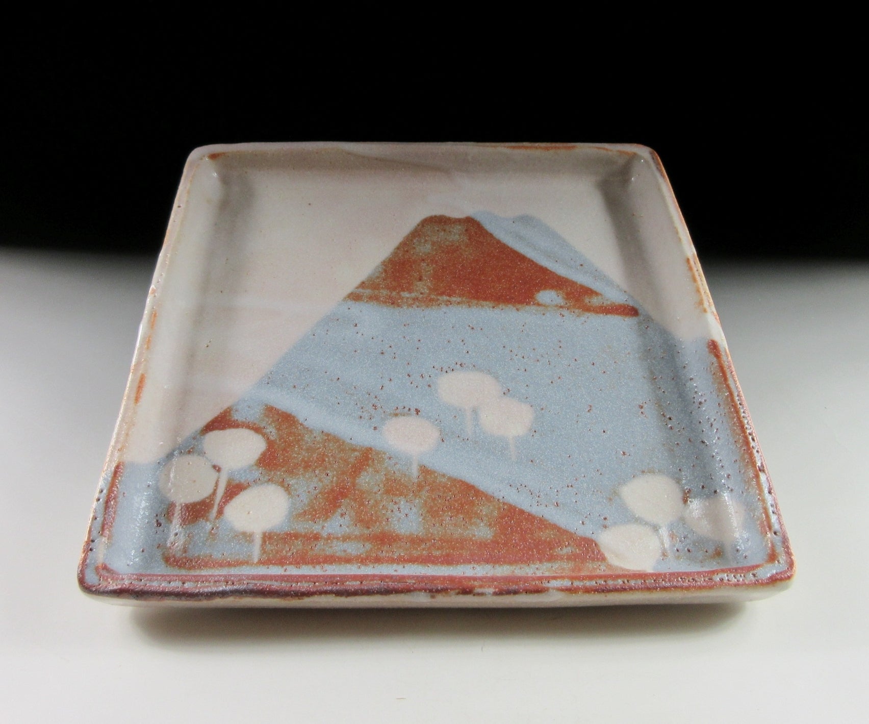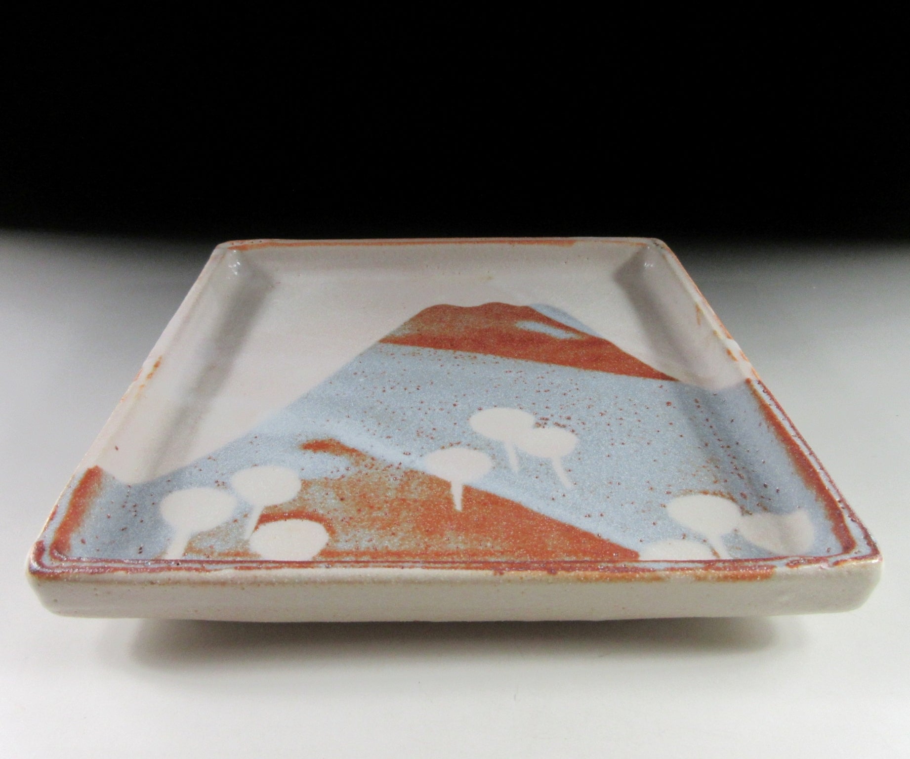 This listing is for a splendid Shino-ware plate made by noted potter, Andou Hidetake. It was made using the slab technique and is decorated with a hand-painted depiction of Mt. Fuji. Mt. Fuji has long inspired artists and poets, its solitary presence well documented in scrolls, woodblock prints, and literature since the 11th century. It is a popular motif during New Year due to its sacred and artistic landscape. In Japanese culture there is a belief in ‘hatsuyume’, which is the first dream of the New Year. According to an old Japanese proverb it is extremely good luck to dream about Mt. Fuji, hawks, and eggplants on the first day of the year. The piece sits upon four small feet, and both the top and bottom is coated with a generous layer of white feldspar glaze. The mark of the potter can be found on the bottom, and it comes with its original signed wooden storage box.