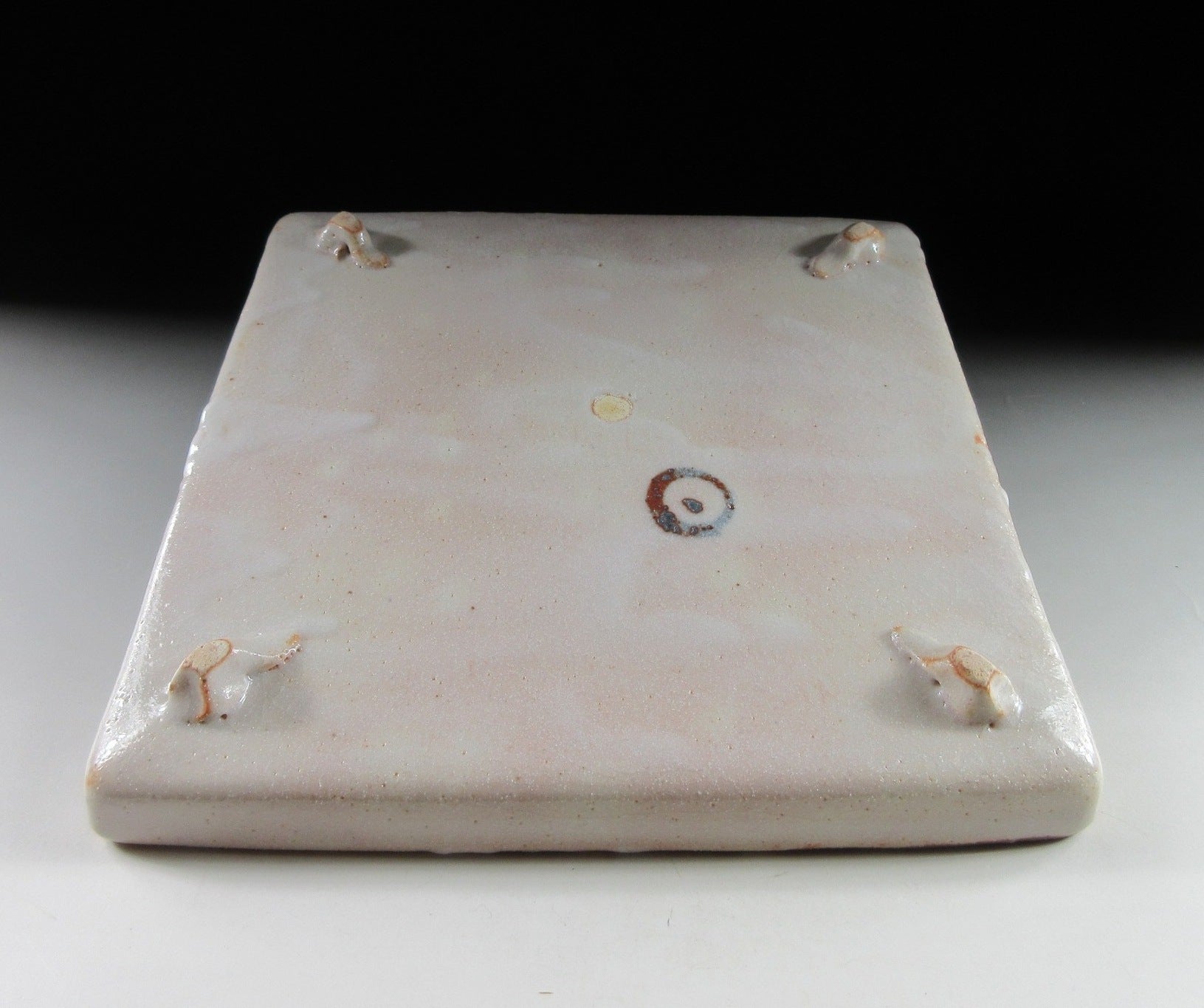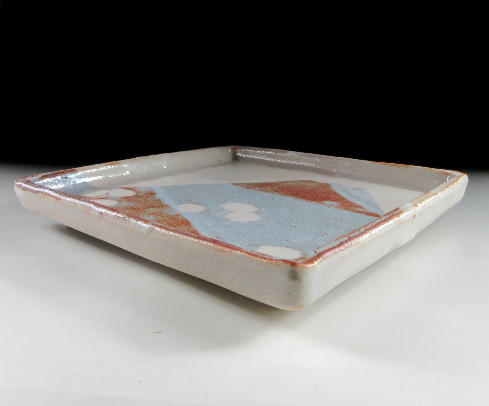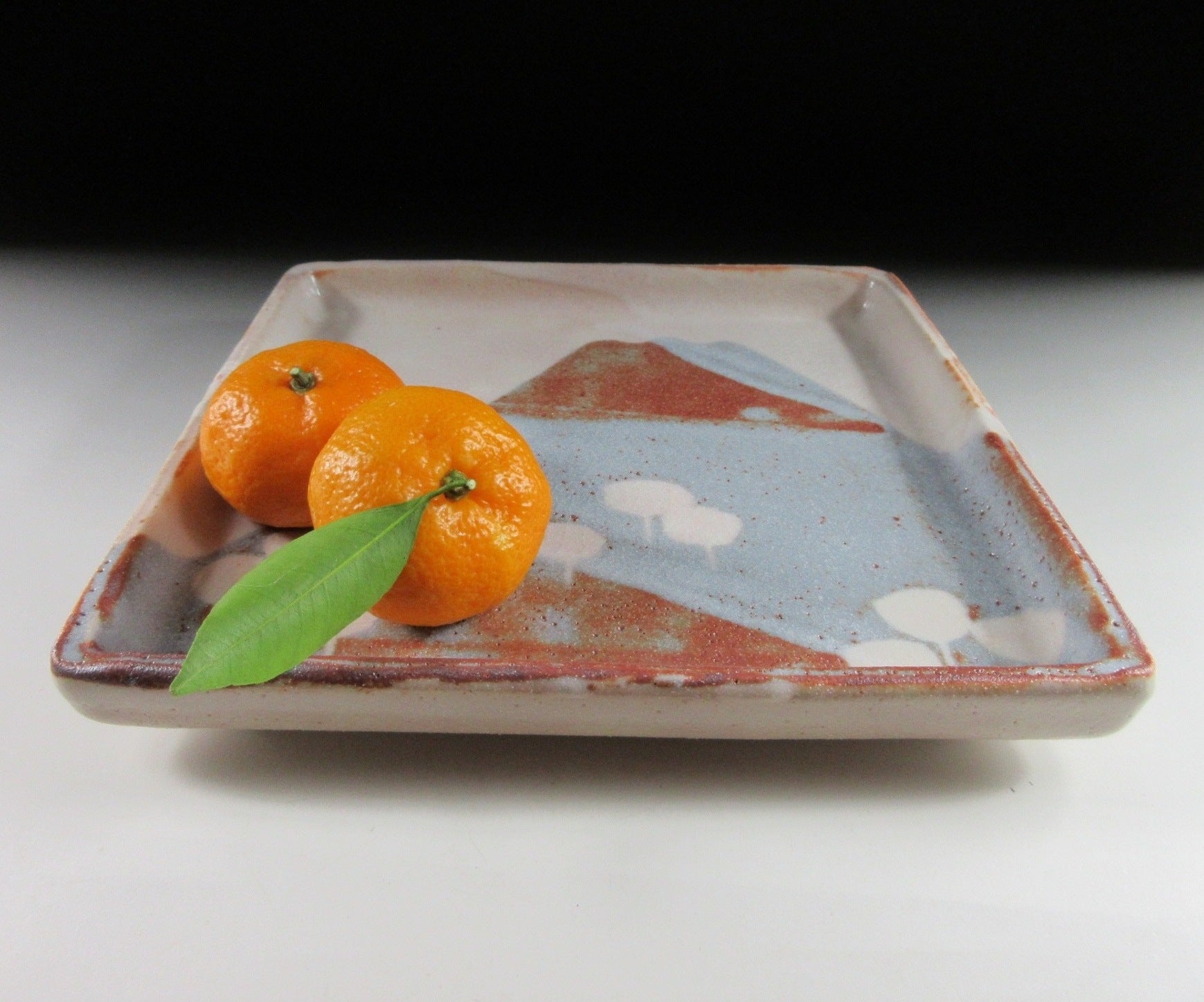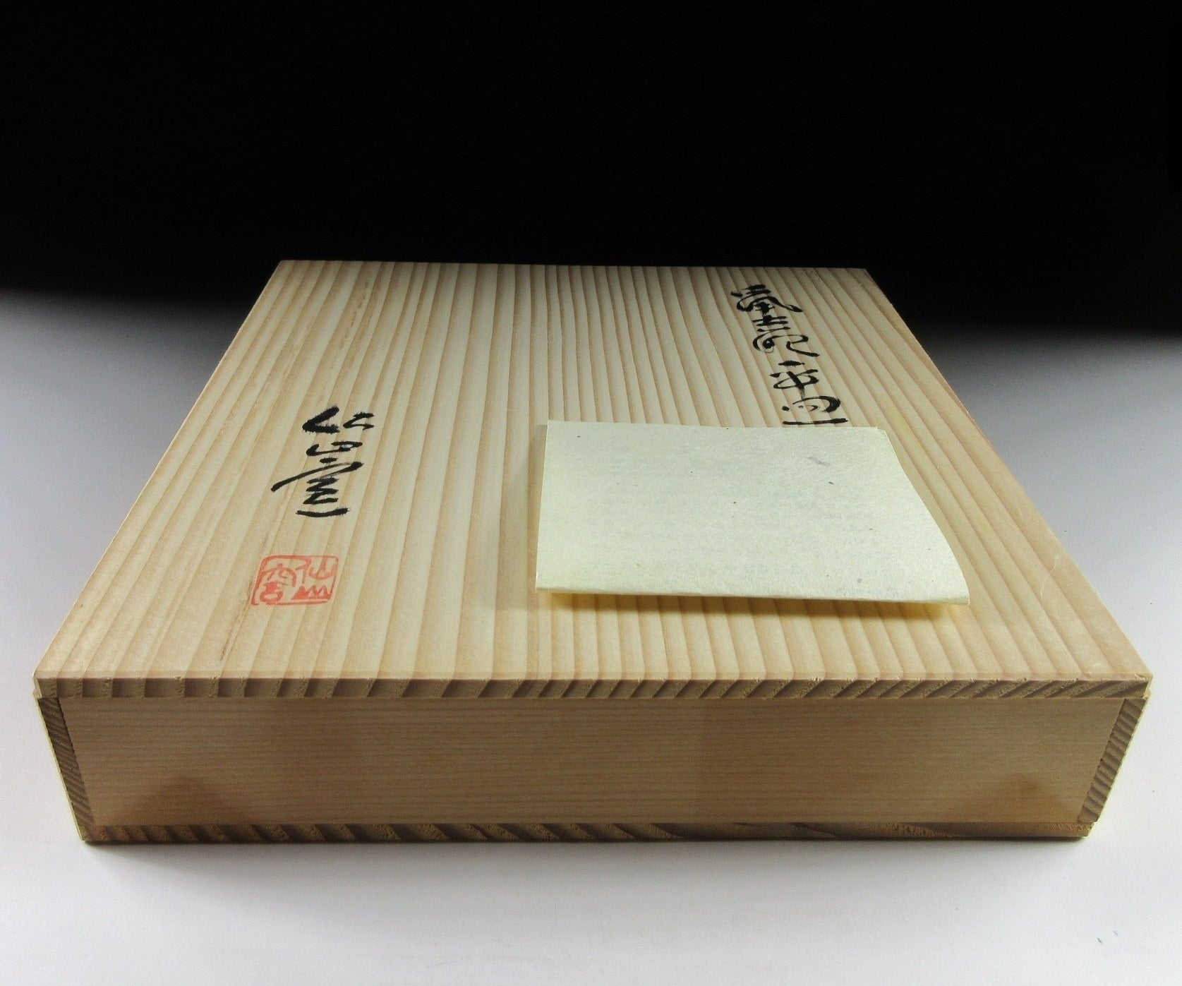 This listing is for a splendid Shino-ware plate made by noted potter, Andou Hidetake. It was made using the slab technique and is decorated with a hand-painted depiction of Mt. Fuji. Mt. Fuji has long inspired artists and poets, its solitary presence well documented in scrolls, woodblock prints, and literature since the 11th century. It is a popular motif during New Year due to its sacred and artistic landscape. In Japanese culture there is a belief in ‘hatsuyume’, which is the first dream of the New Year. According to an old Japanese proverb it is extremely good luck to dream about Mt. Fuji, hawks, and eggplants on the first day of the year. The piece sits upon four small feet, and both the top and bottom is coated with a generous layer of white feldspar glaze. The mark of the potter can be found on the bottom, and it comes with its original signed wooden storage box.