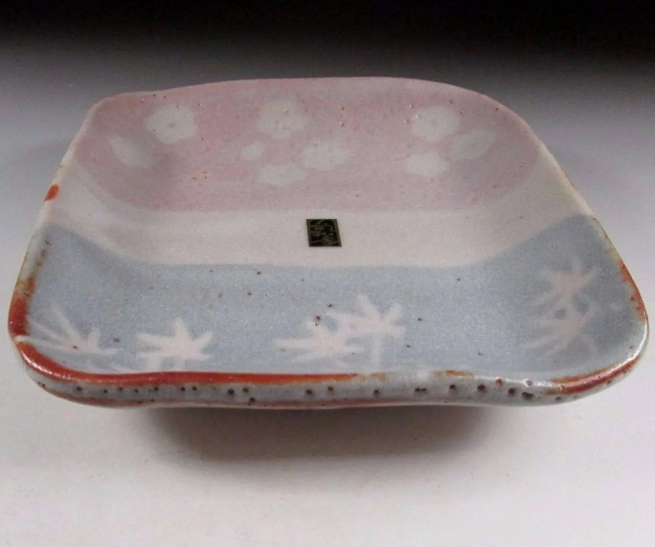 This listing is for an attractive Shino-ware tea plate made by highly regarded potter, Andou Hidetake. It was made using the slab technique and decorated with ume blossoms and momiji leaves. The combination of glazes and slip creates a gentle and somewhat quiet impression. The plate is supported by four small feet, and the mark of the potter can be found on the bottom. It comes with its original signed wooden storage box, as well as a Japanese language profile about the potter.