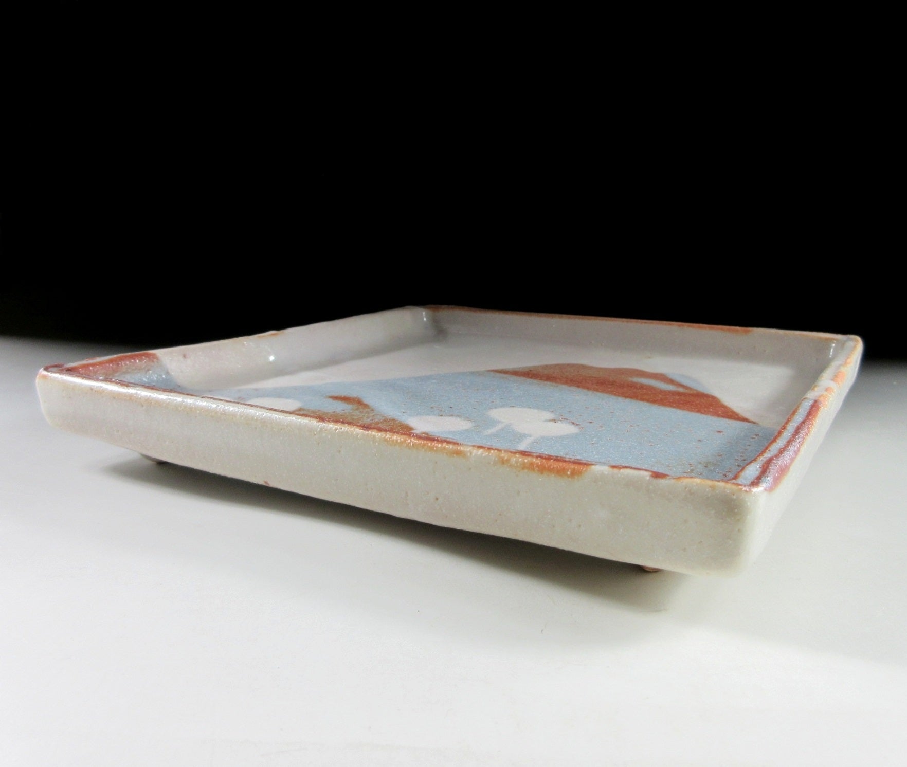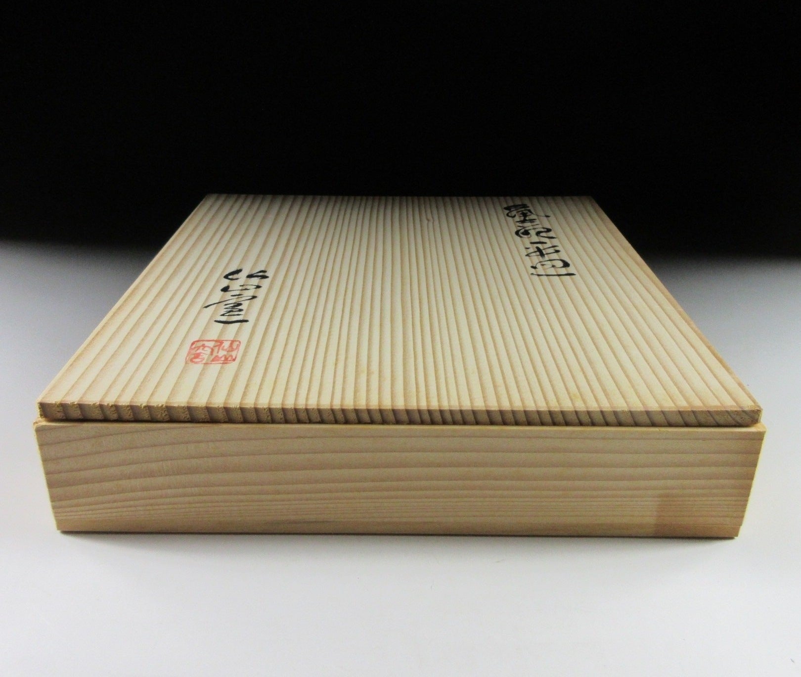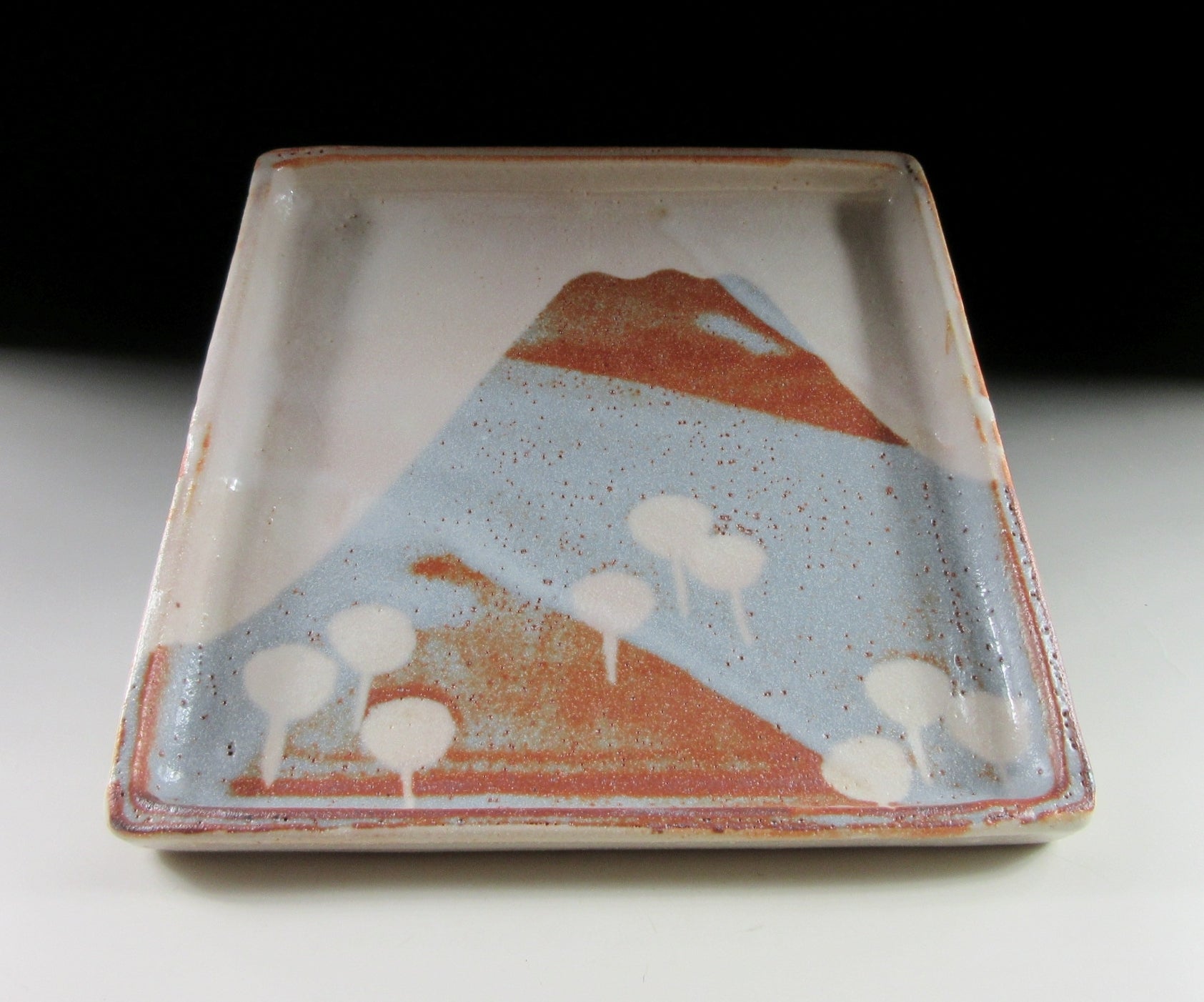 This listing is for a splendid Shino-ware plate made by noted potter, Andou Hidetake. It was made using the slab technique and is decorated with a hand-painted depiction of Mt. Fuji. Mt. Fuji has long inspired artists and poets, its solitary presence well documented in scrolls, woodblock prints, and literature since the 11th century. It is a popular motif during New Year due to its sacred and artistic landscape. In Japanese culture there is a belief in ‘hatsuyume’, which is the first dream of the New Year. According to an old Japanese proverb it is extremely good luck to dream about Mt. Fuji, hawks, and eggplants on the first day of the year. The piece sits upon four small feet, and both the top and bottom is coated with a generous layer of white feldspar glaze. The mark of the potter can be found on the bottom, and it comes with its original signed wooden storage box.