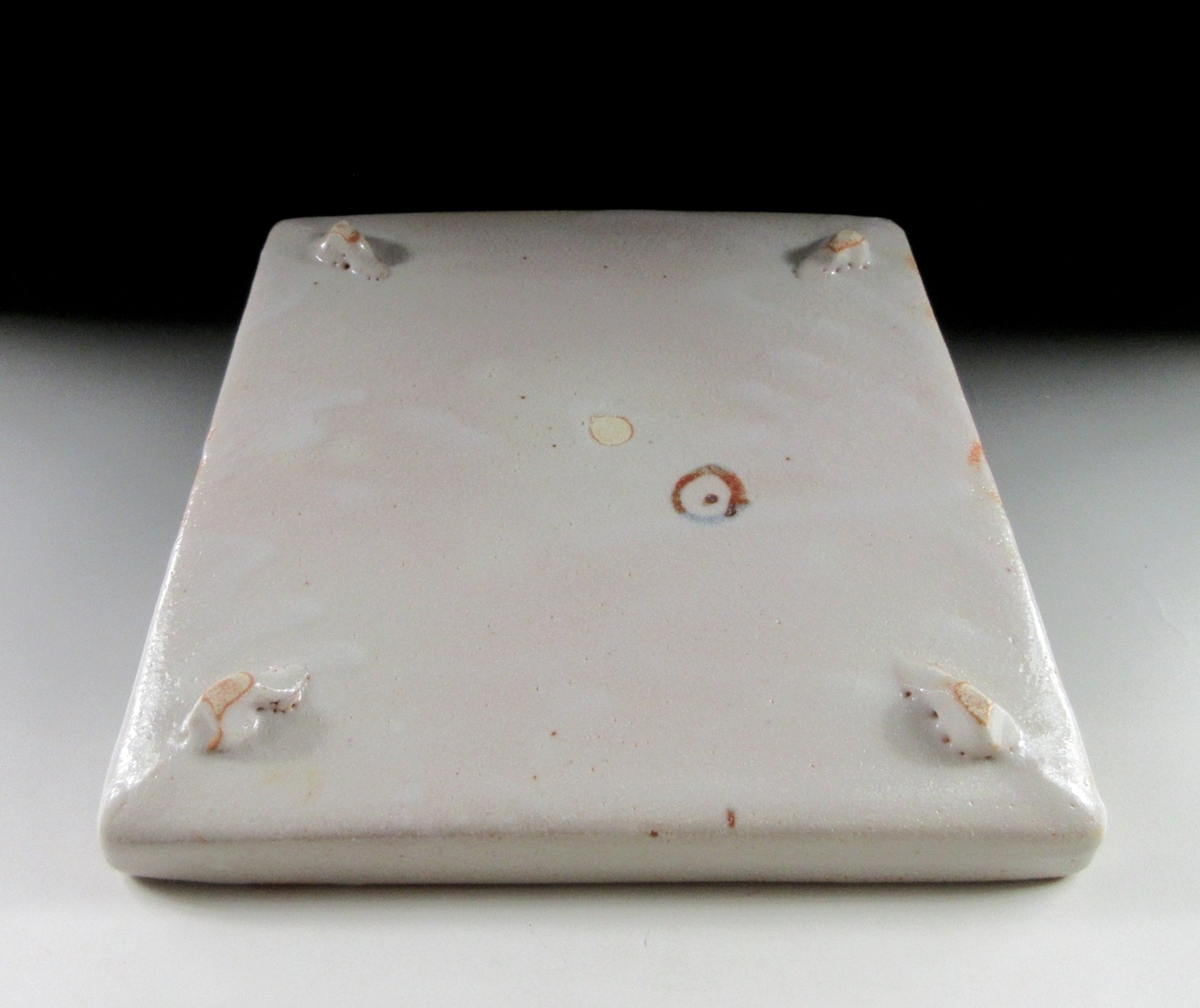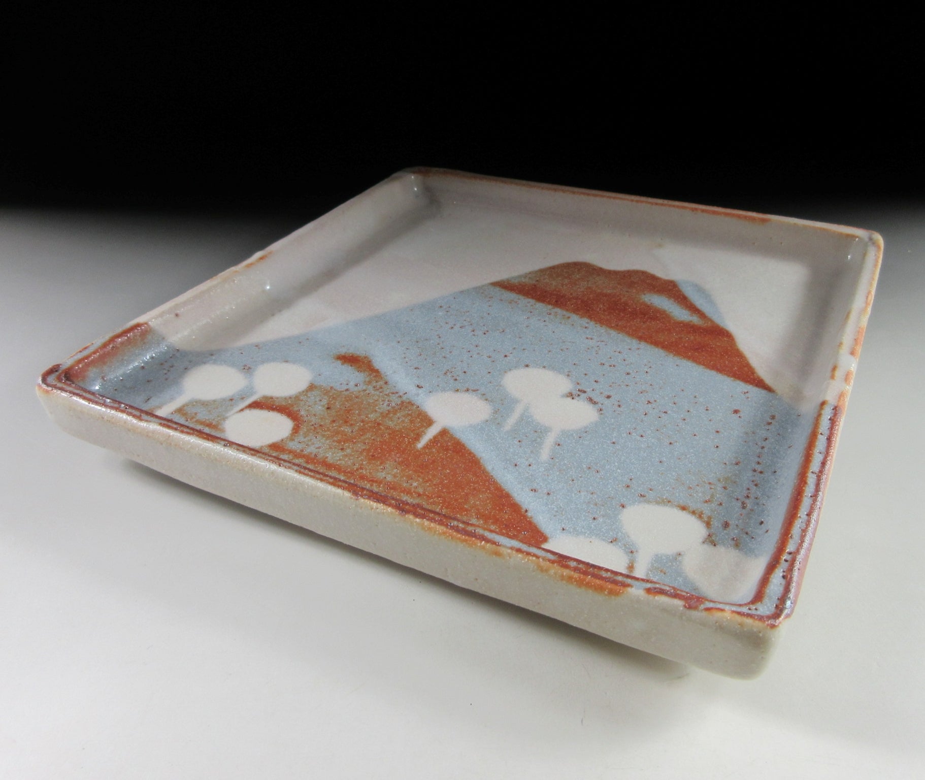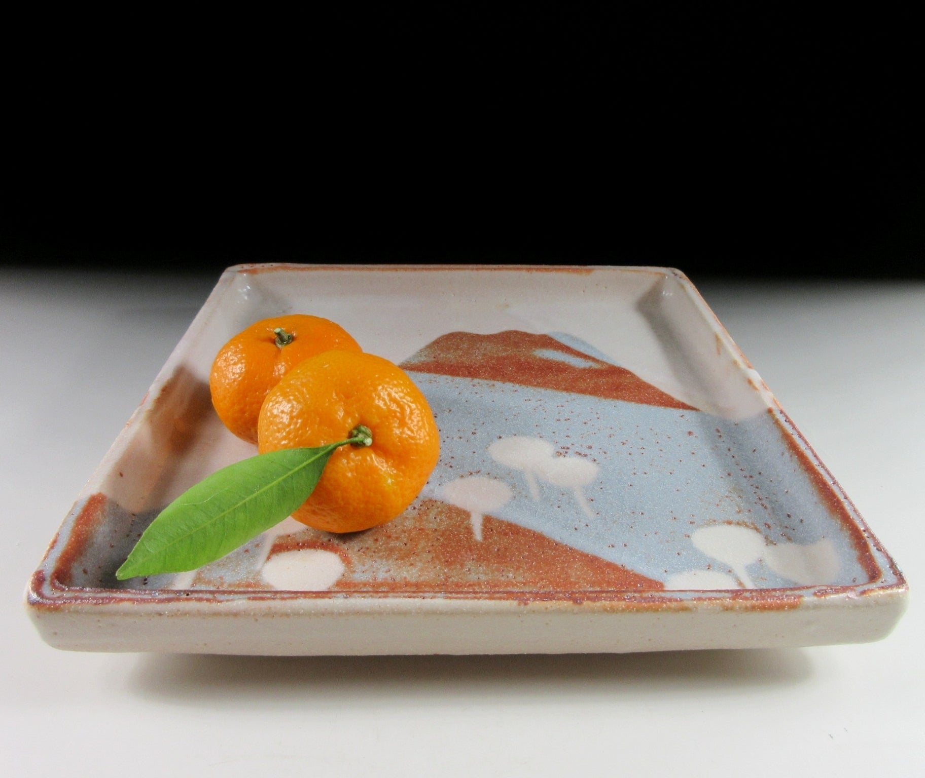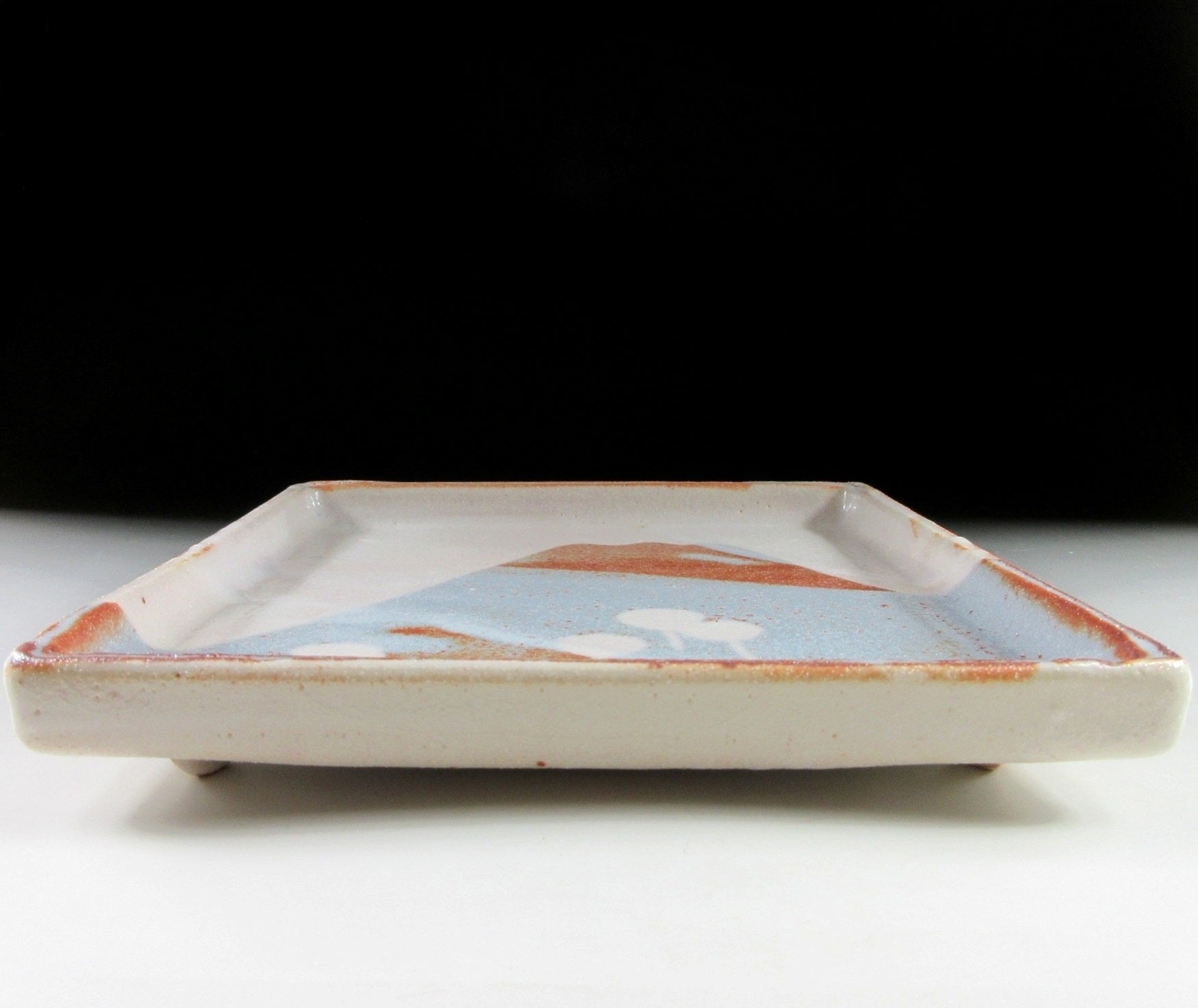 This listing is for a splendid Shino-ware plate made by noted potter, Andou Hidetake. It was made using the slab technique and is decorated with a hand-painted depiction of Mt. Fuji. Mt. Fuji has long inspired artists and poets, its solitary presence well documented in scrolls, woodblock prints, and literature since the 11th century. It is a popular motif during New Year due to its sacred and artistic landscape. In Japanese culture there is a belief in ‘hatsuyume’, which is the first dream of the New Year. According to an old Japanese proverb it is extremely good luck to dream about Mt. Fuji, hawks, and eggplants on the first day of the year. The piece sits upon four small feet, and both the top and bottom is coated with a generous layer of white feldspar glaze. The mark of the potter can be found on the bottom, and it comes with its original signed wooden storage box.