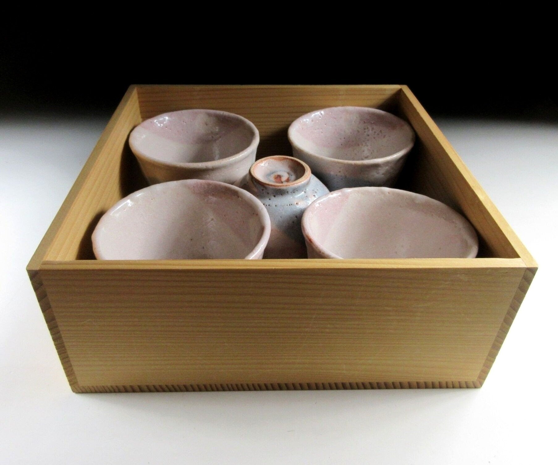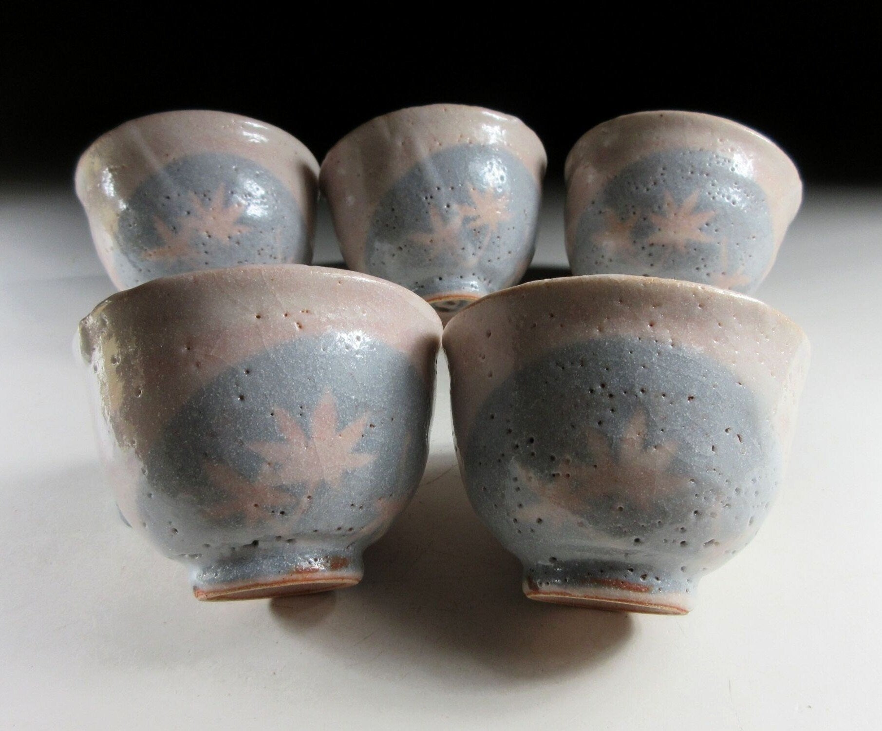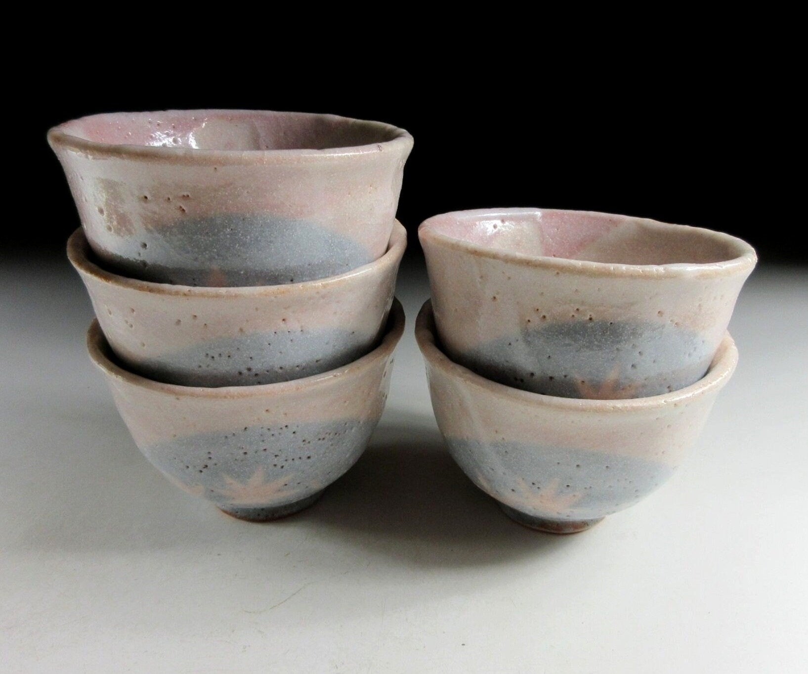 This listing is for a set of five Shino-ware tea cups made around 20 years ago by Important Intangible Cultural Asset potter, Andou Hidetake. They are wheel-thrown and decorated with ume blossoms and momiji leaves. The combination of glazes and slip creates a gentle impression which charms the viewer. These cups are intended for serving sencha, and they’re suitable for daily use. The mark of the potter can be found on the bottom of each cup, and they come with their original signed storage box.