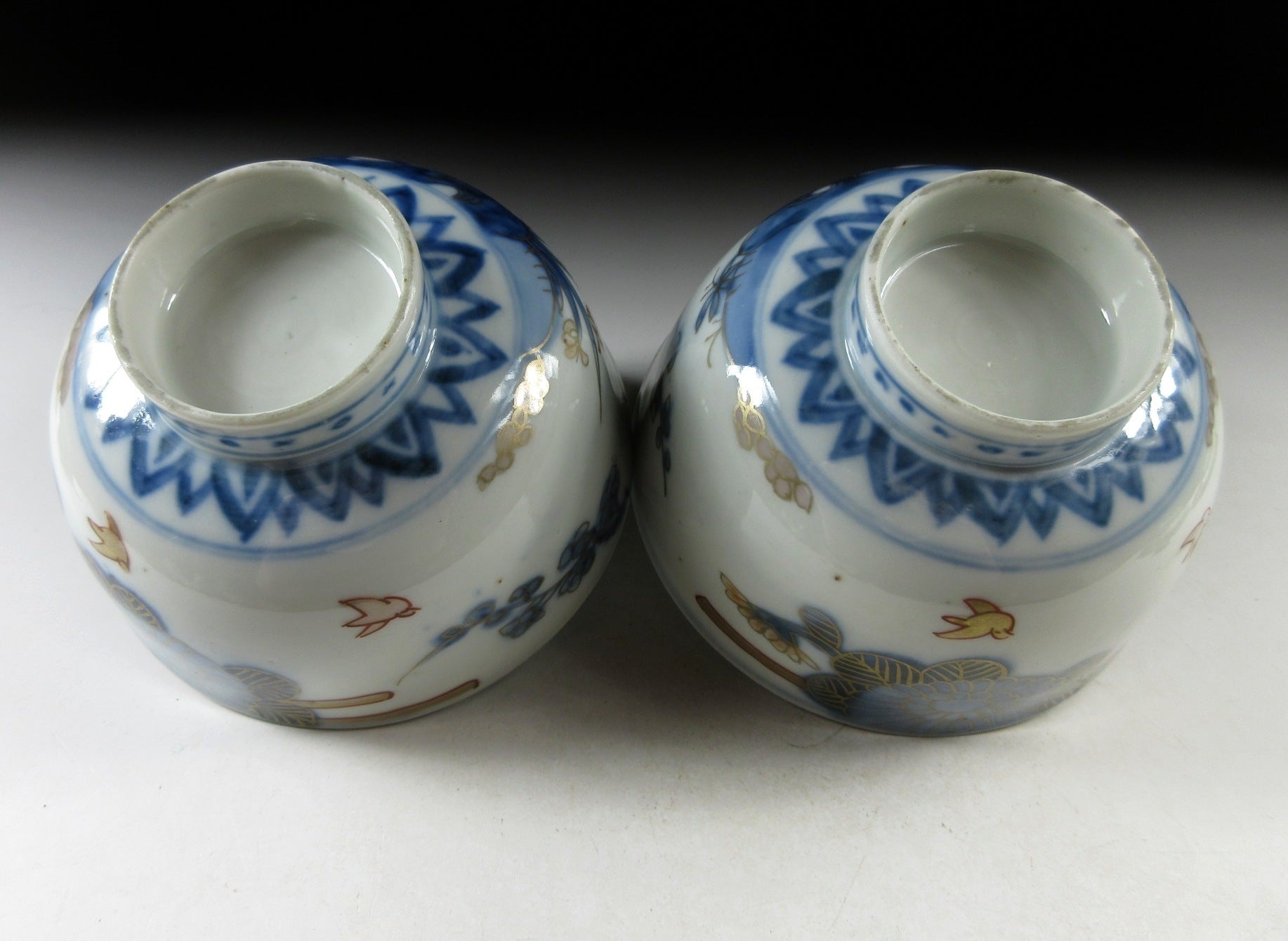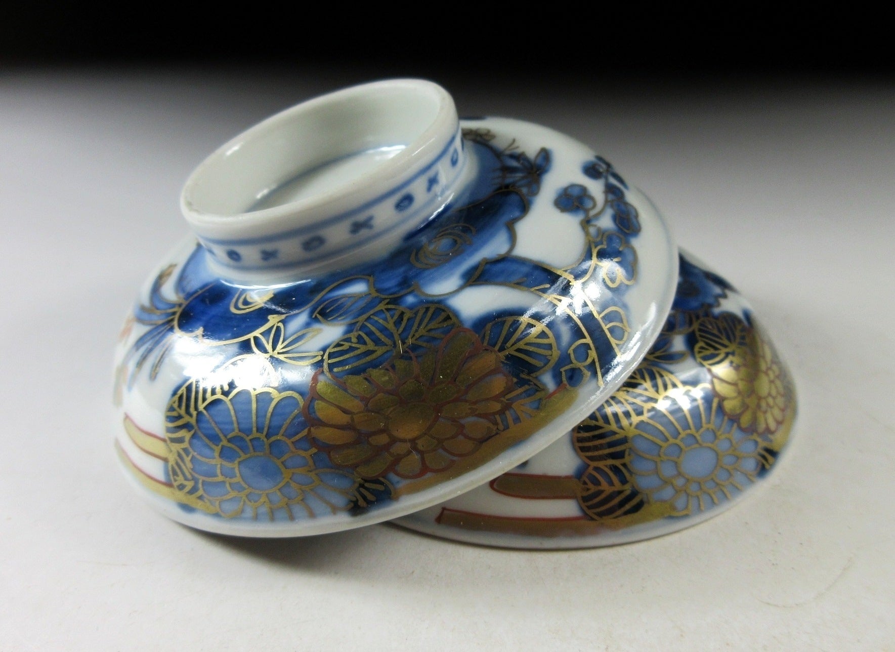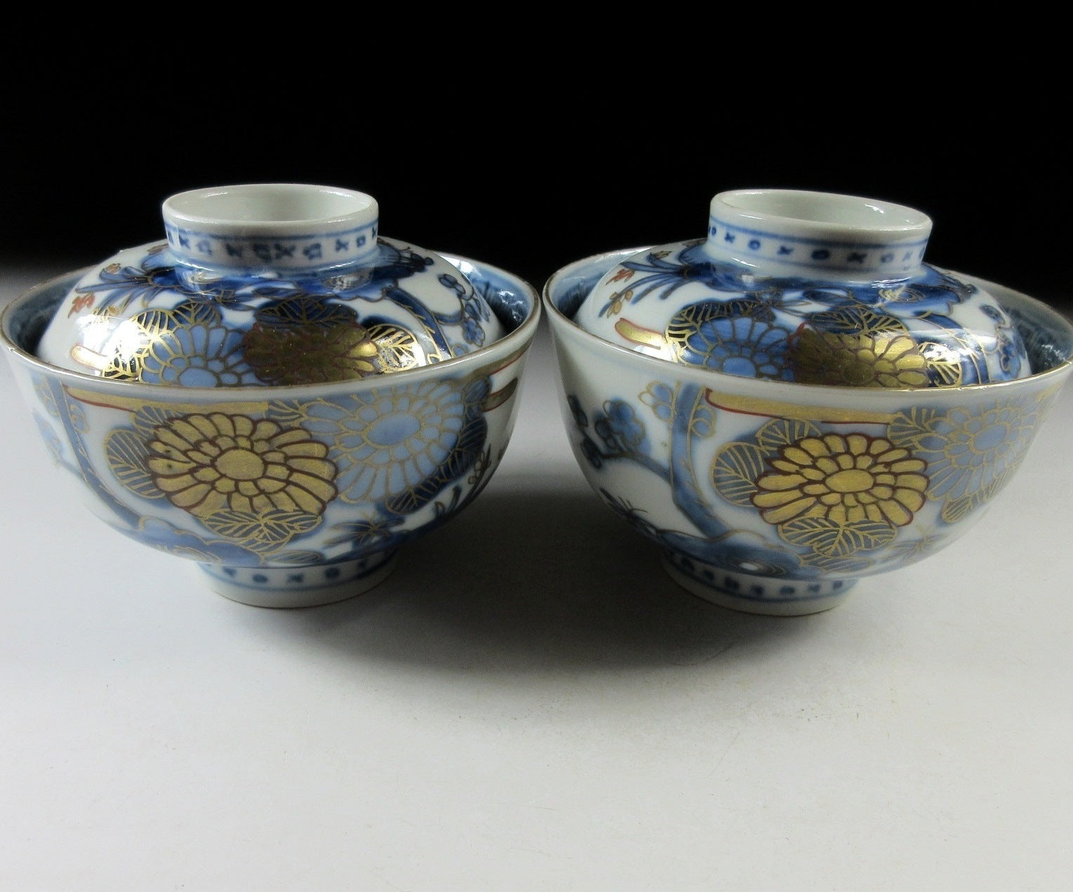 This listing is for a pair of antique Imari-ware lidded bowls made around 100-120 years ago. They are hand-painted and each bowl features chrysanthemums, birds and irises over a milky white base. The design also incorporates the three friends of winter. The three friends of winter are ume, bamboo and matsu pine. They are highly regarded in both Japan and China as they do not wither against the cold of winter, and are frequently depicted on pottery, paintings and textiles. Each bowl comes with a matching lid to keep the contents warmer for longer. An Imari mark can be found on the lid of each bowl.