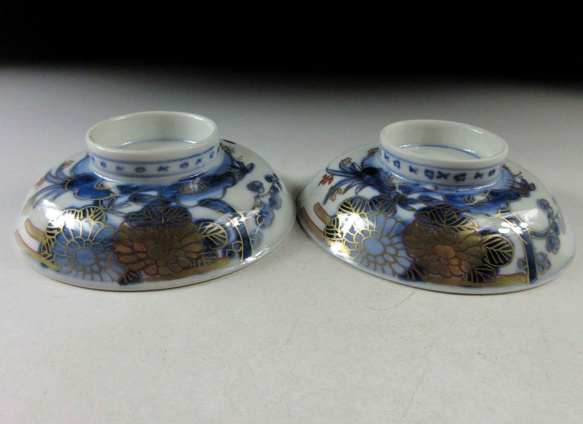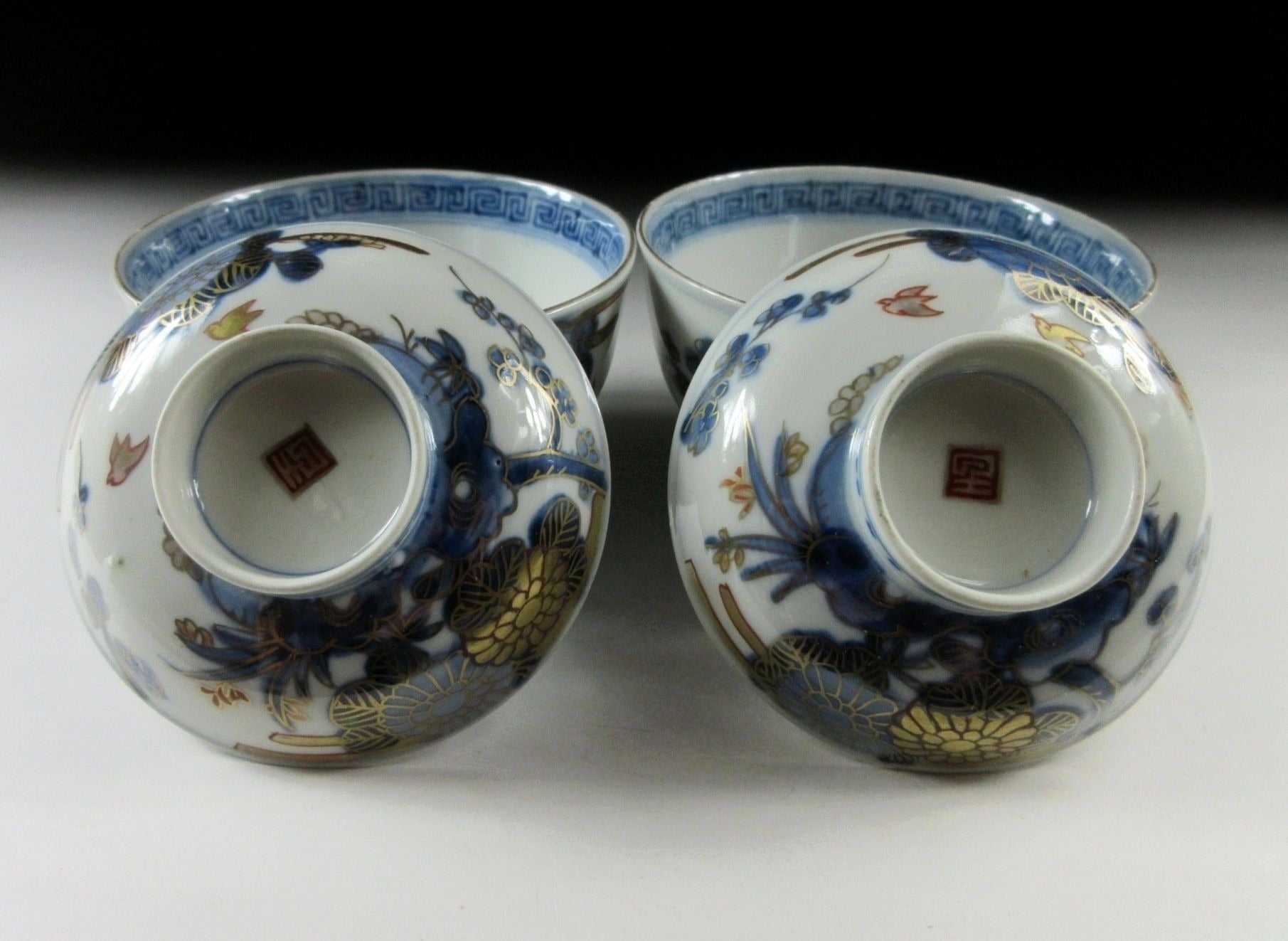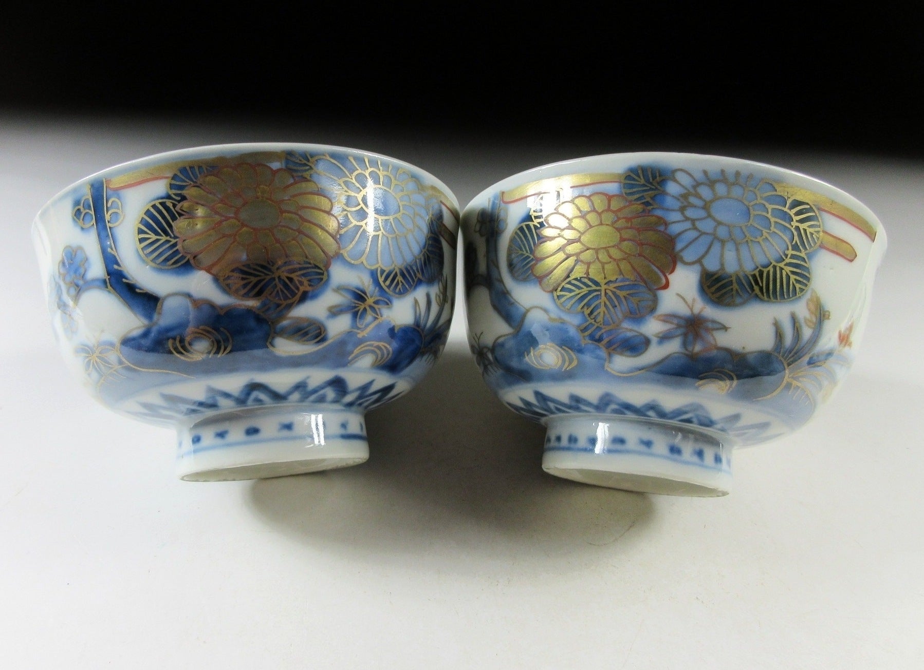 This listing is for a pair of antique Imari-ware lidded bowls made around 100-120 years ago. They are hand-painted and each bowl features chrysanthemums, birds and irises over a milky white base. The design also incorporates the three friends of winter. The three friends of winter are ume, bamboo and matsu pine. They are highly regarded in both Japan and China as they do not wither against the cold of winter, and are frequently depicted on pottery, paintings and textiles. Each bowl comes with a matching lid to keep the contents warmer for longer. An Imari mark can be found on the lid of each bowl.