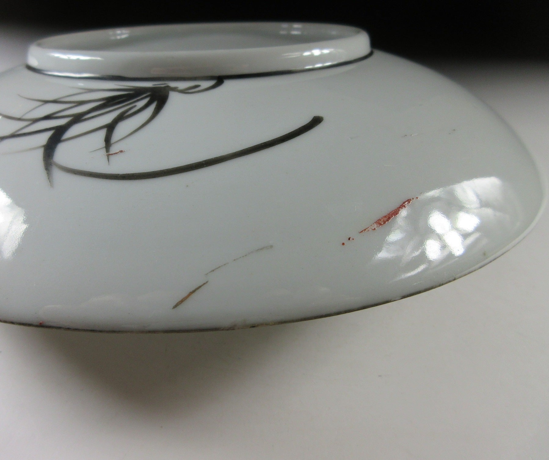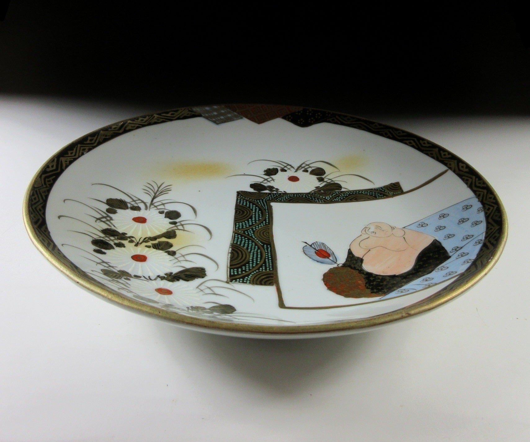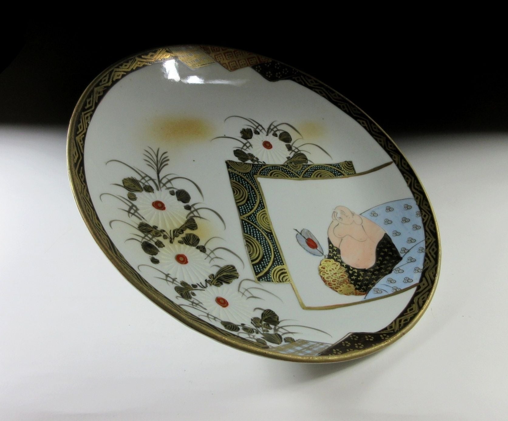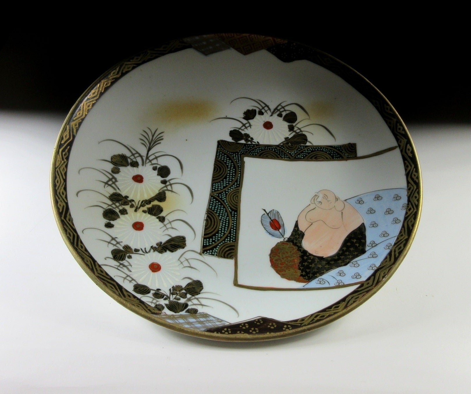 This listing is for a Kutani-ware plate made about 100-120 years ago.  It is hand-painted and decorated with a depiction of Hotei, one of the seven gods of fortune.  He is commonly depicted as bald, smiling, with a big belly, bulging ears, and a large sack slung over his shoulder.  It is in usable condition and would also be right at home in a collection of old porcelain-ware.  The mark on the back reads as ‘Kutani’.