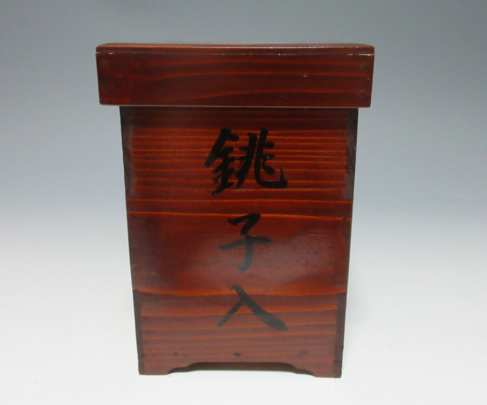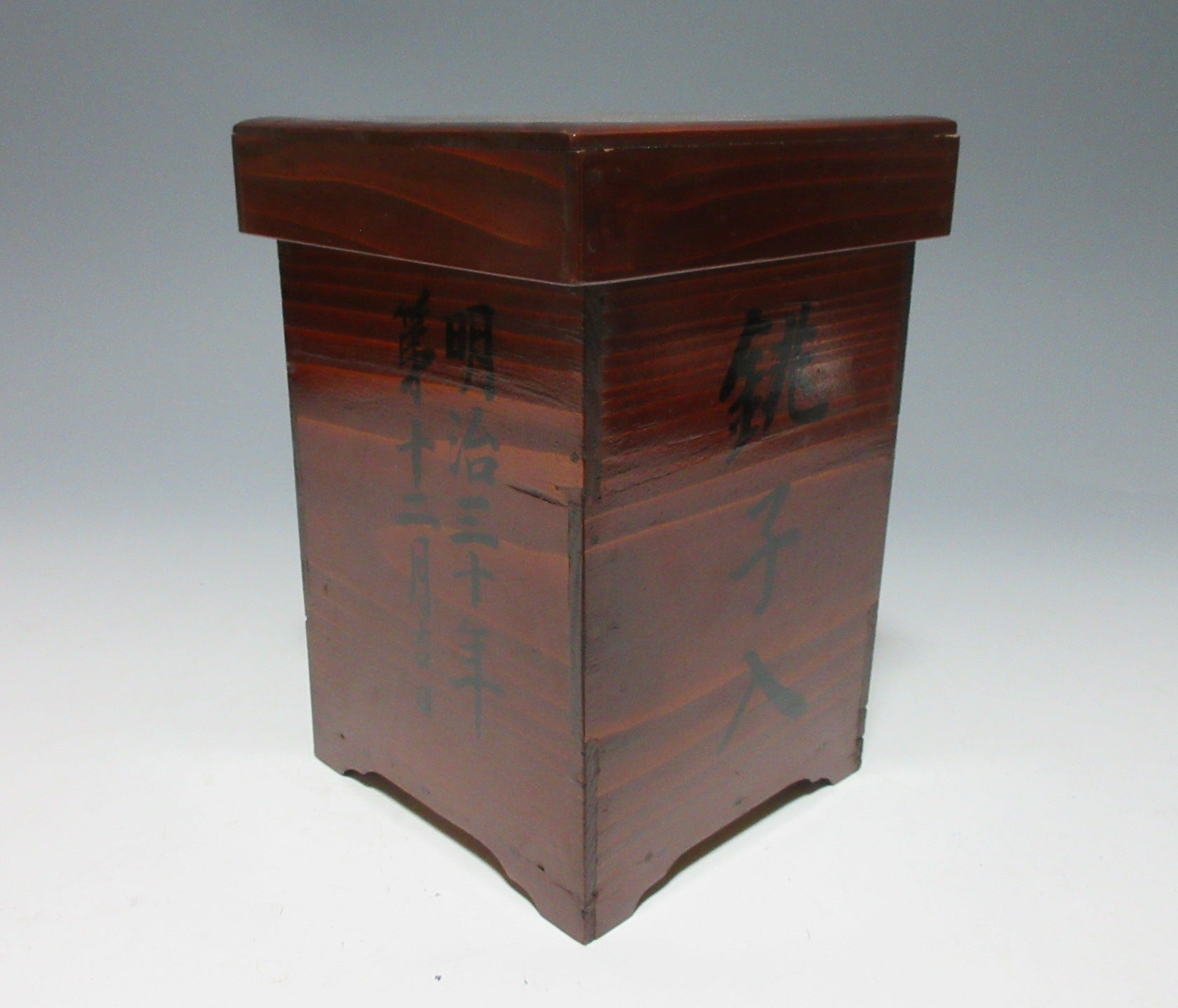 This listing is for a small antique ‘choshi ire’ dated Meiji 30 (1897). A choshi ire is a small box for storing an omiki ritual sake bottle. Omiki is an offering of sake to the gods in order to communicate with them, or to pray for bountiful harvests. The box is made of lacquered wood and has kanji written on each side. The kanji in the very first photo says ‘choshi ire’, the second and third photo reads as ‘omiki’, the left side of the sixth photo includes the date (December, Meiji 30), and the right side of the sixth photo says ‘omiki choshi ire’. This particular box came from an old house in Niigata. It’s still in very usable condition and would make a great piece of décor.