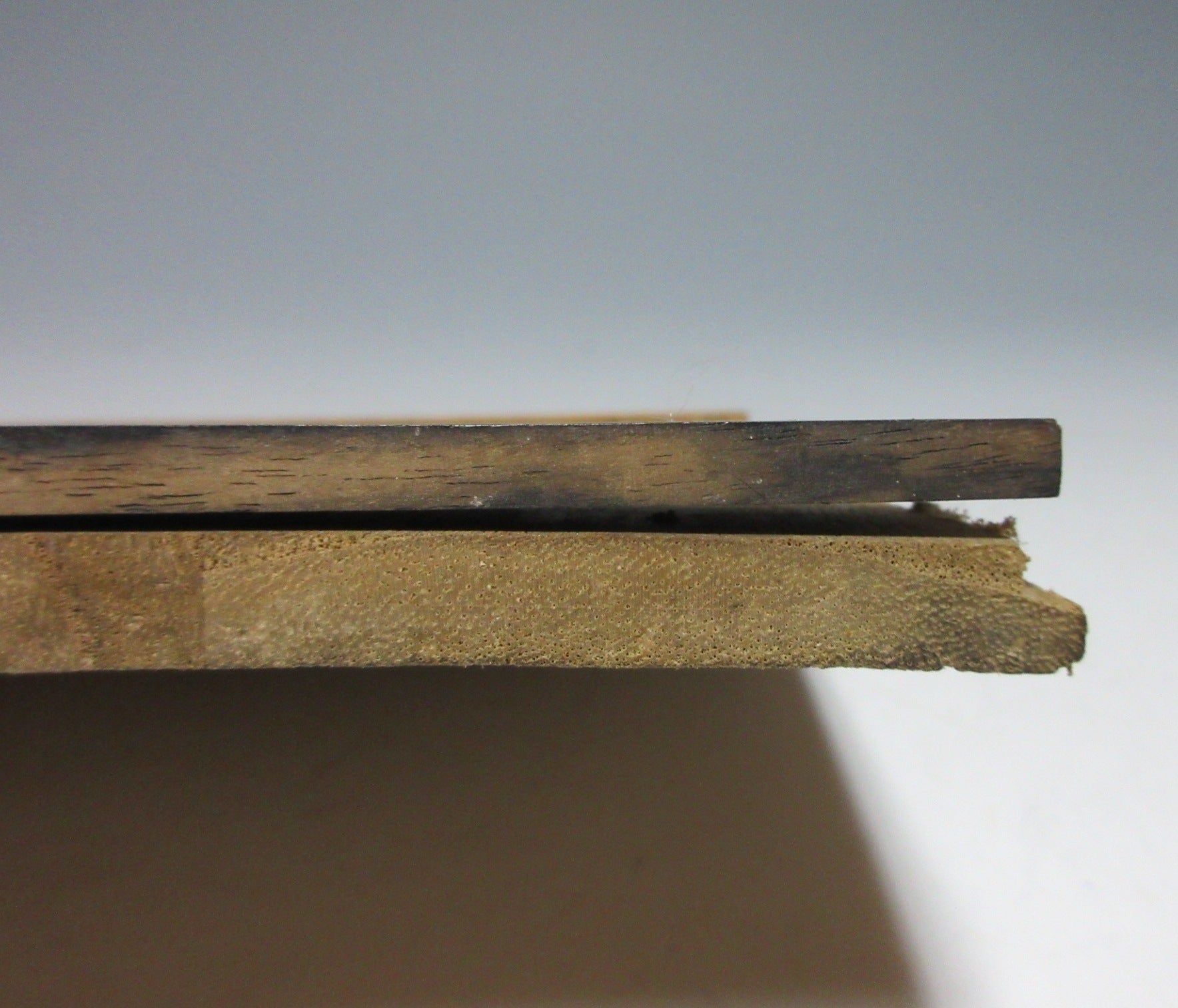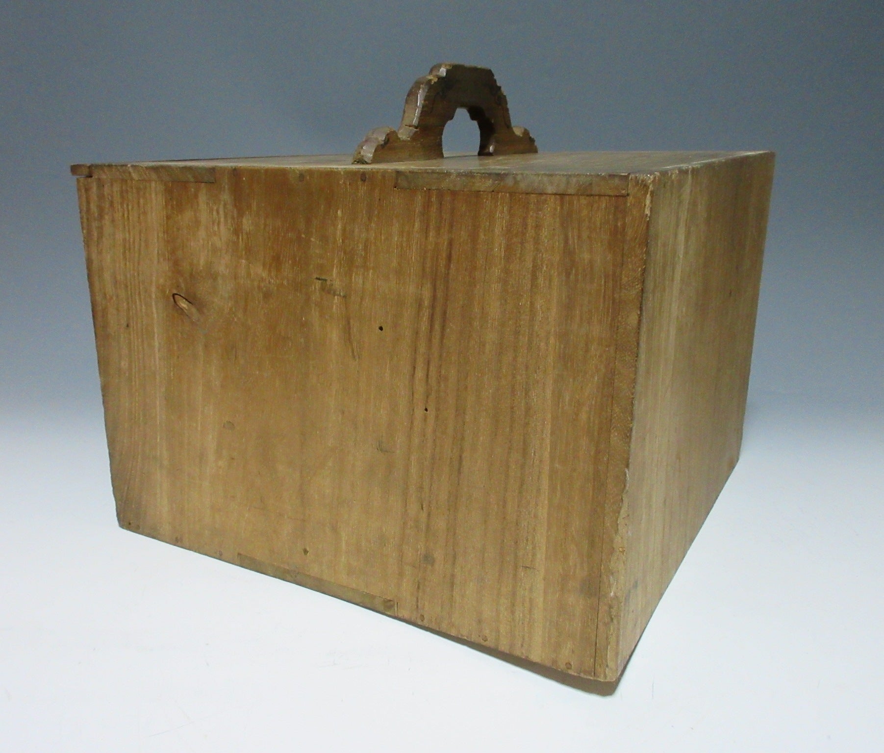 Parts of the lid are loose, the top can come straight off (can be easily fixed with wood glue), and the board on the bottom is loose, however it still slots in and out as it should though. There are a lot of marks/scuffing etc on the exterior and some of the edges are worn and splintered. Most marks/discolouration is on top. There are indentations on the bottom, and an imperfection in the wood. The bottom right corner is slightly loose, and an imperfection in the wood on the interior. There’s also a minor imperfection in the wood on the back and side. The handle is still strong and in good working condition.
