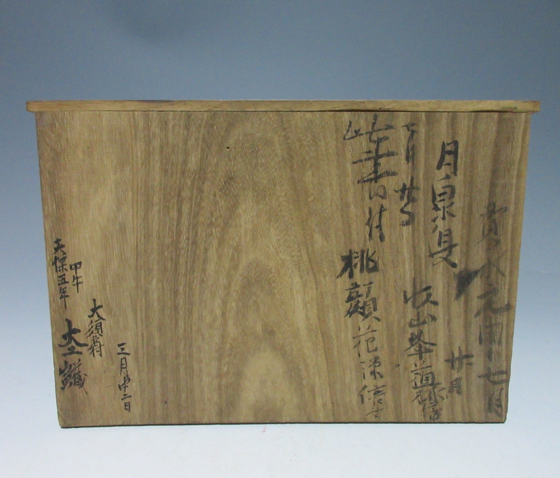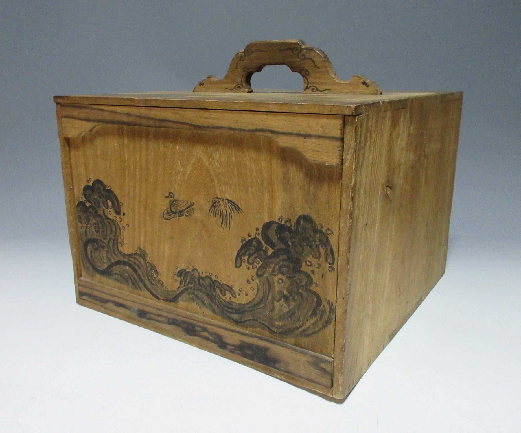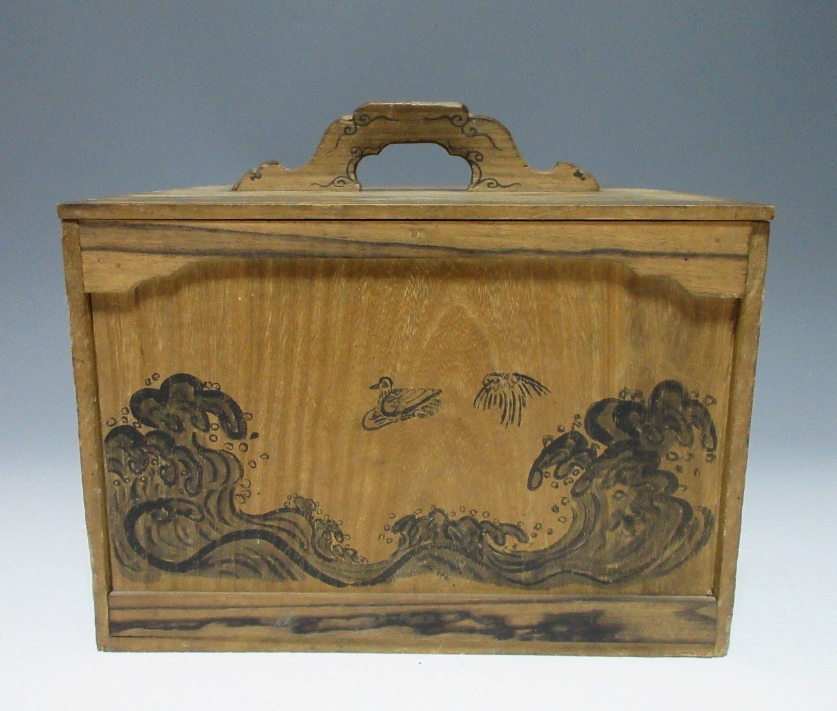This listing is for an antique Tenpo 5 (1834) carry box. The front is hand-painted and decorated with what appears to be plovers and crashing waves. Two strips of wood on the lid are made of persimmon wood, and the handle is also decorated with a pattern of thin lines. There is writing on the lid interior, however it’s very difficult to decipher. We could read Tenpo 5, and there is some kind of reference to a carpenter and ‘night lantern’. This item is quite ample in size and could be used to storage jubako and the like. It would also make a great display item. Please read below in regards to its condition.