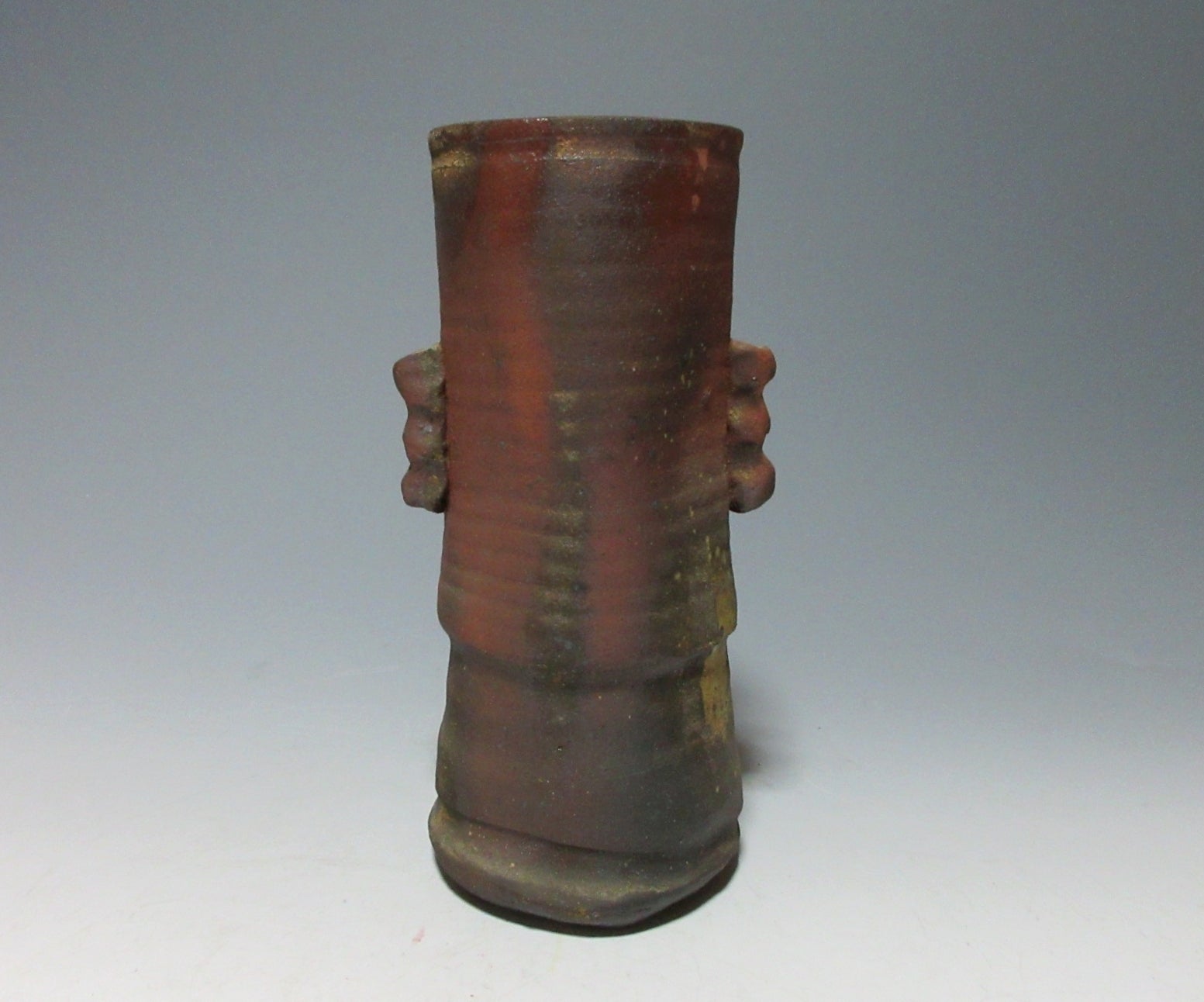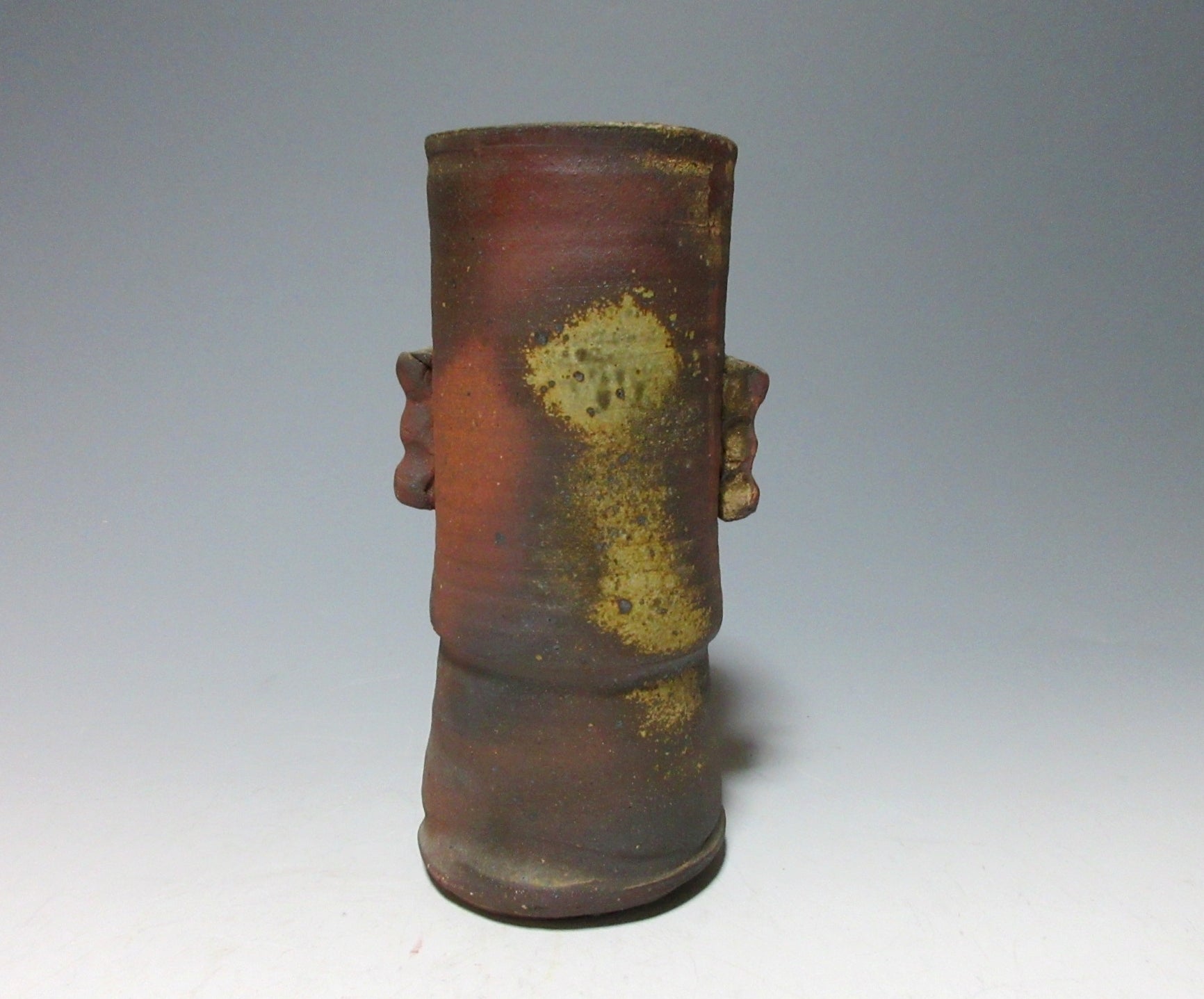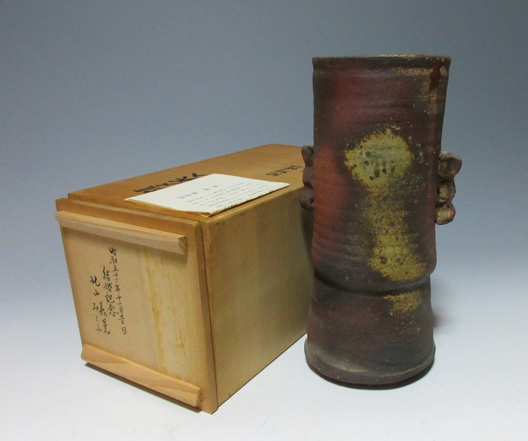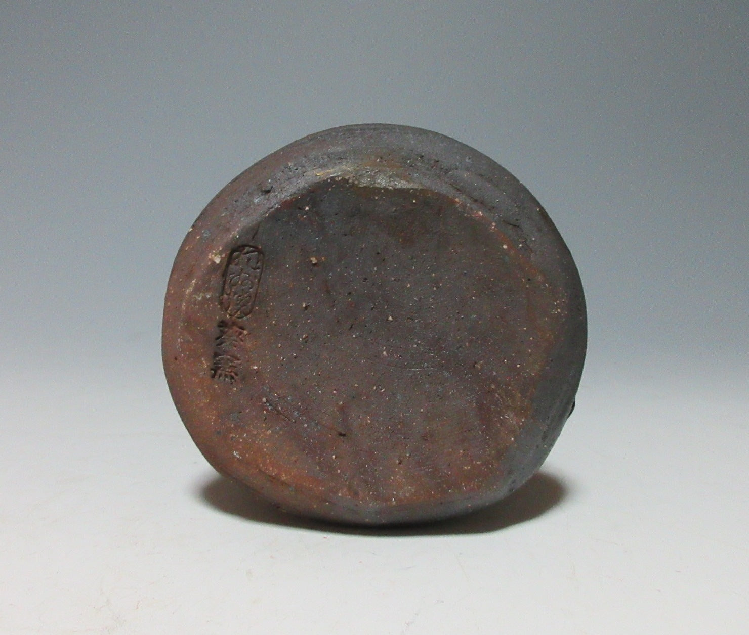 This listing is for a Kishu-ware vase made around 40 years ago by Aoi Gama. It is wood-fired and has an appearance similar to Bizen-ware, and it features small handles on either side. The opening is wide enough to accommodate a small bunch of flowers, though being a tea vase its better suited to a more simple arrangement. The stamp of the kiln can be found on the bottom, and it comes with its original signed wooden storage box. It also comes with a Japanese language profile paper.
