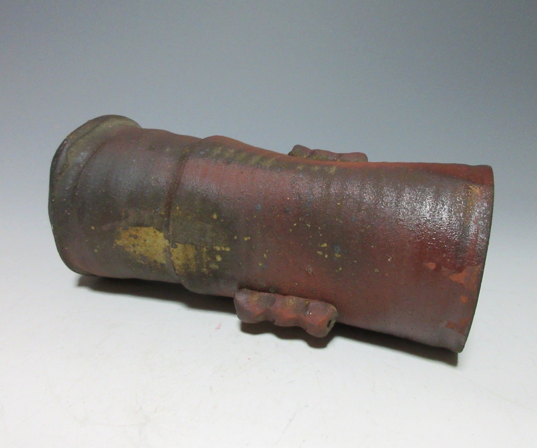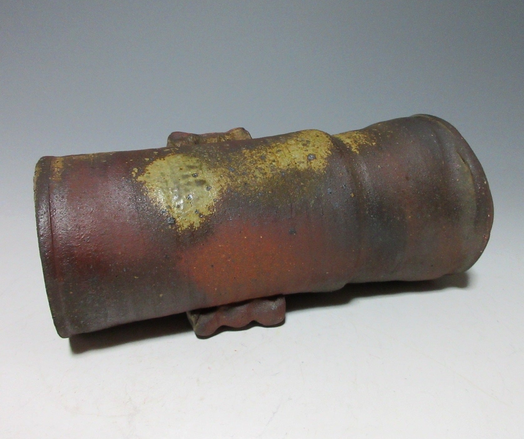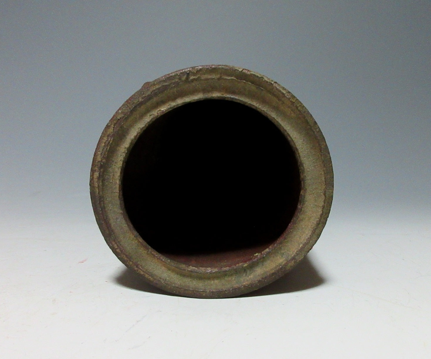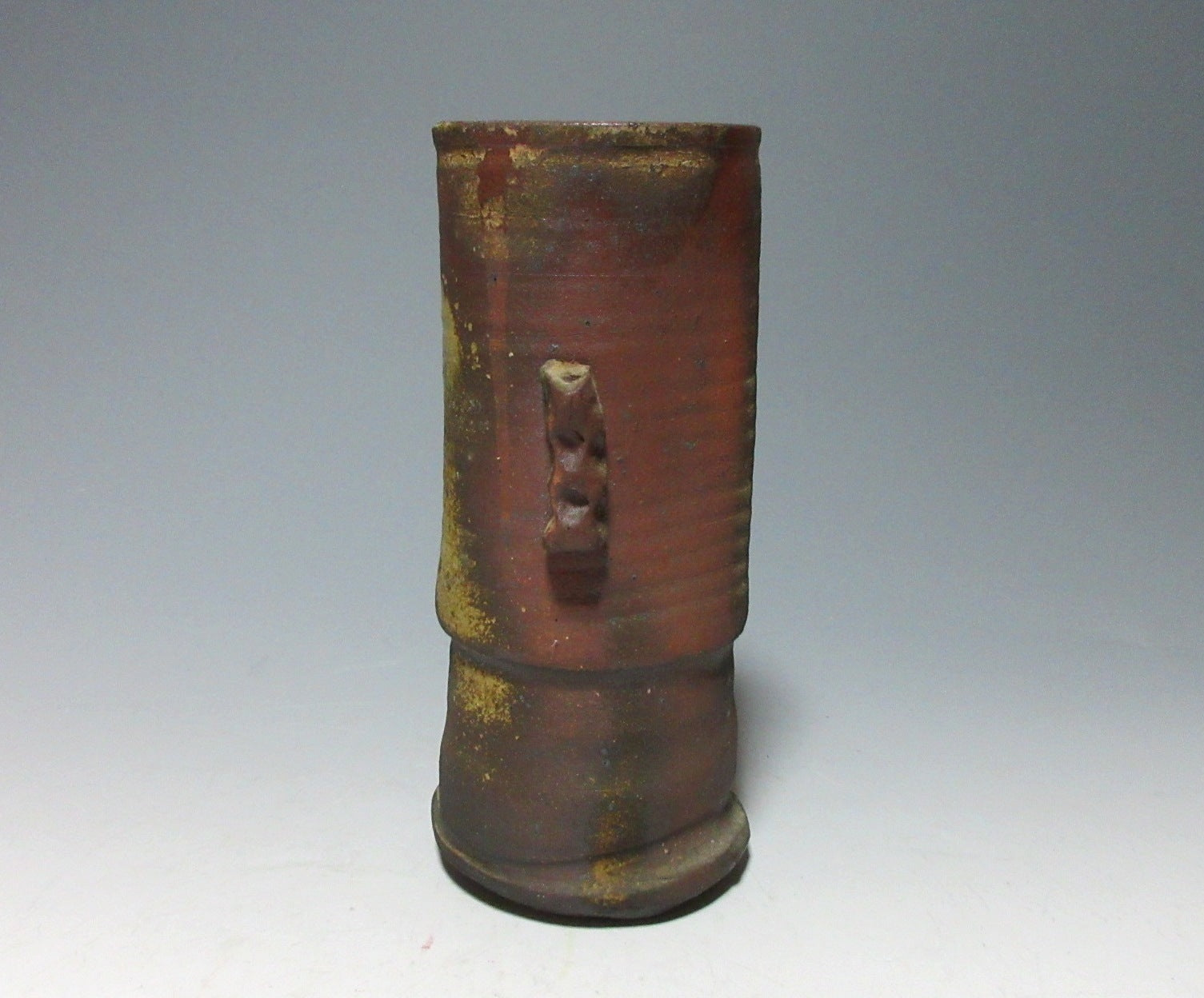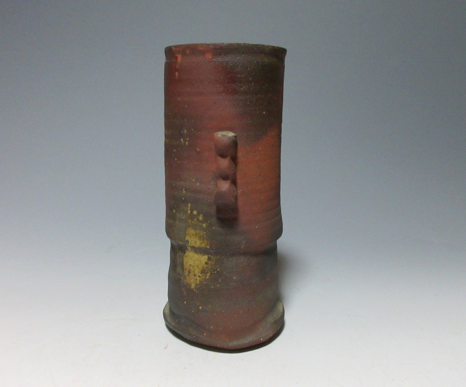 This listing is for a Kishu-ware vase made around 40 years ago by Aoi Gama. It is wood-fired and has an appearance similar to Bizen-ware, and it features small handles on either side. The opening is wide enough to accommodate a small bunch of flowers, though being a tea vase its better suited to a more simple arrangement. The stamp of the kiln can be found on the bottom, and it comes with its original signed wooden storage box. It also comes with a Japanese language profile paper.