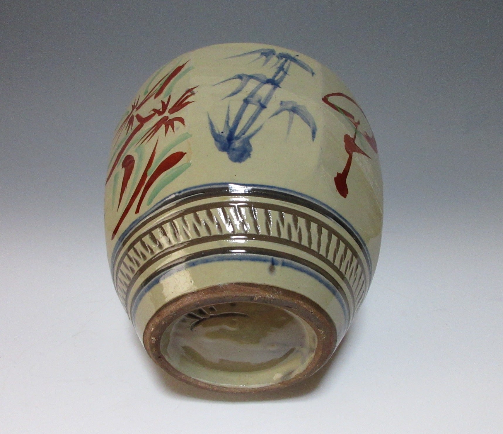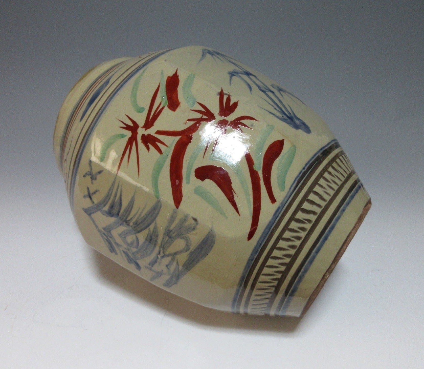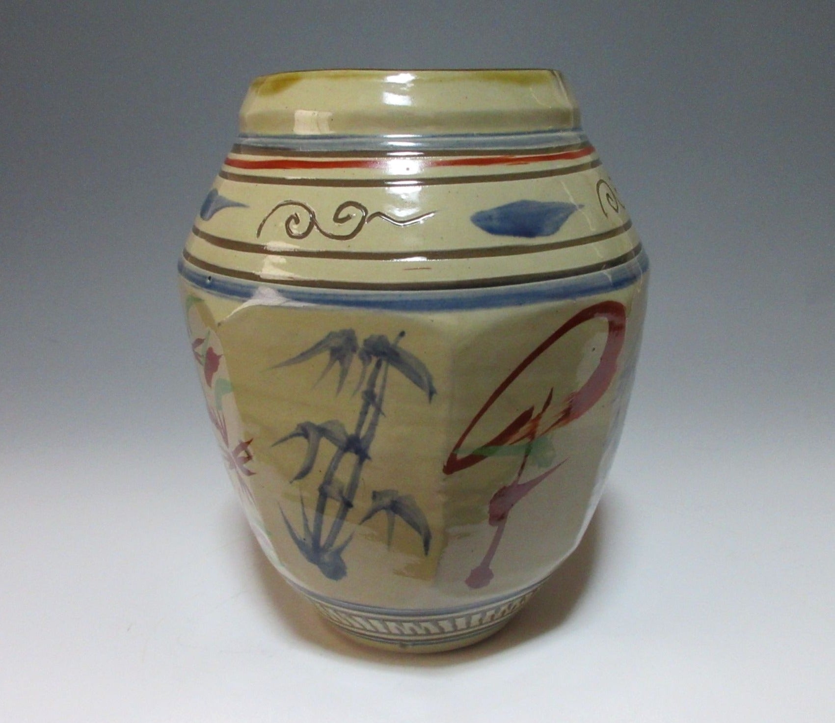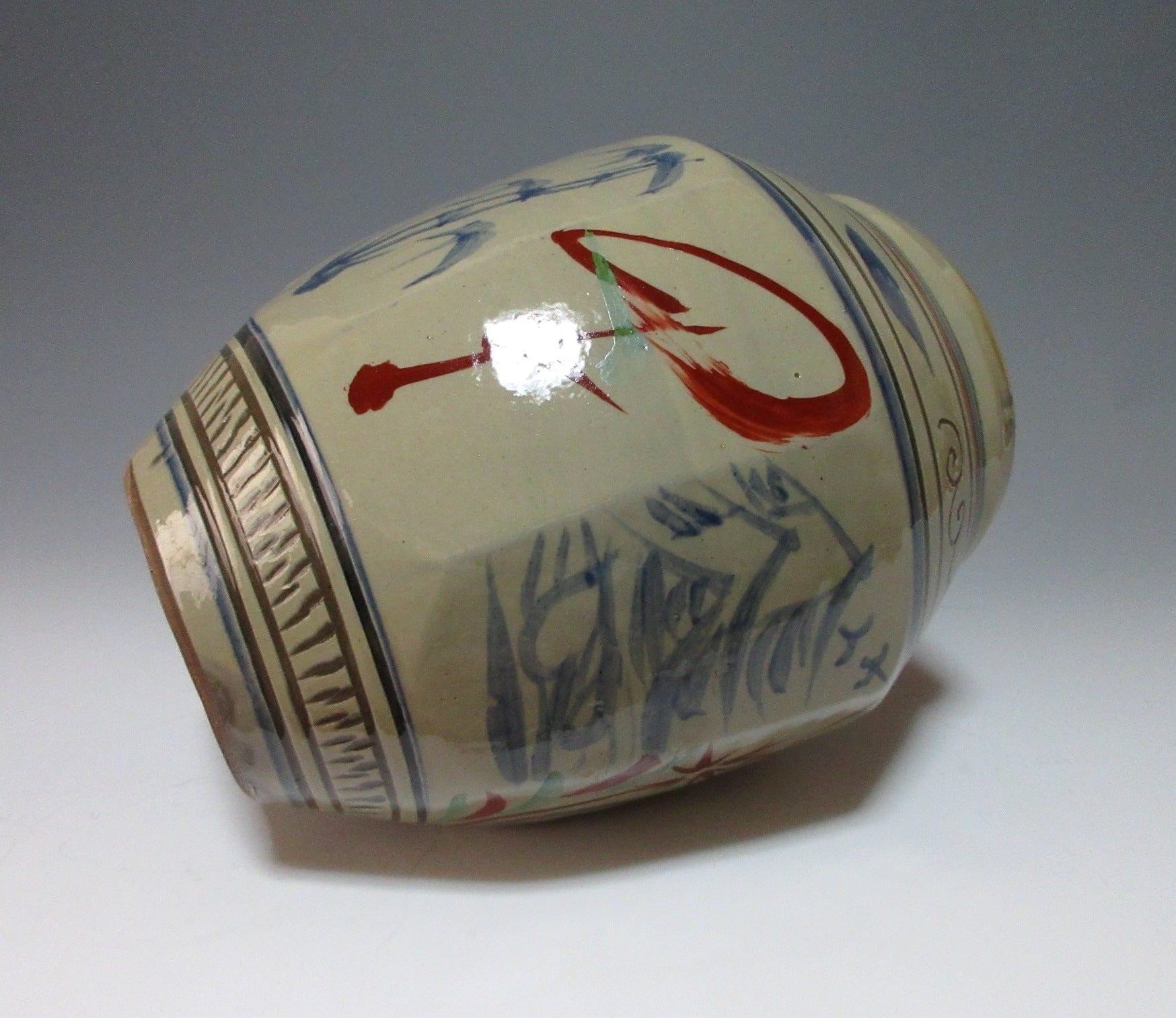 This listing is for a large Tsuboya-ware vase made around 40 years ago by distinguished potter, Aragaki Eisaburo VI. It is wheel-thrown and decorated with blue, red and green Okinawan flower motifs over cream coloured slip. The decoration also includes patterns that have been incised into the surface, and the sides have been bevelled with a potter’s tool. The opening is wide enough to accommodate a decent sized bunch of flowers, and the signature of the potter can be found on the bottom.