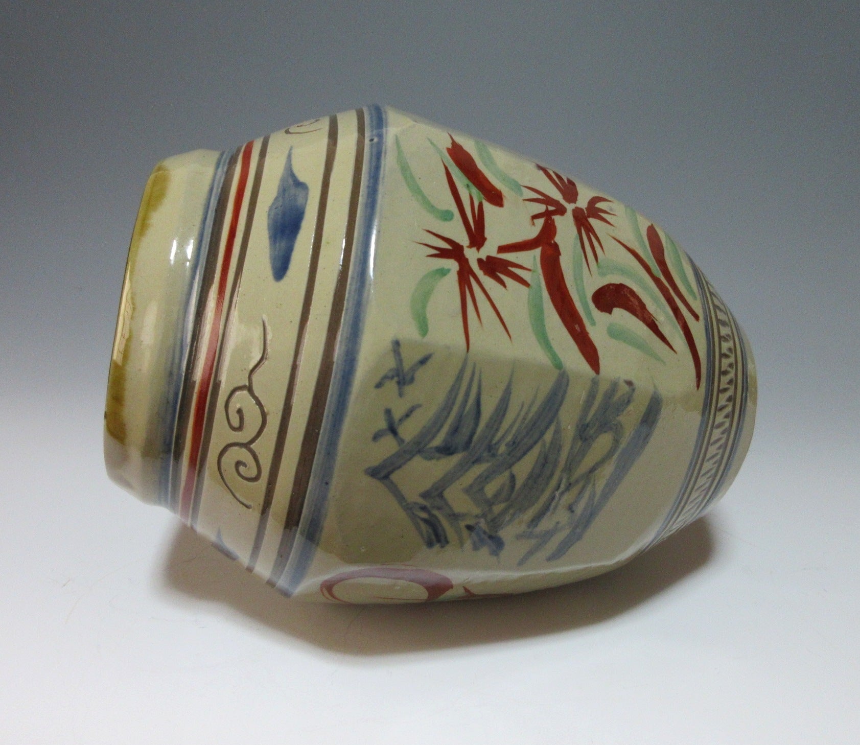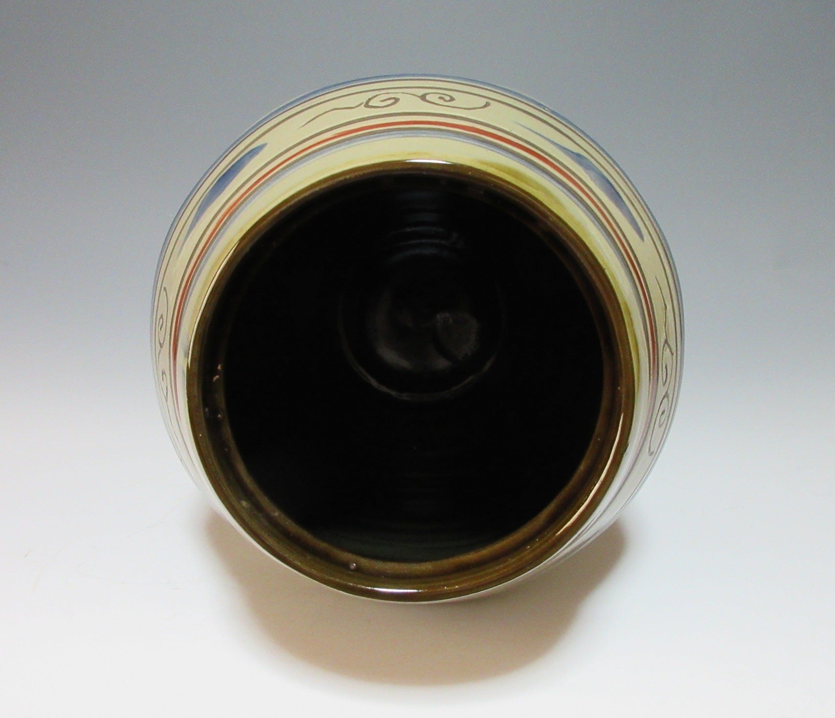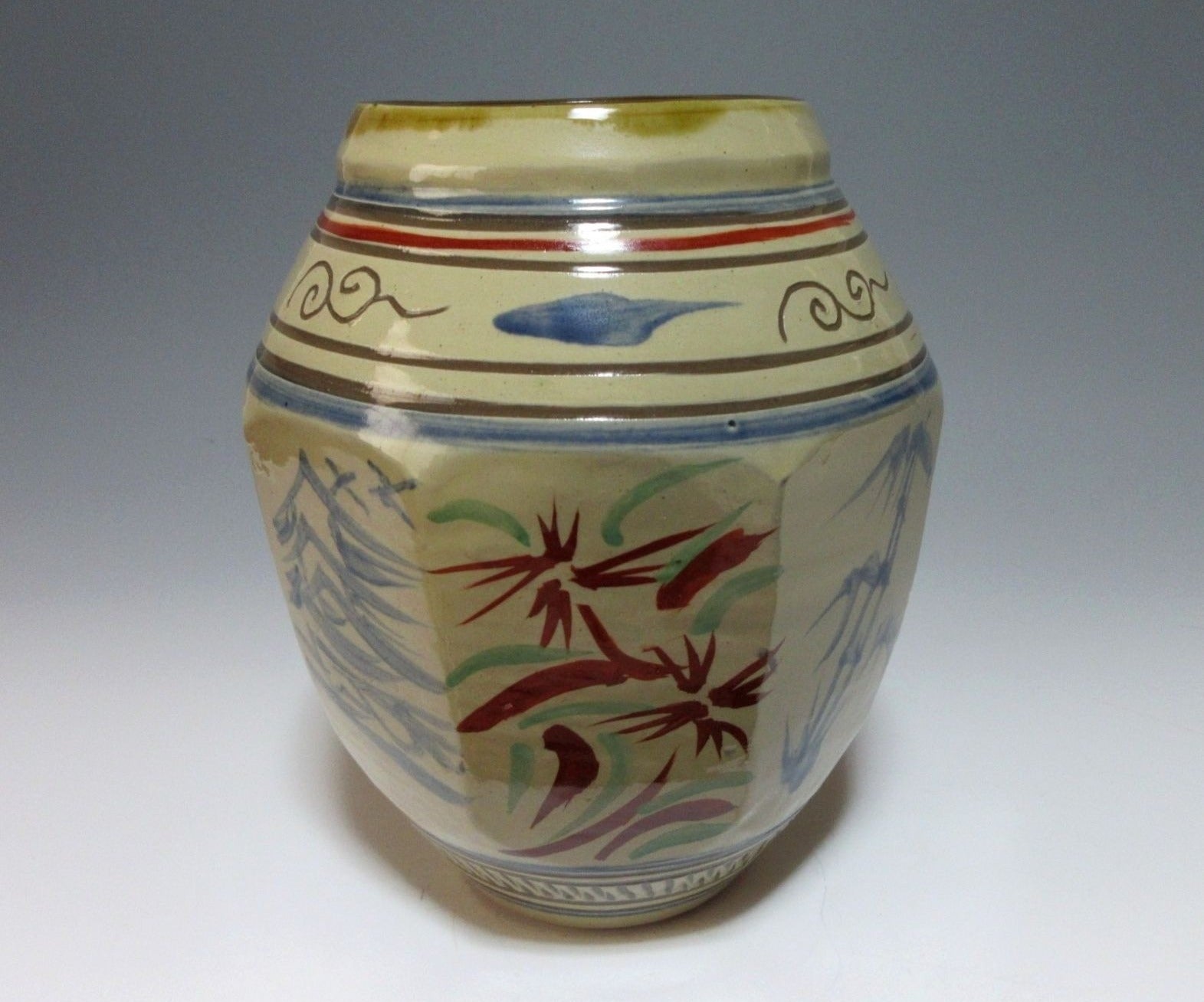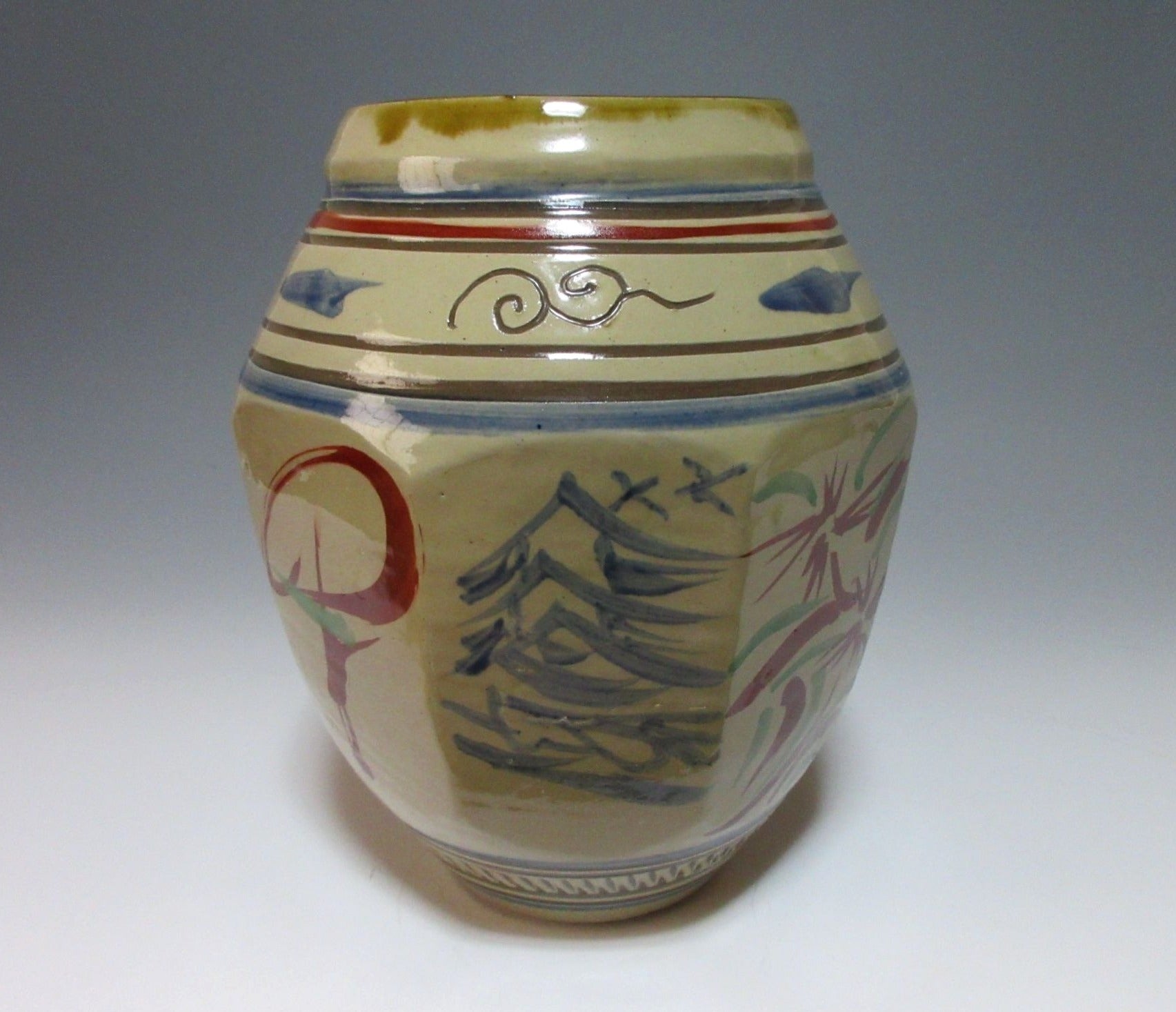 This listing is for a large Tsuboya-ware vase made around 40 years ago by distinguished potter, Aragaki Eisaburo VI. It is wheel-thrown and decorated with blue, red and green Okinawan flower motifs over cream coloured slip. The decoration also includes patterns that have been incised into the surface, and the sides have been bevelled with a potter’s tool. The opening is wide enough to accommodate a decent sized bunch of flowers, and the signature of the potter can be found on the bottom.