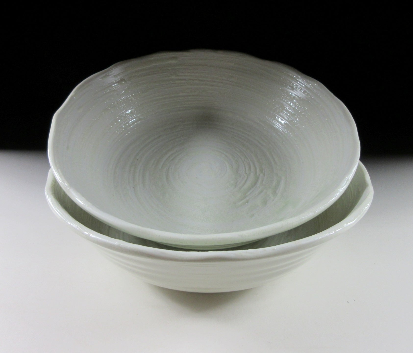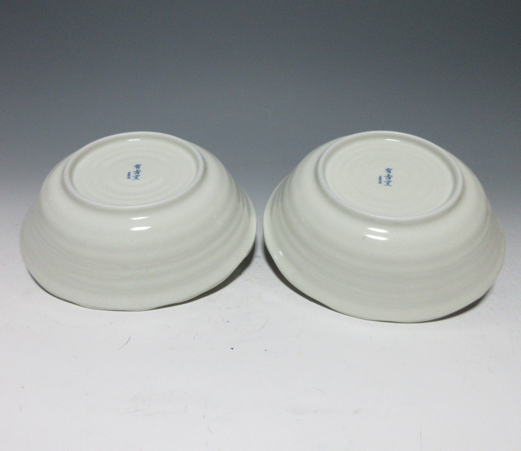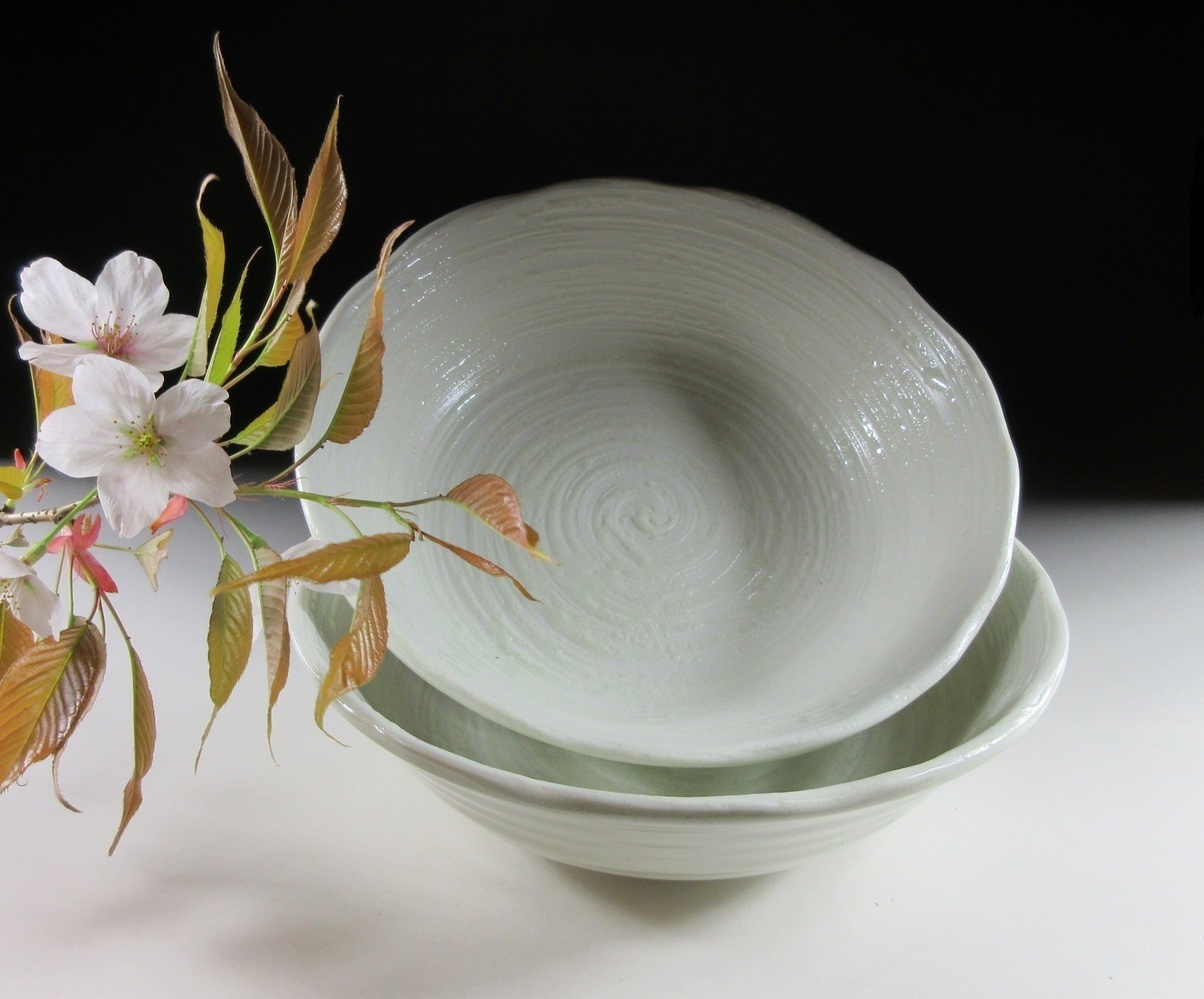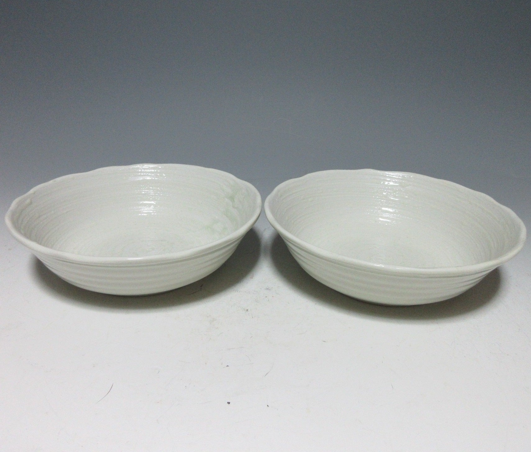 This listing is for a pair of Mino-ware serving bowls made around 20 years ago by Ariko Gama. They are made of stoneware slip and the interior of both bowls is decorated with a raised celadon-coloured swirl pattern. The rims are scalloped and they have a nice deep shape for serving salads and pasta. The signature of the kiln can be found on the bottom of each bowl.