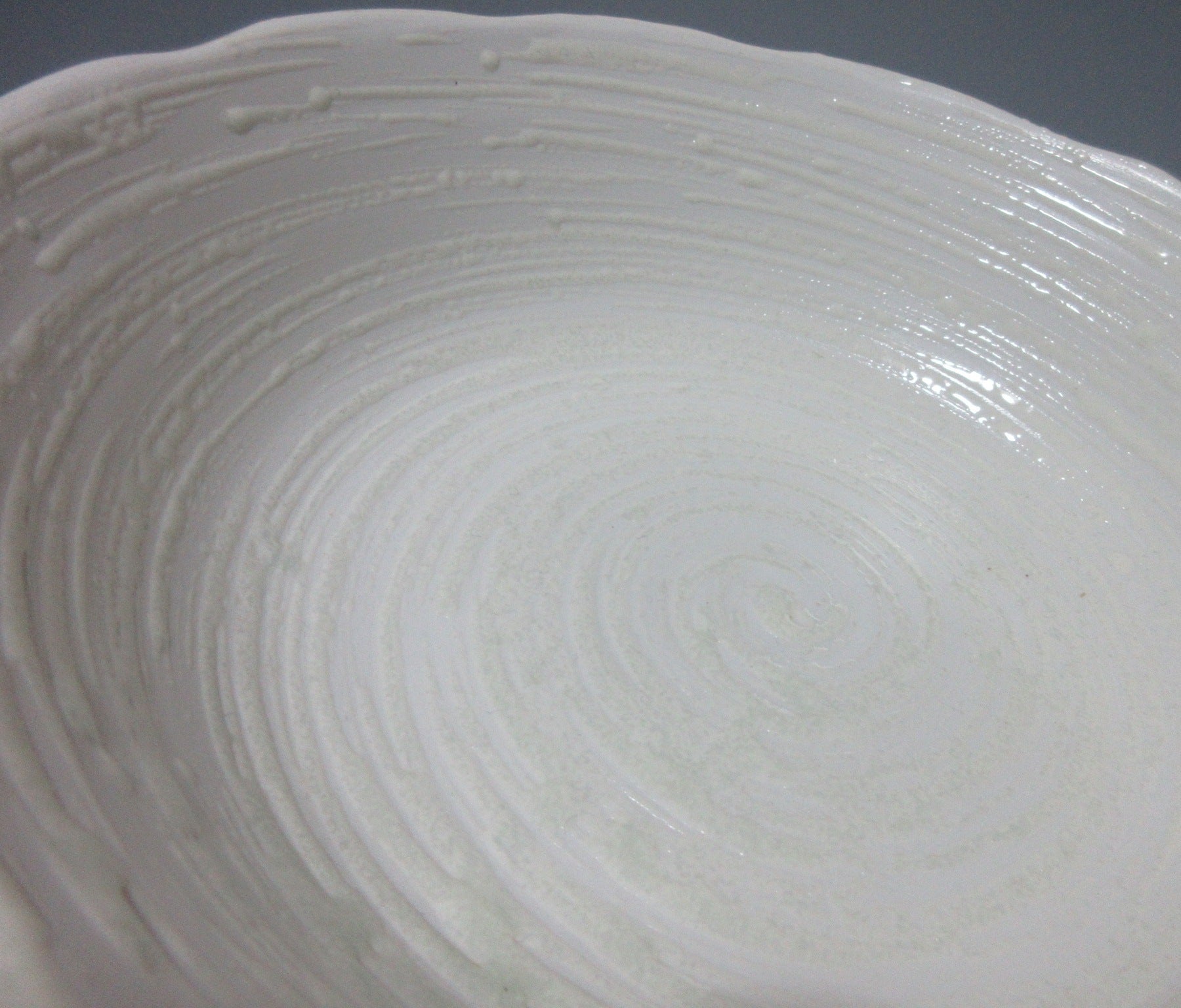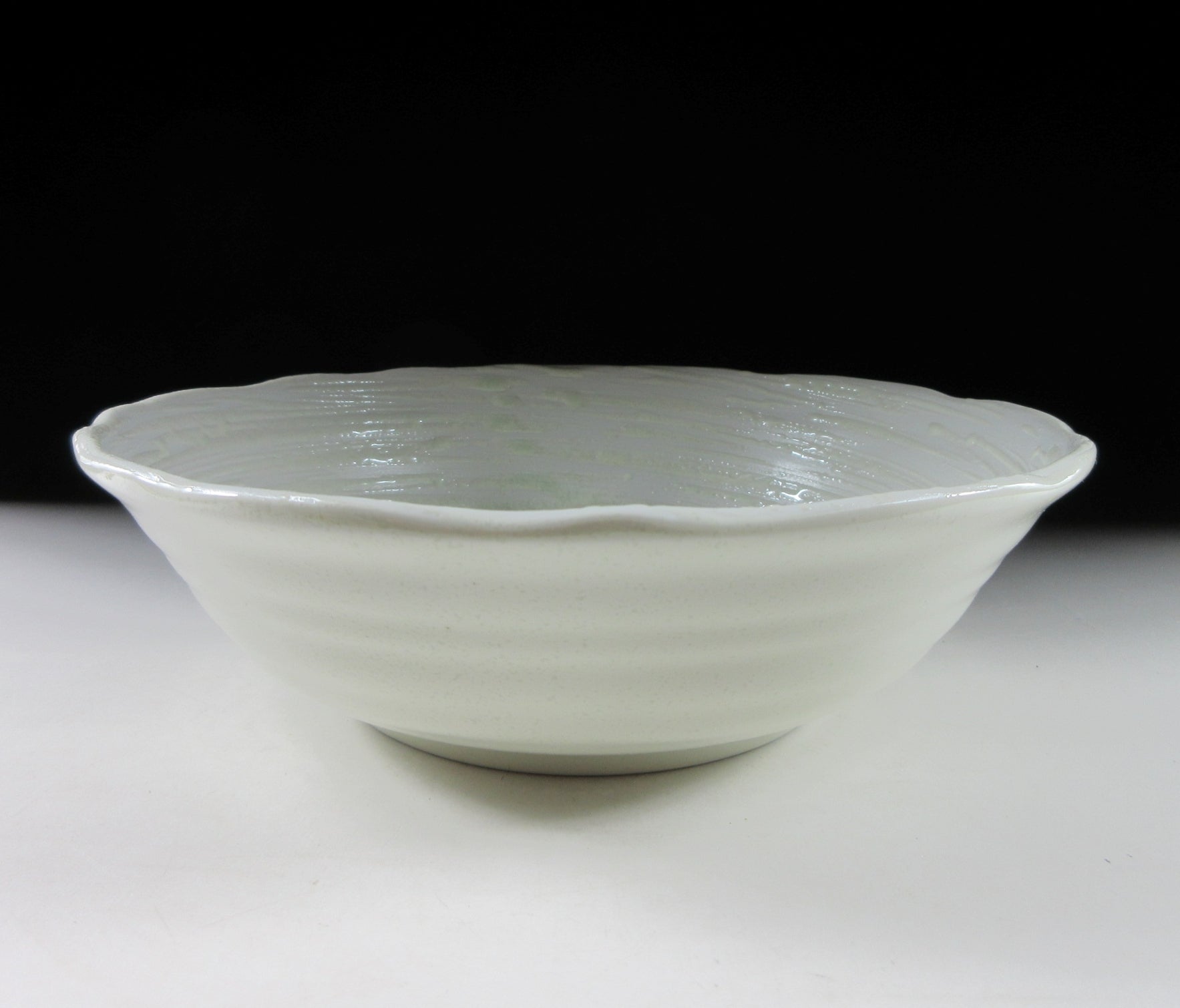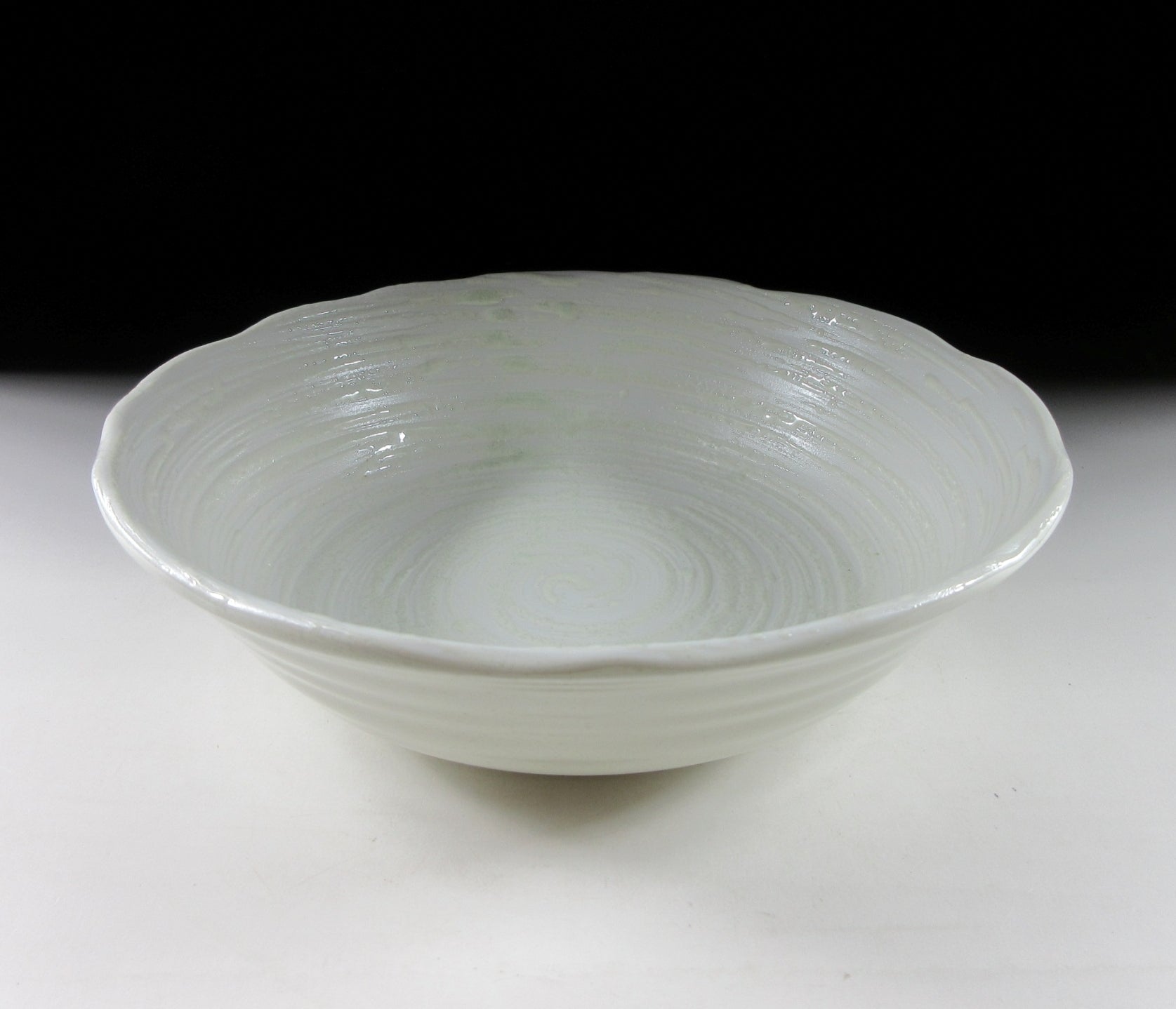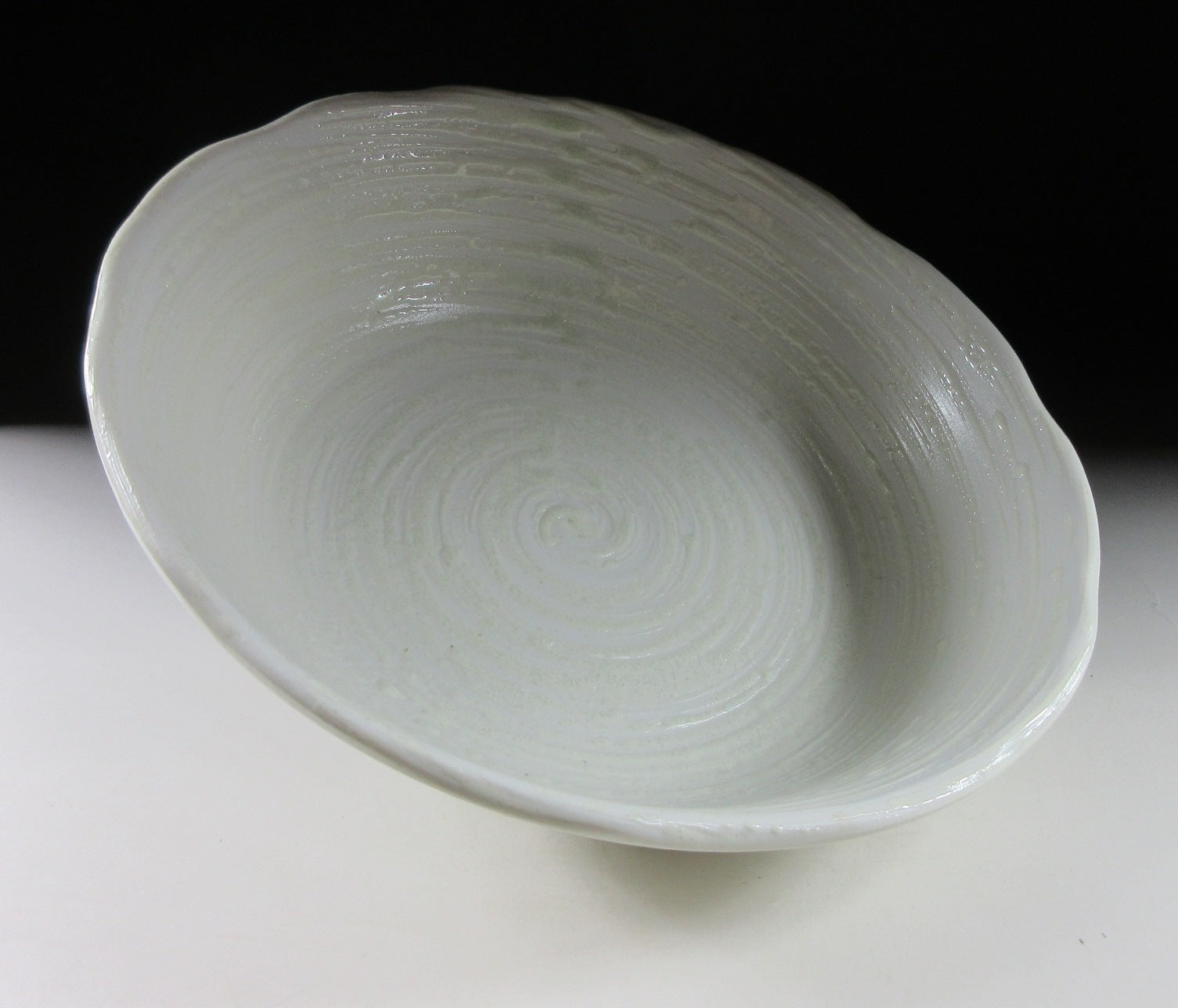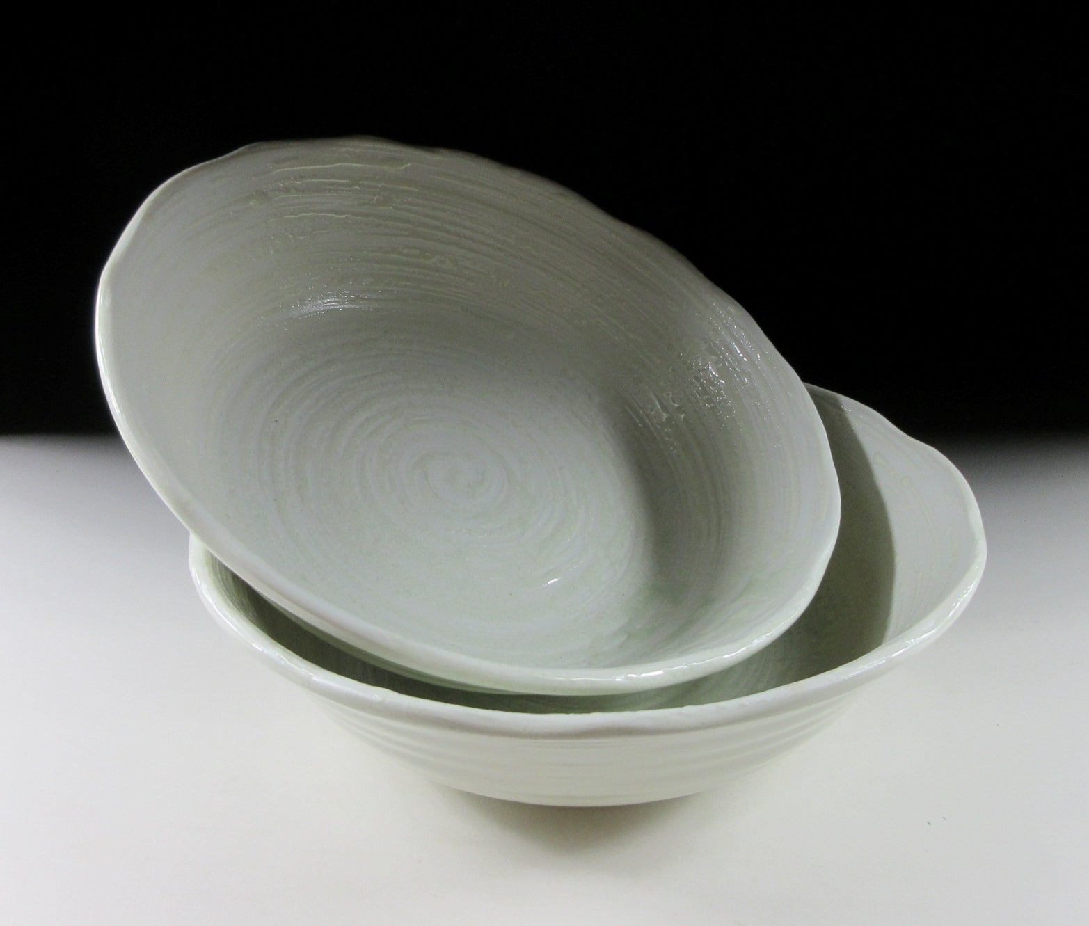This listing is for a pair of Mino-ware serving bowls made around 20 years ago by Ariko Gama. They are made of stoneware slip and the interior of both bowls is decorated with a raised celadon-coloured swirl pattern. The rims are scalloped and they have a nice deep shape for serving salads and pasta. The signature of the kiln can be found on the bottom of each bowl.