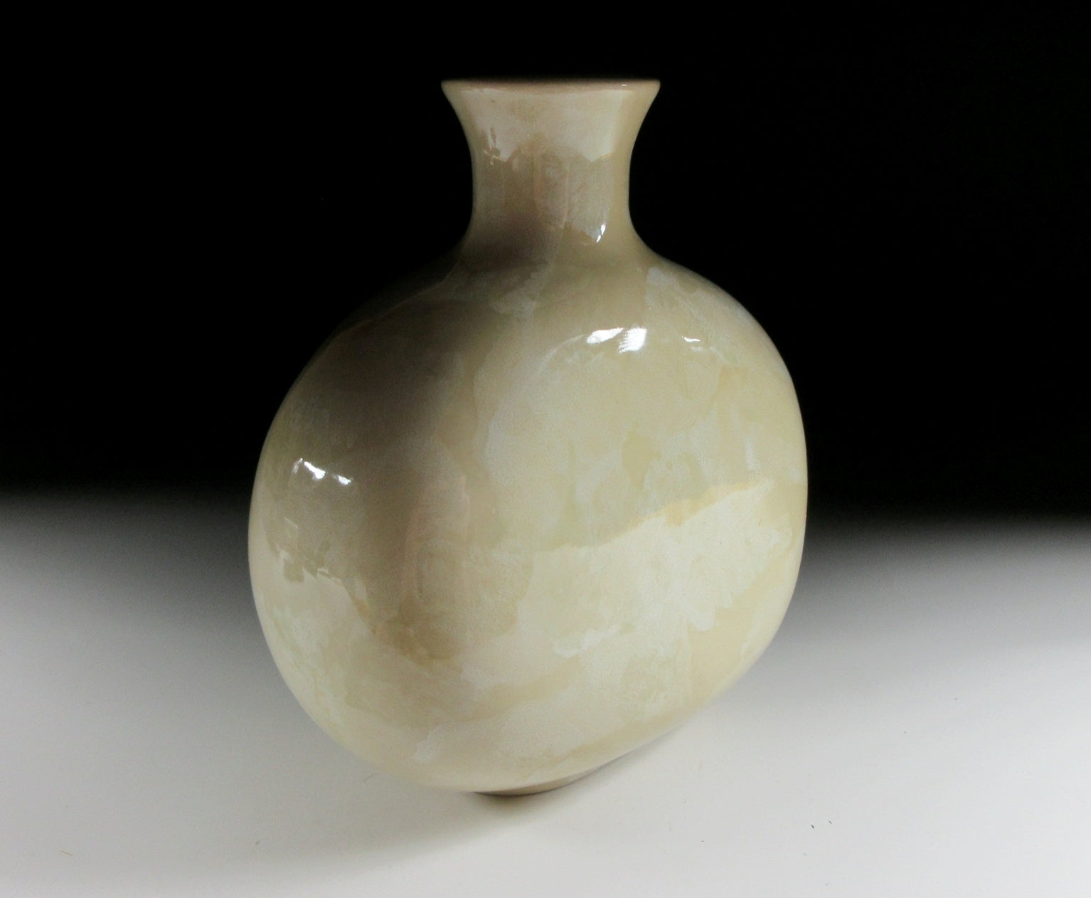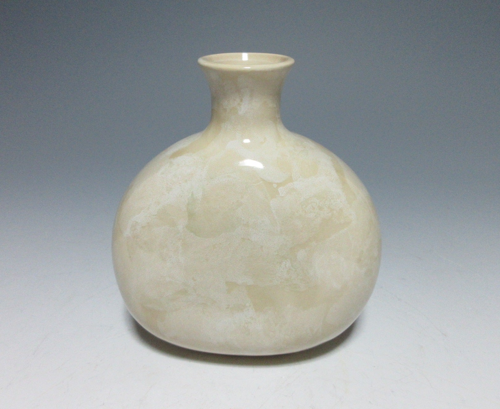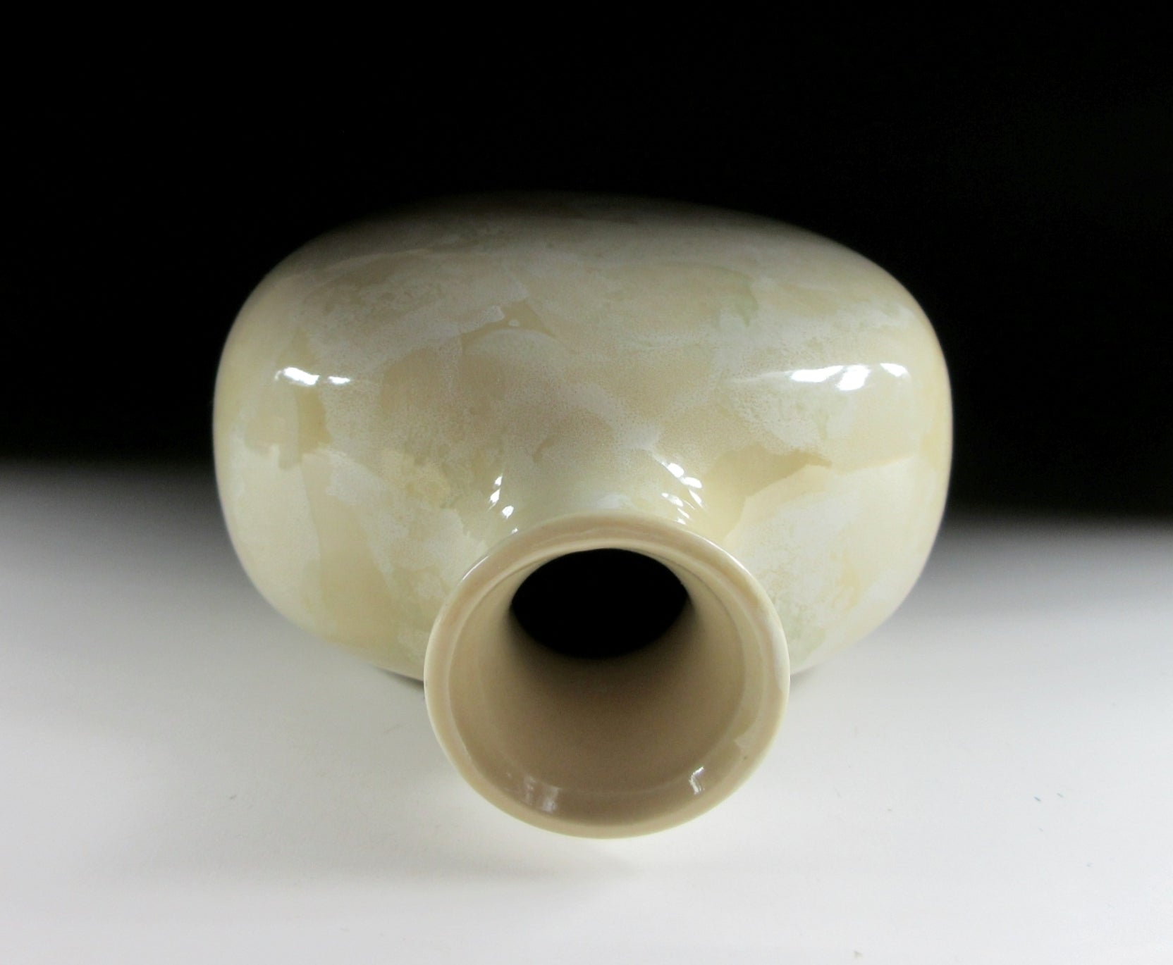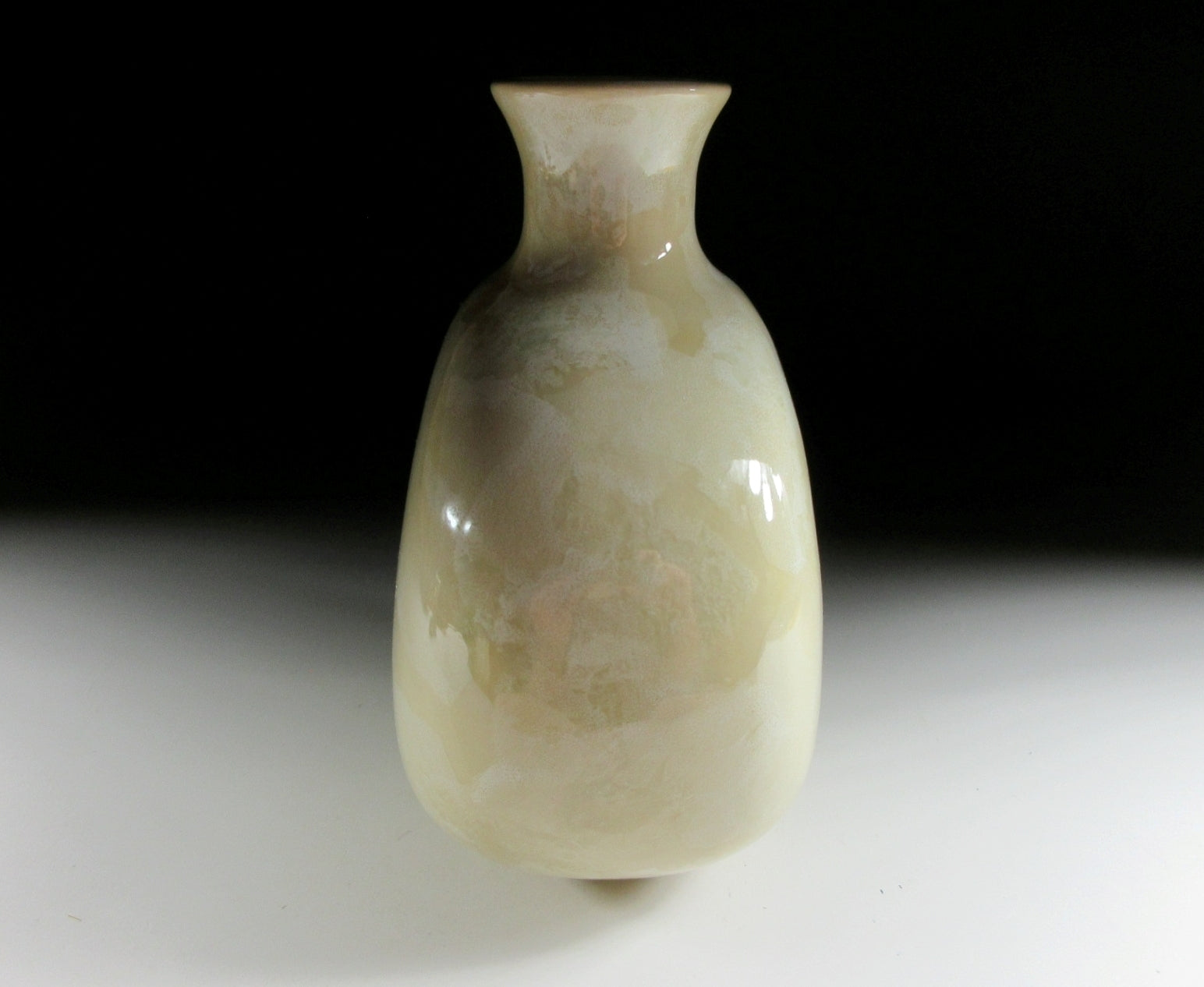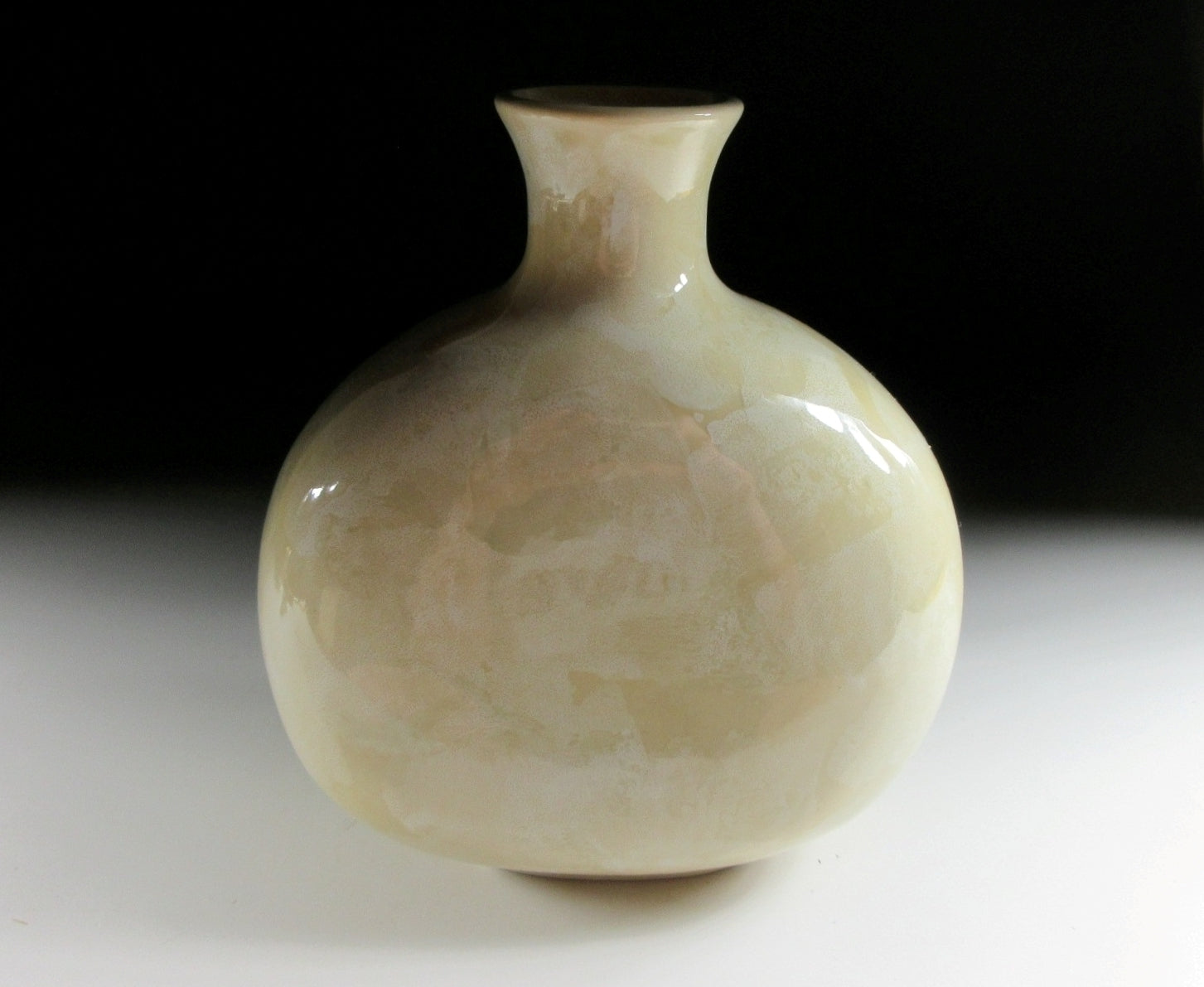 This listing is for an Arita-ware bottle vase made around 20 years ago. It is made of high fired stoneware slip and has a pale yellow marble finish. This piece would work nicely as a vase and would suit a bathroom vanity. The opening is wide enough to accommodate a small arrangement of flowers, and the mark of the kiln can be found on the bottom.