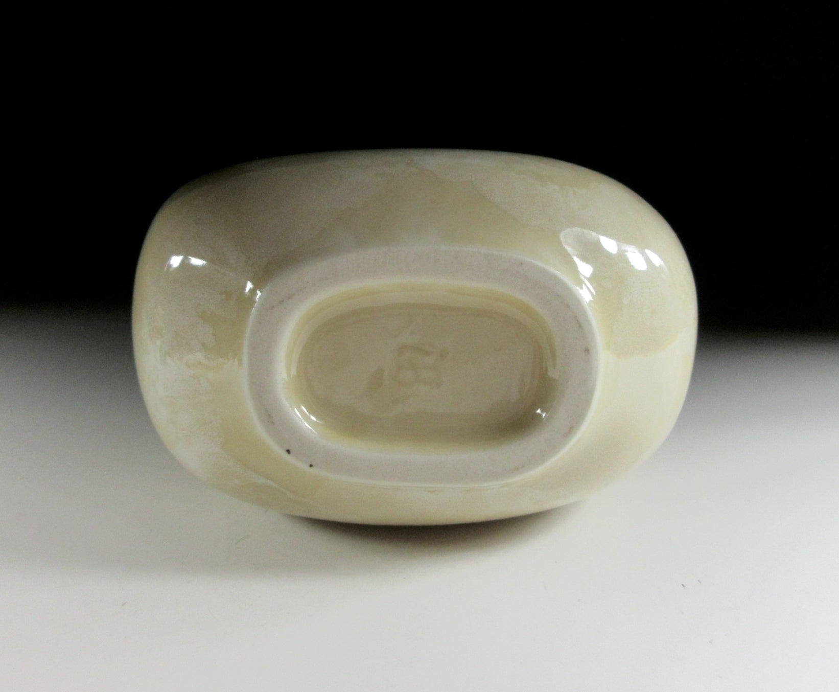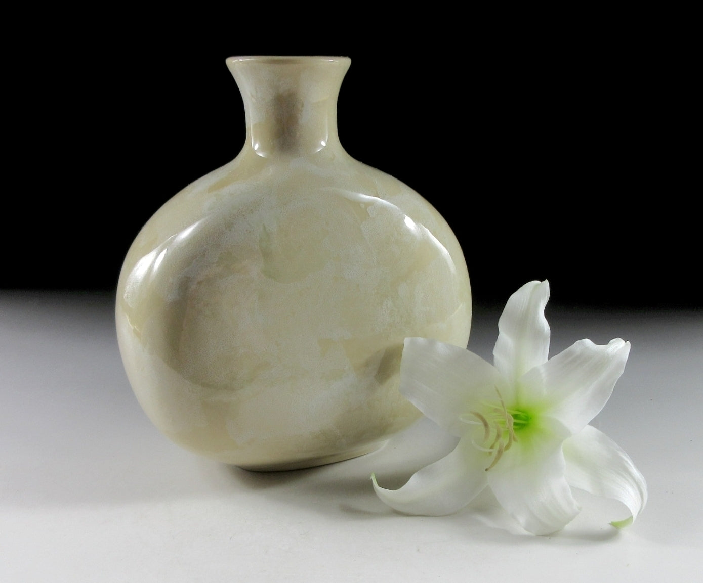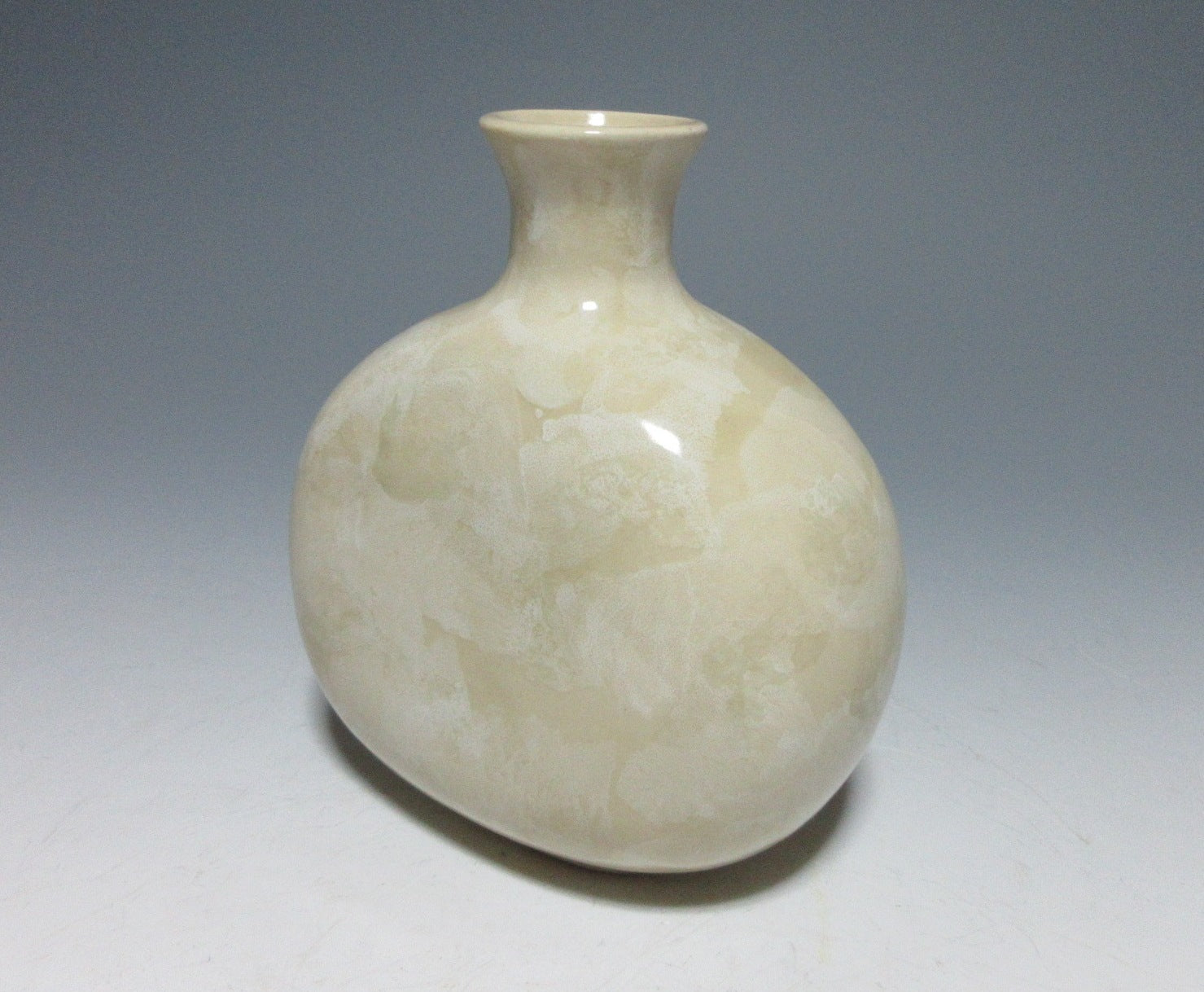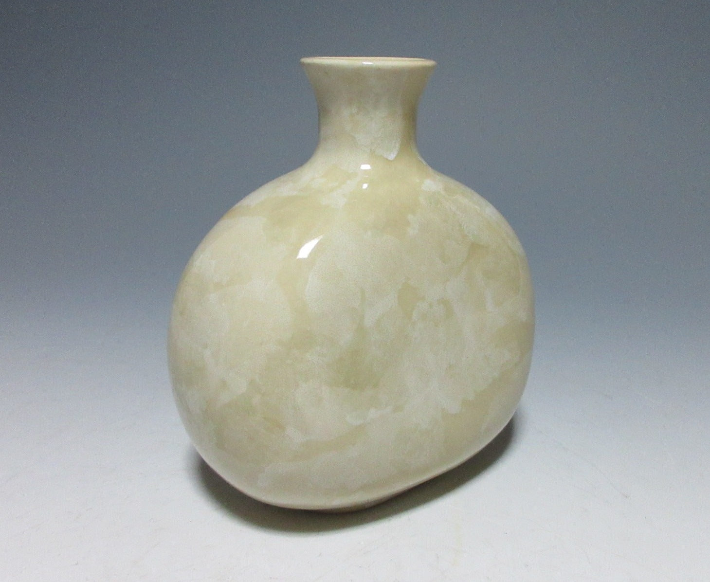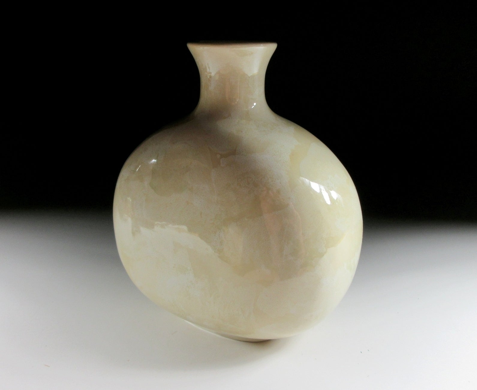This listing is for an Arita-ware bottle vase made around 20 years ago. It is made of high fired stoneware slip and has a pale yellow marble finish. This piece would work nicely as a vase and would suit a bathroom vanity. The opening is wide enough to accommodate a small arrangement of flowers, and the mark of the kiln can be found on the bottom.