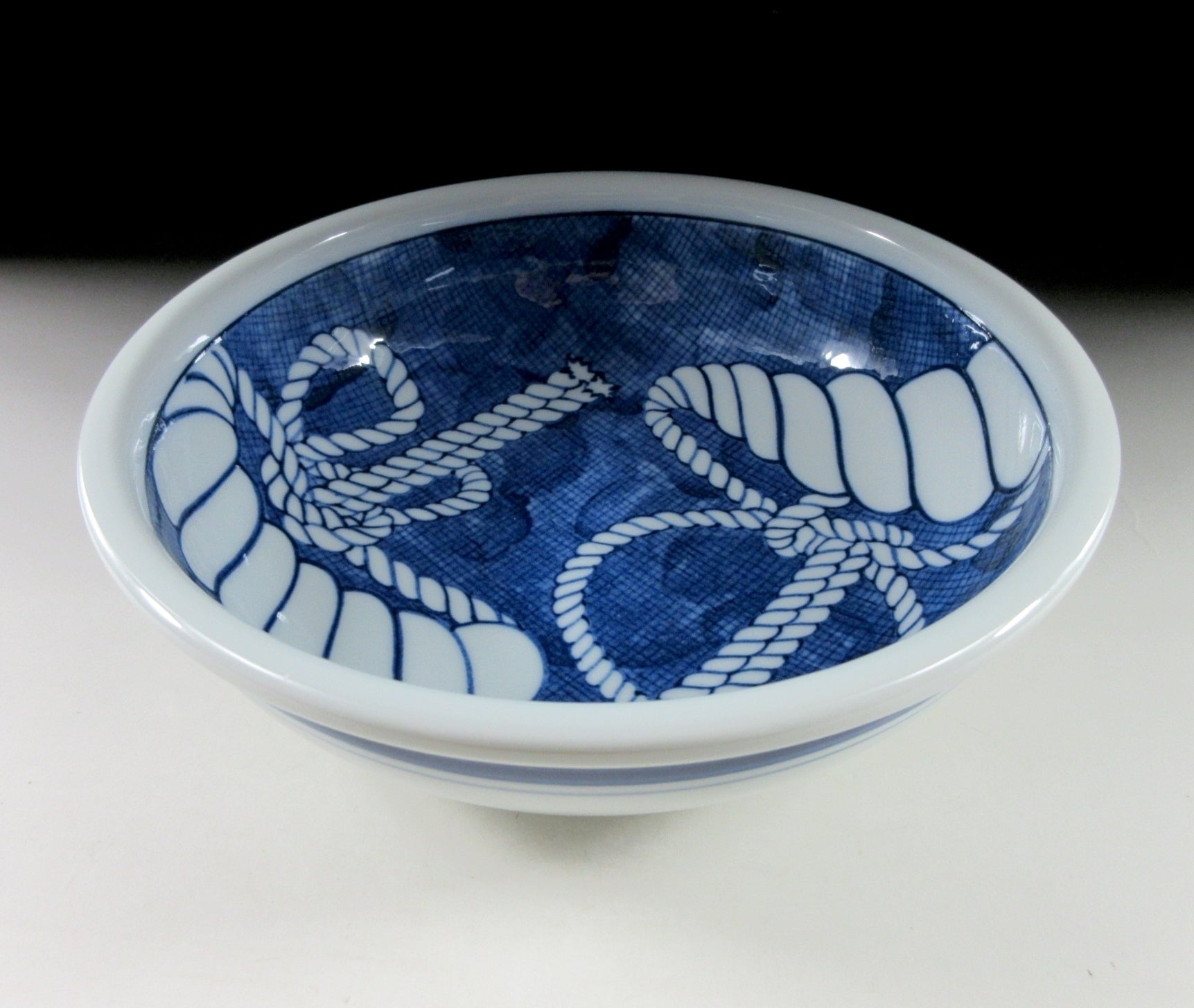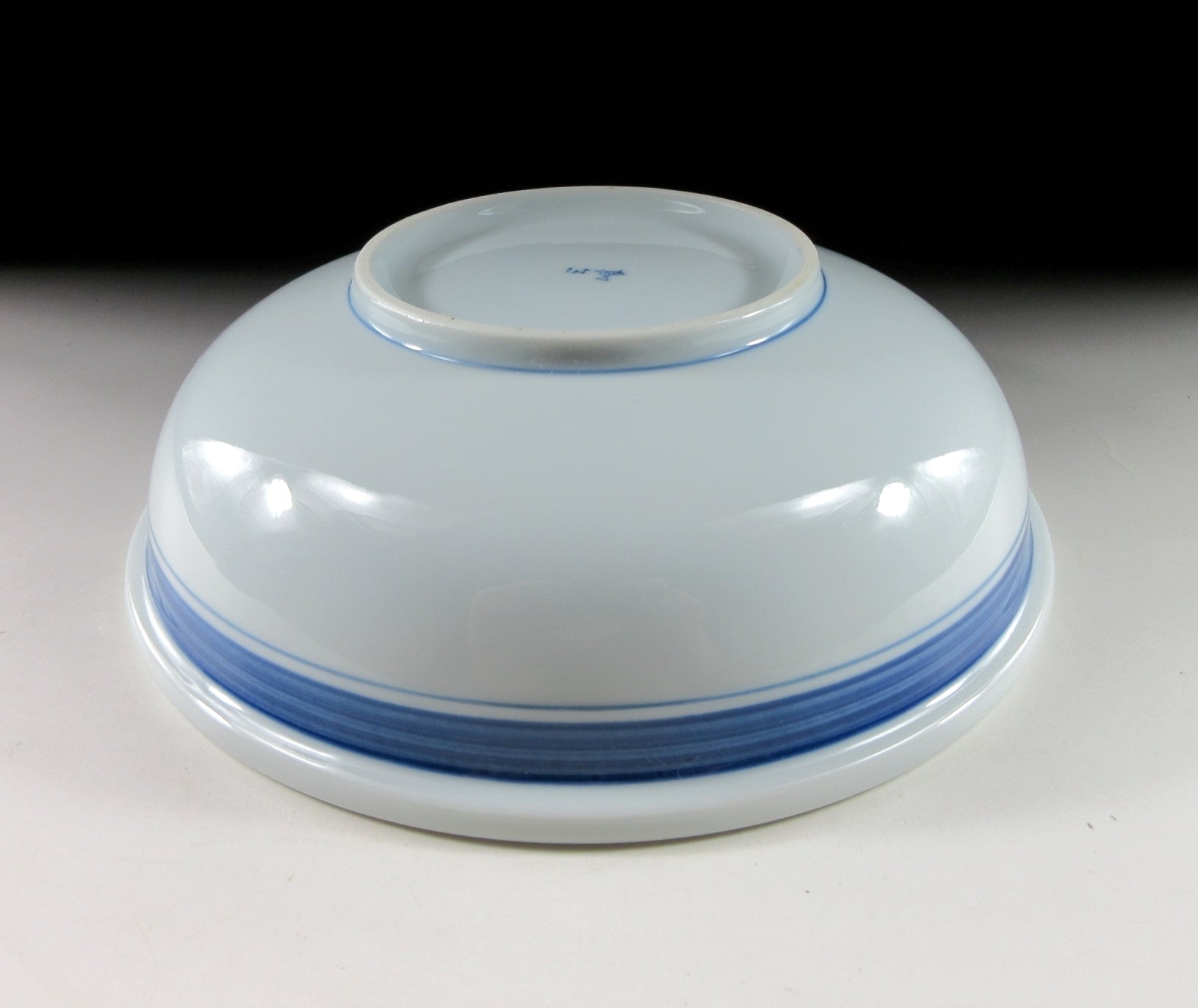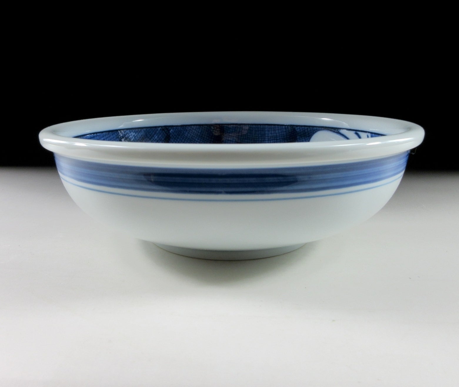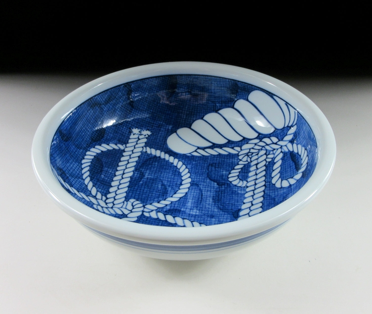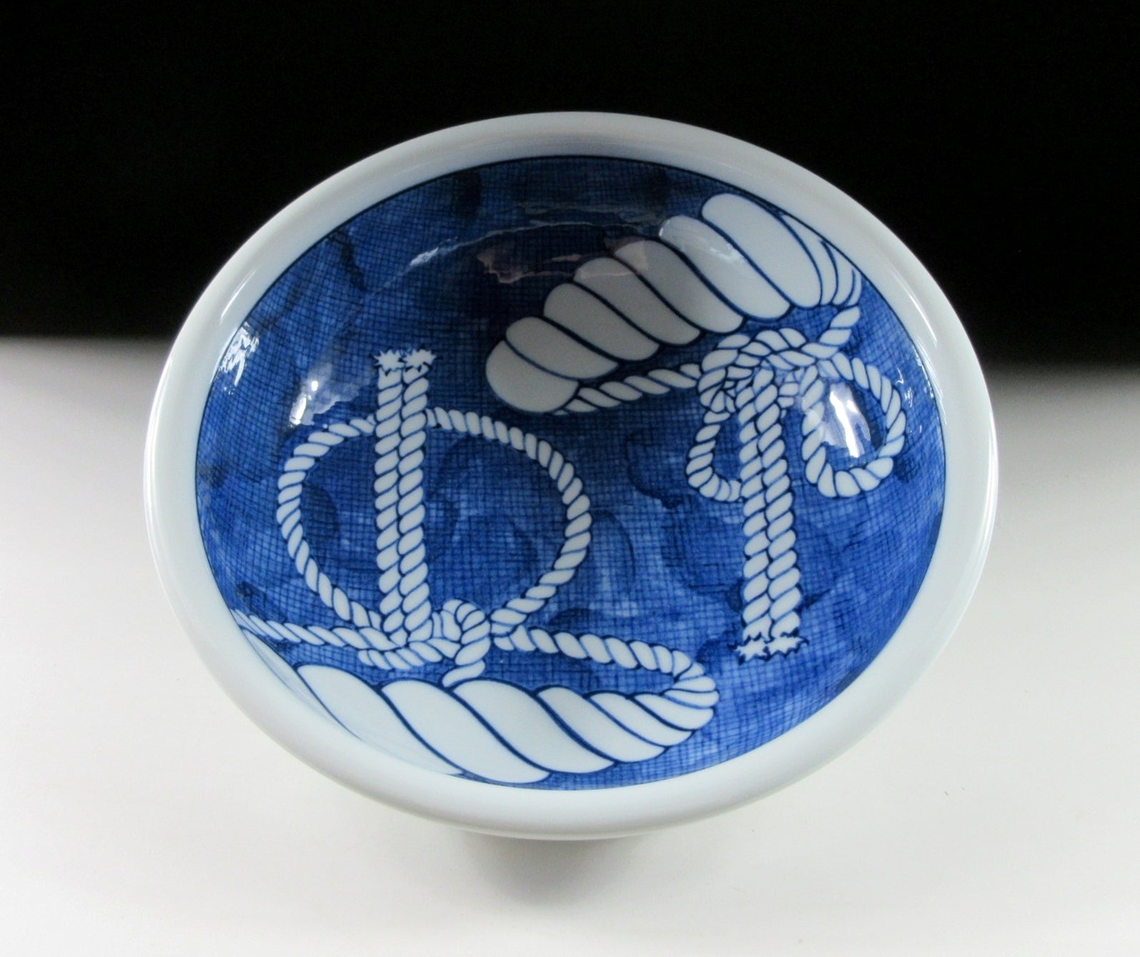 This listing is for a sumo themed Arita-ware bowl made around 5-10 years ago. It is made of porcelain and the interior is decorated with two sacred white ropes used for ceremonial purposes. When a grand champion is promoted to the rank of yokozuna, he is fitted with a rope belt decorated with white ‘shide’ paper strips. This piece is relatively large for a Japanese bowl and is suitable for serving dishes such as pasta, curry etc. The signature of the kiln can be found on the bottom.