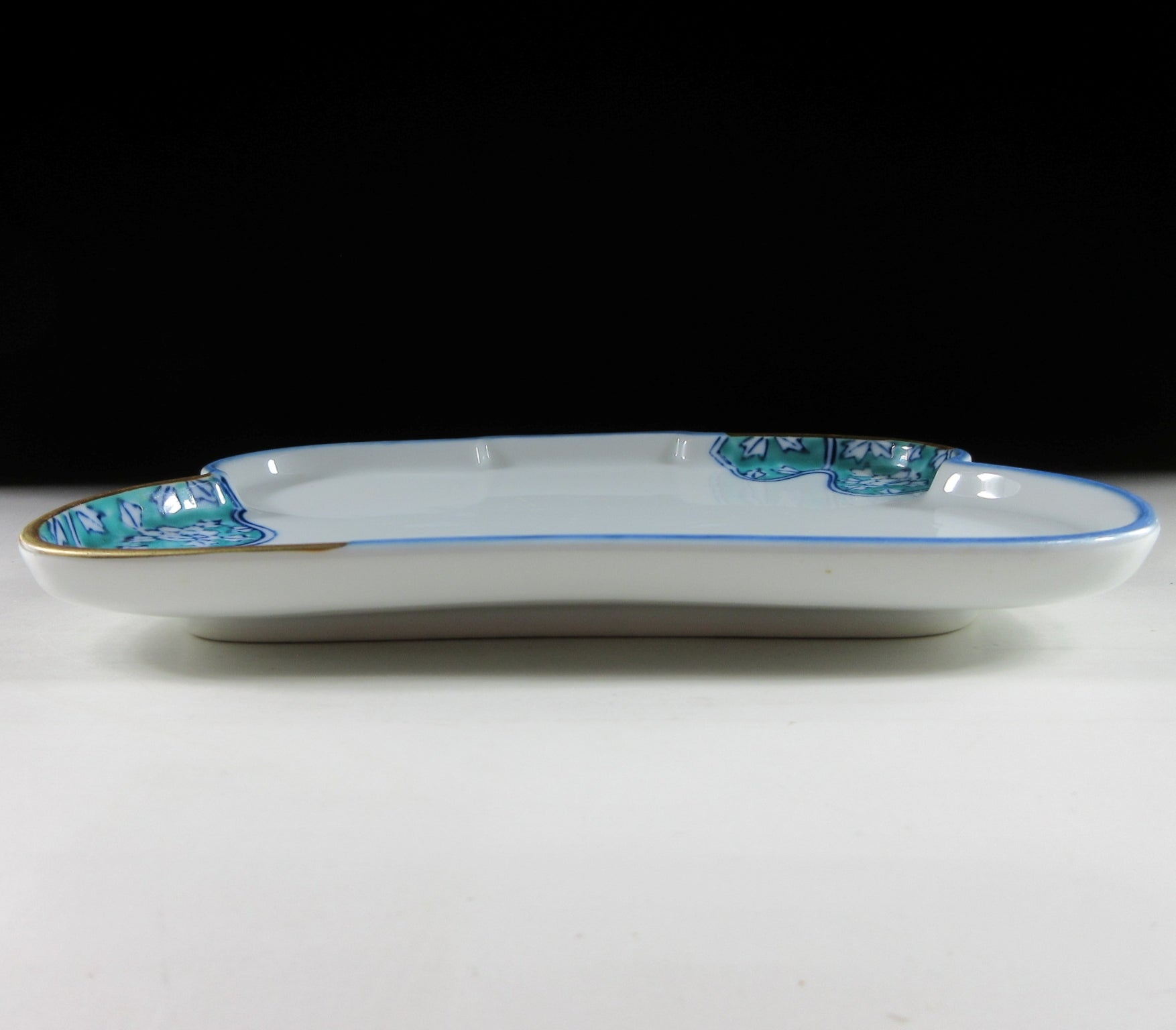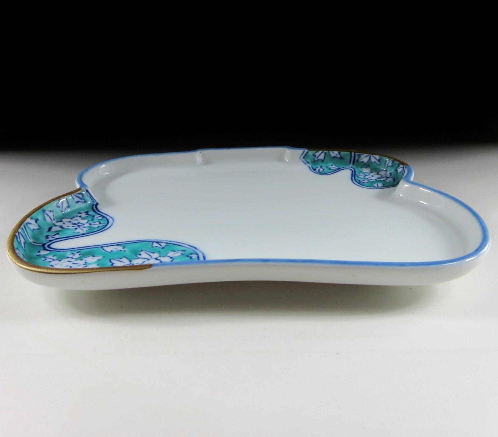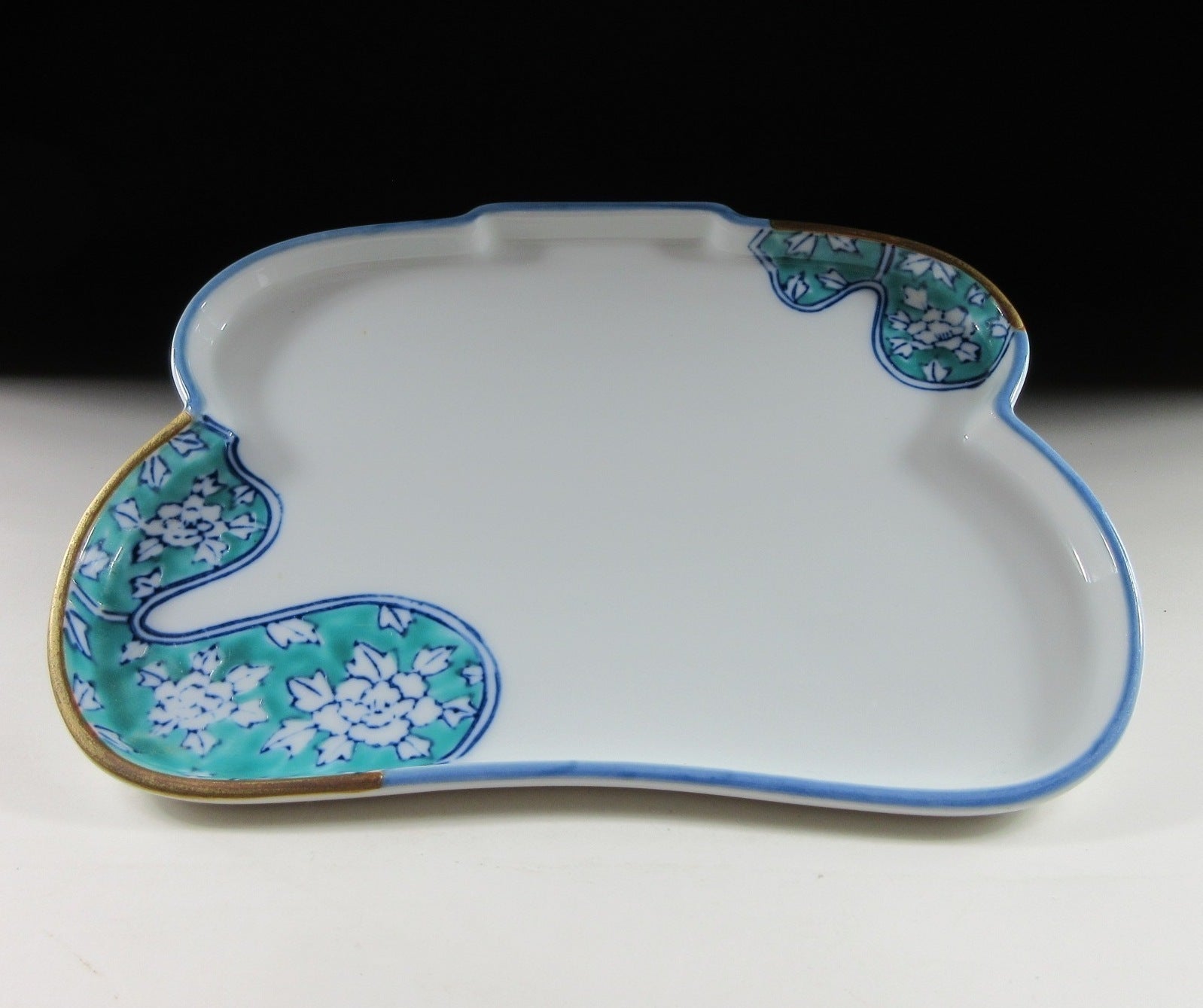 This listing is for an Arita-ware plate made around 20 years ago. It is made of porcelain and moulded to resemble a hyotan. Hyotan are an auspicious symbol linked to longevity and fertility, and they are also thought to symbolise happiness and success. The plate is decorated with small peony blossoms, and the rim is trimmed with blue underglaze and gold overglaze. The cool green colour of the glaze is refreshing and ideal for summer entertaining. Please note that this piece is unsigned.