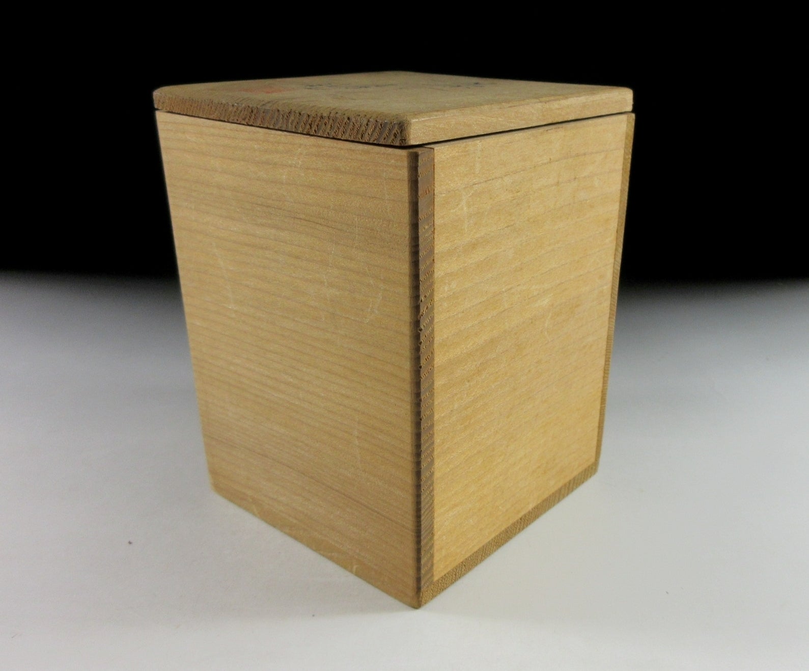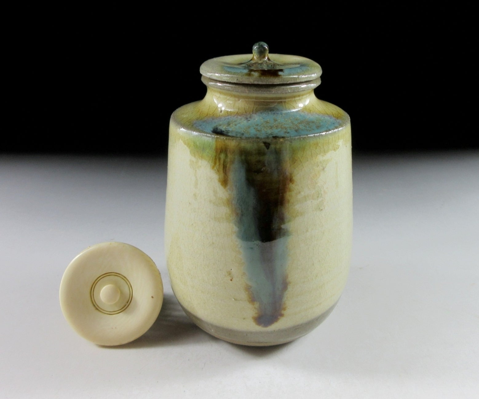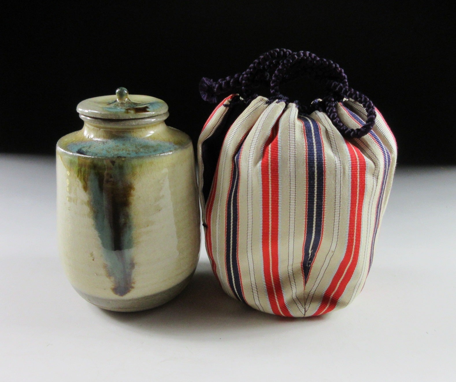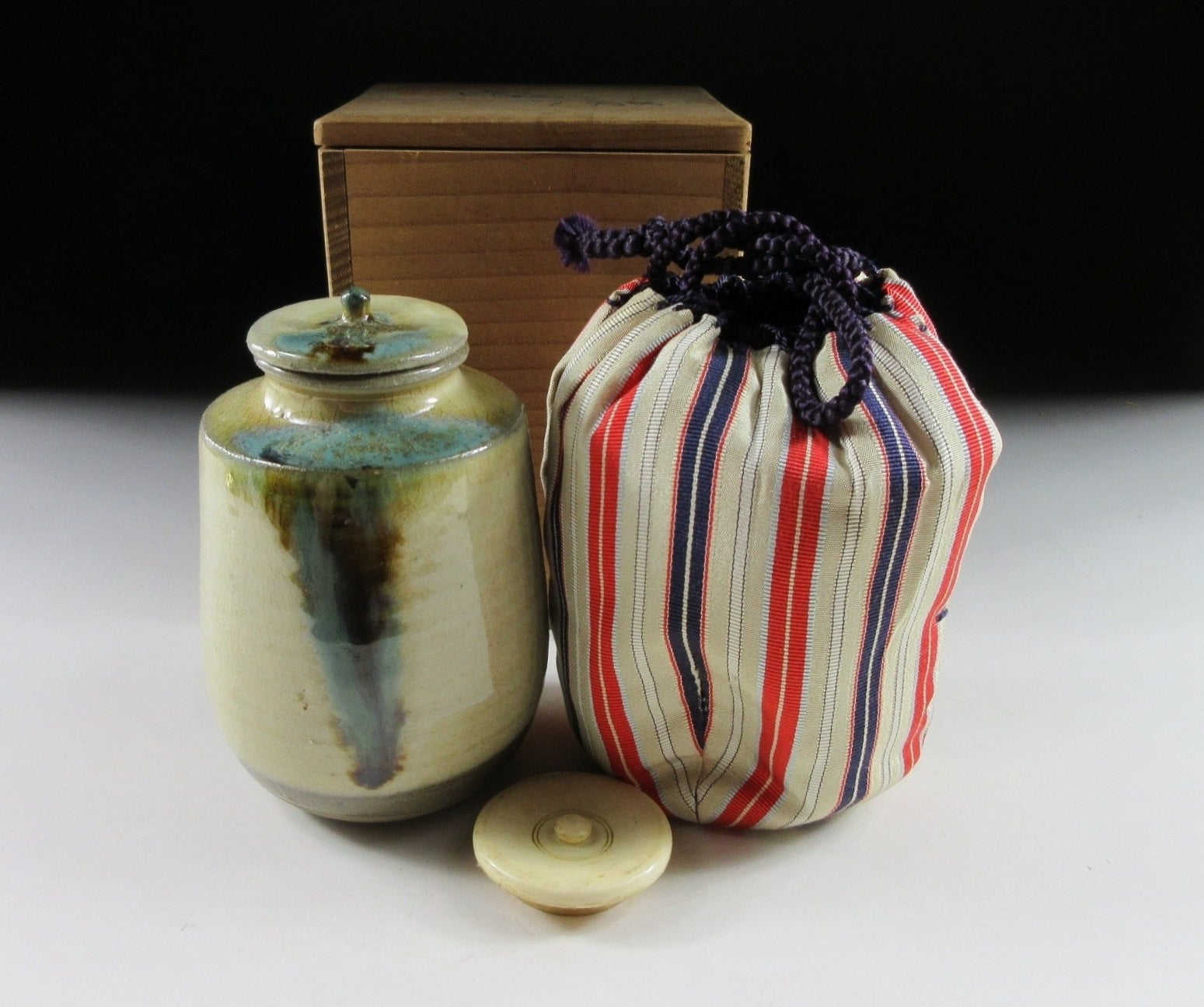 This listing is for a splendid double lid Satsuma-ware chaire with shifuku made around 30 years ago by Ariyama Reiseki III. It is wheel-thrown and the exterior features nuka celadon glaze and dark syrupy glaze over a creamy coloured base. It is made of high-fired stoneware, and the caddy has a katatsuki shape. The lid has been lined with gold foil, and this allows the lid the fit closely into the opening on the chaire. The gold foil is important because it does not corrode like other materials do. The shifuku pouch is actually to protect the tea, not the chaire. Its purpose is to put pressure on the lid and hold it into place once the drawstring is tied over the top. The shifuku in this listing is decorated with a vertical stripe pattern, and has a dark blue/purple drawstring. Reiseki’s stamp can be found on the bottom of the chaire, and it comes with its original signed wooden storage box. It also comes with two Japanese language profile papers.