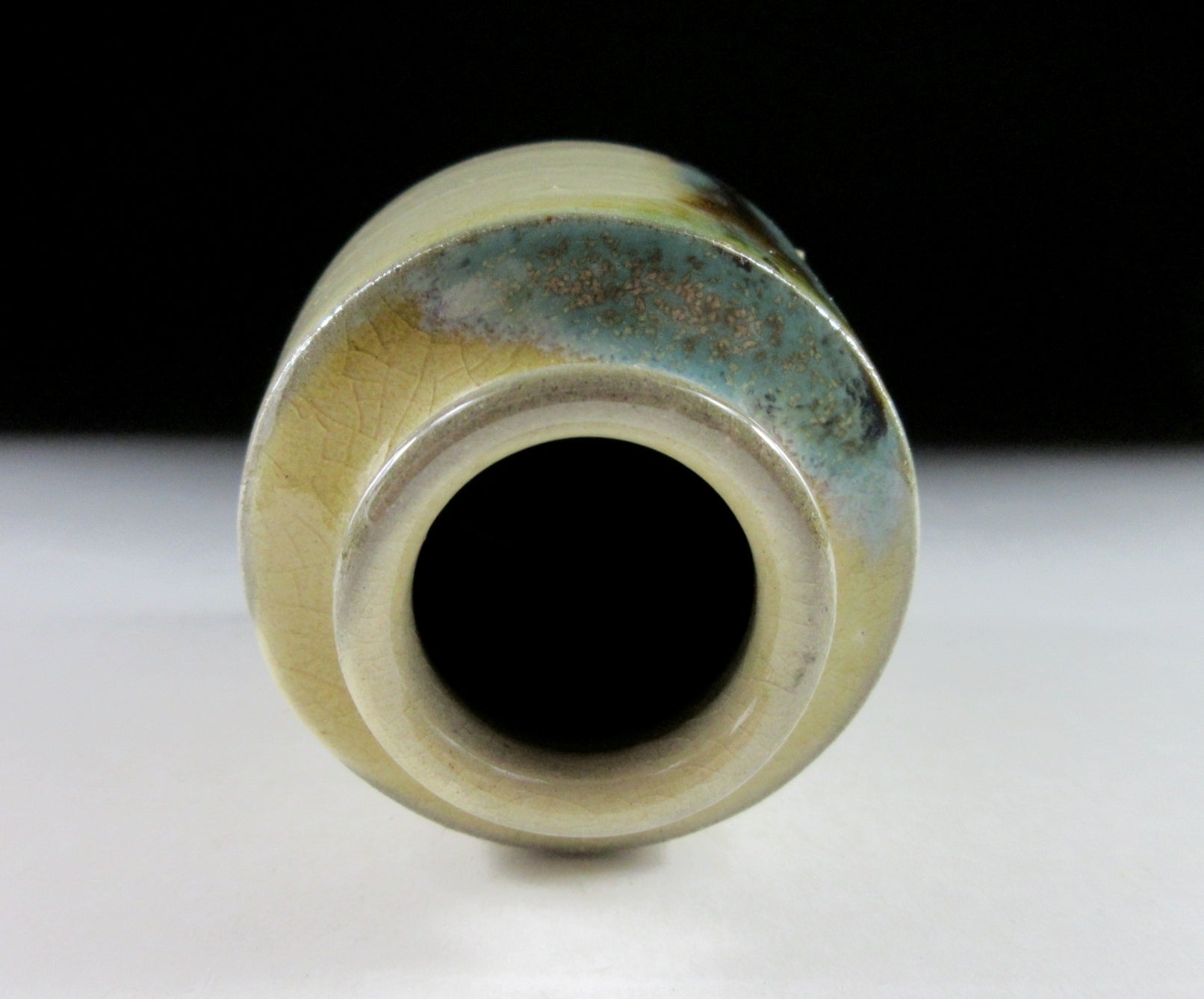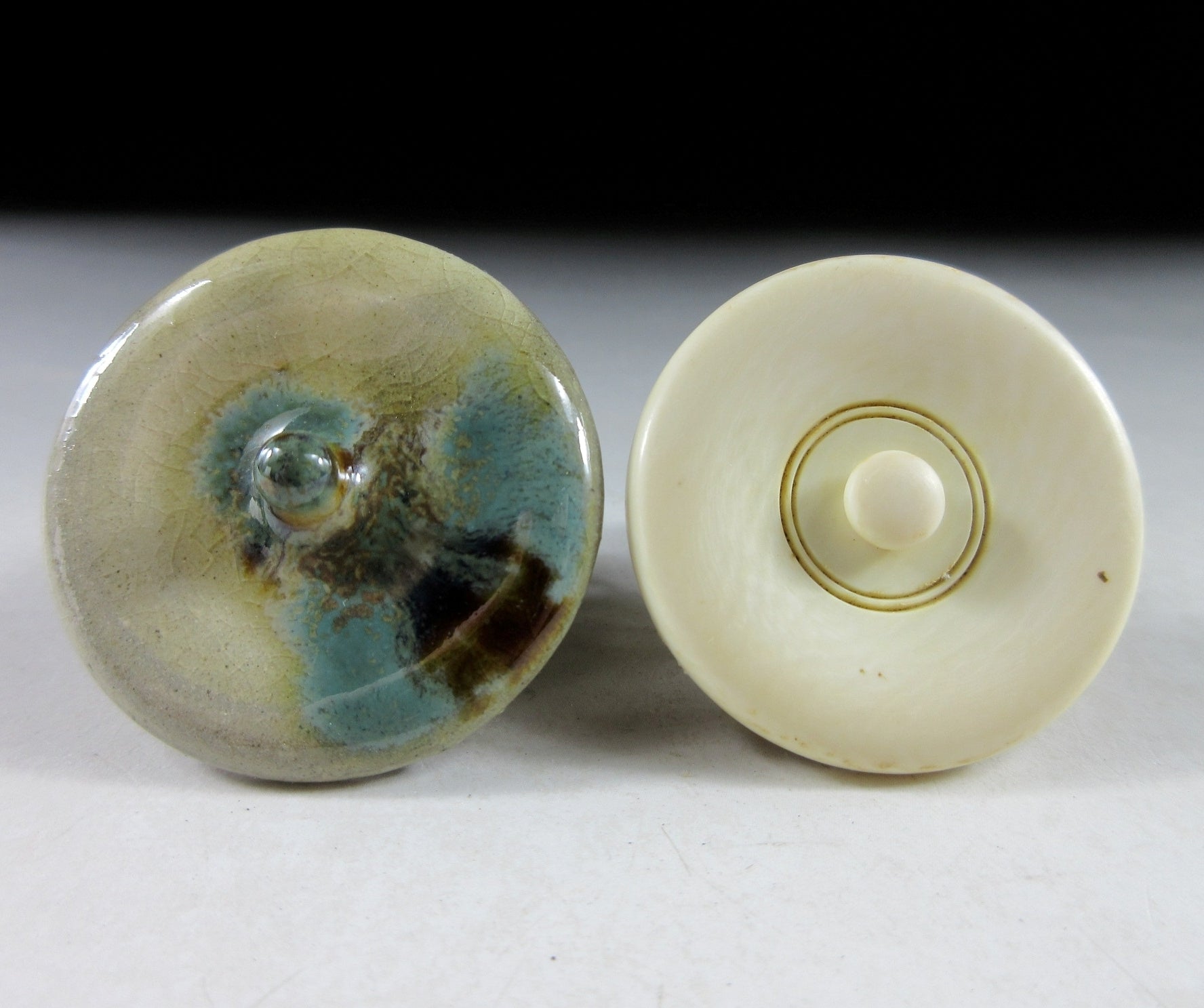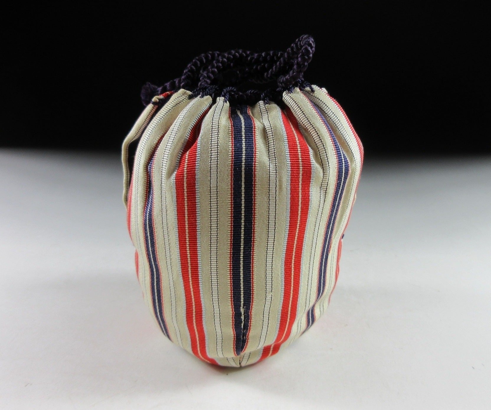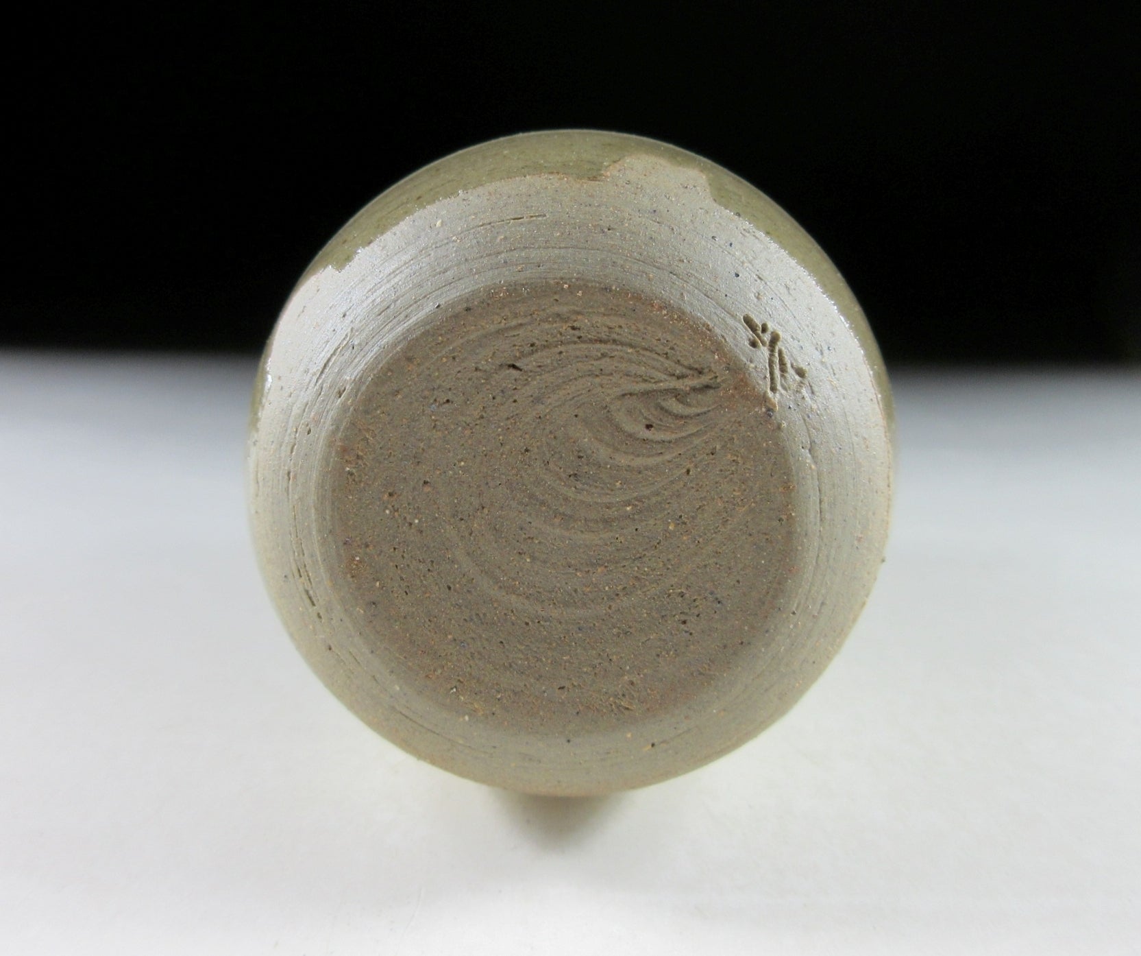 This listing is for a splendid double lid Satsuma-ware chaire with shifuku made around 30 years ago by Ariyama Reiseki III. It is wheel-thrown and the exterior features nuka celadon glaze and dark syrupy glaze over a creamy coloured base. It is made of high-fired stoneware, and the caddy has a katatsuki shape. The lid has been lined with gold foil, and this allows the lid the fit closely into the opening on the chaire. The gold foil is important because it does not corrode like other materials do. The shifuku pouch is actually to protect the tea, not the chaire. Its purpose is to put pressure on the lid and hold it into place once the drawstring is tied over the top. The shifuku in this listing is decorated with a vertical stripe pattern, and has a dark blue/purple drawstring. Reiseki’s stamp can be found on the bottom of the chaire, and it comes with its original signed wooden storage box. It also comes with two Japanese language profile papers.