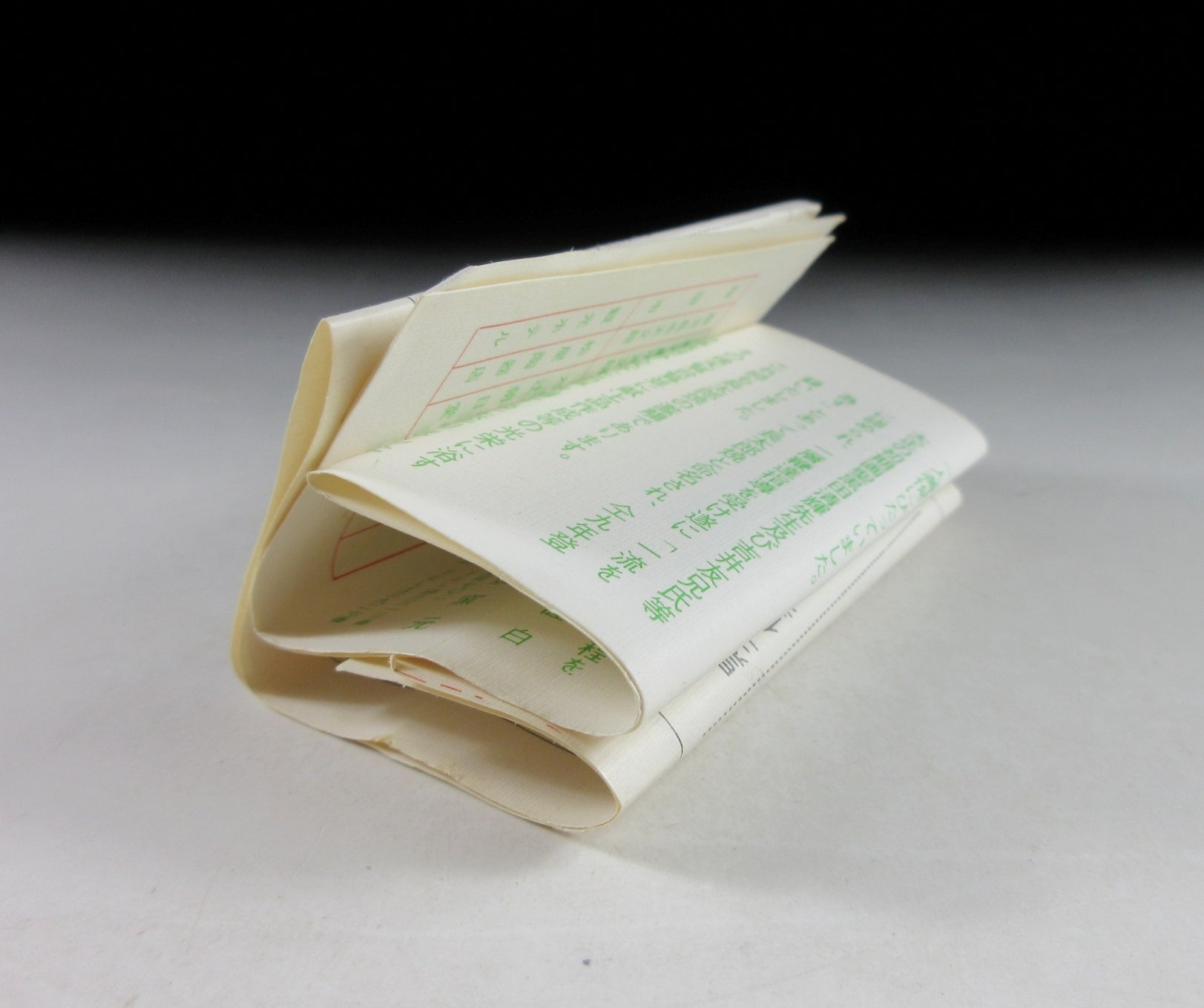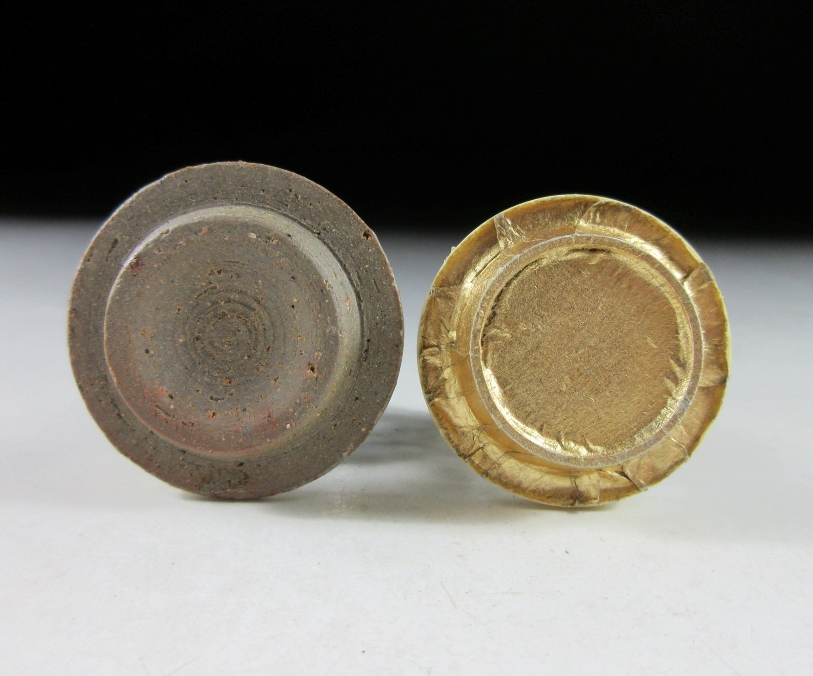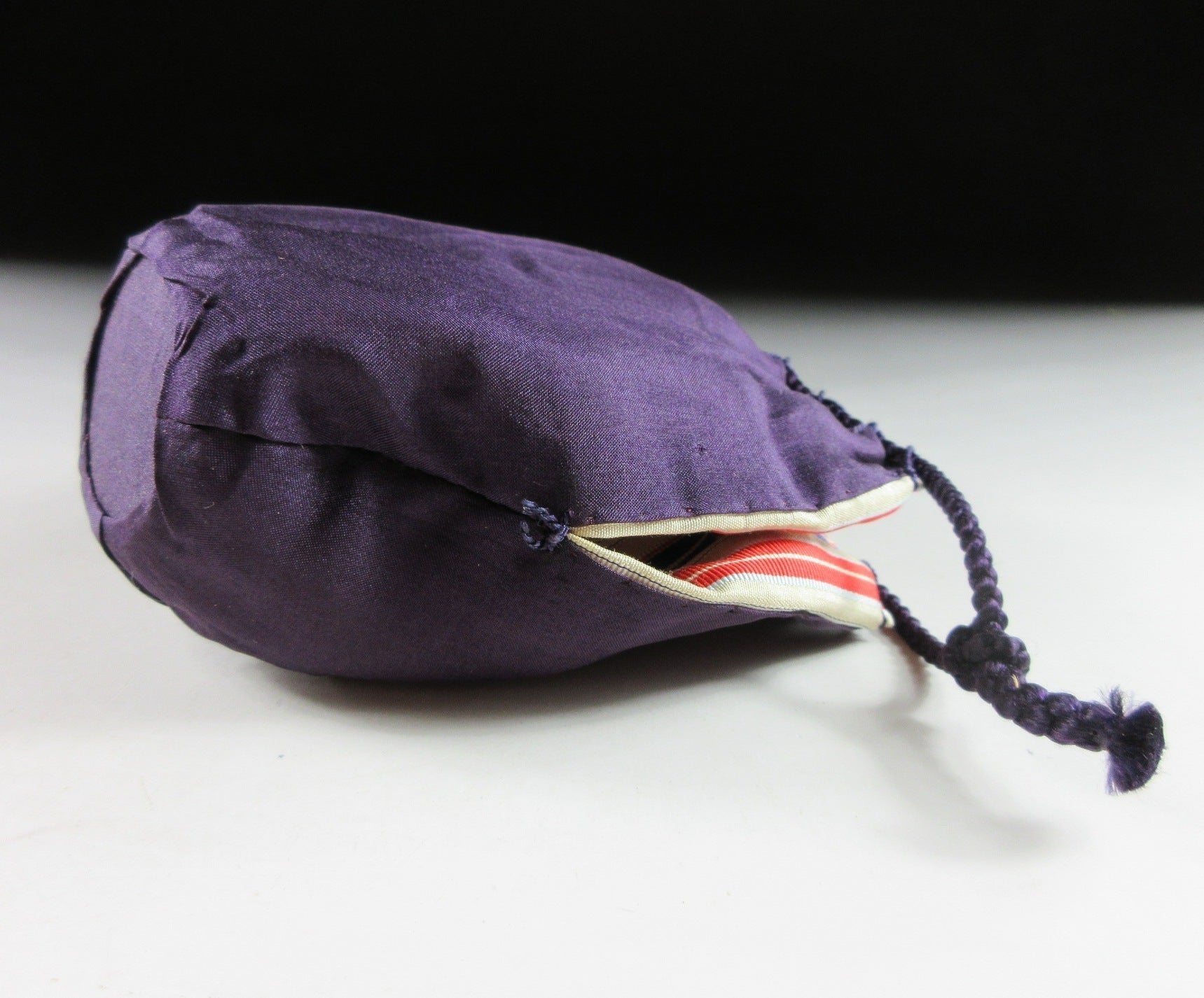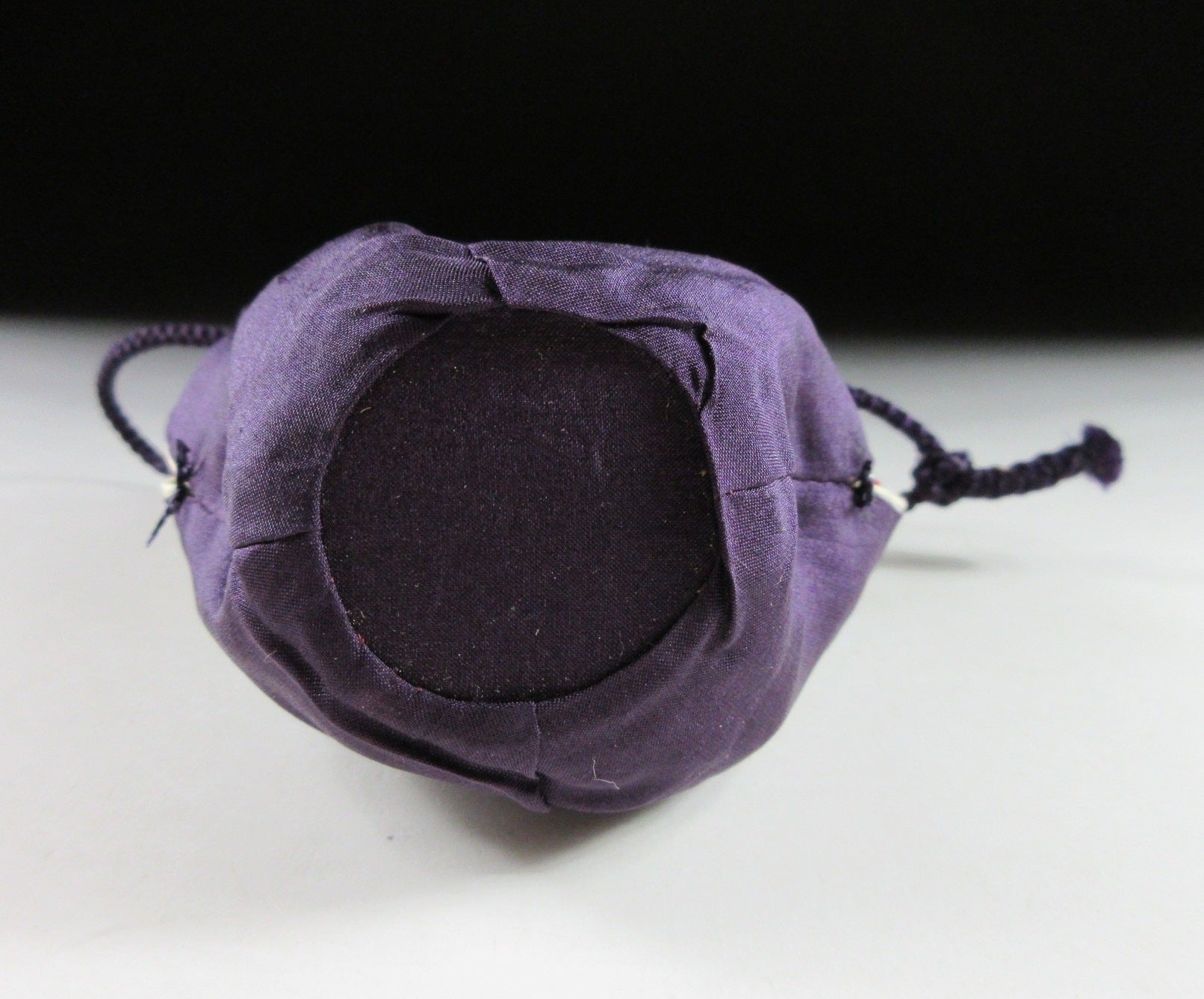 This listing is for a splendid double lid Satsuma-ware chaire with shifuku made around 30 years ago by Ariyama Reiseki III. It is wheel-thrown and the exterior features nuka celadon glaze and dark syrupy glaze over a creamy coloured base. It is made of high-fired stoneware, and the caddy has a katatsuki shape. The lid has been lined with gold foil, and this allows the lid the fit closely into the opening on the chaire. The gold foil is important because it does not corrode like other materials do. The shifuku pouch is actually to protect the tea, not the chaire. Its purpose is to put pressure on the lid and hold it into place once the drawstring is tied over the top. The shifuku in this listing is decorated with a vertical stripe pattern, and has a dark blue/purple drawstring. Reiseki’s stamp can be found on the bottom of the chaire, and it comes with its original signed wooden storage box. It also comes with two Japanese language profile papers.