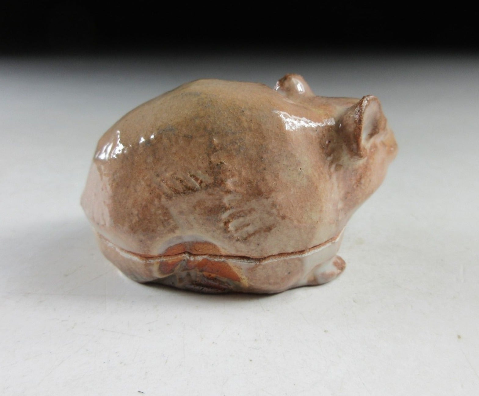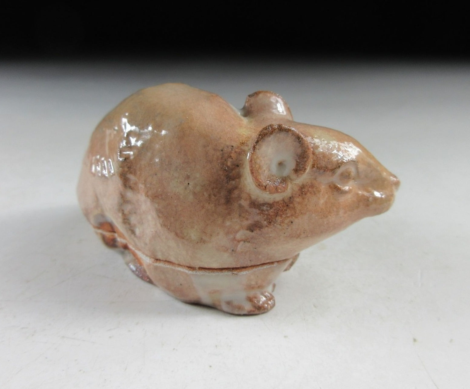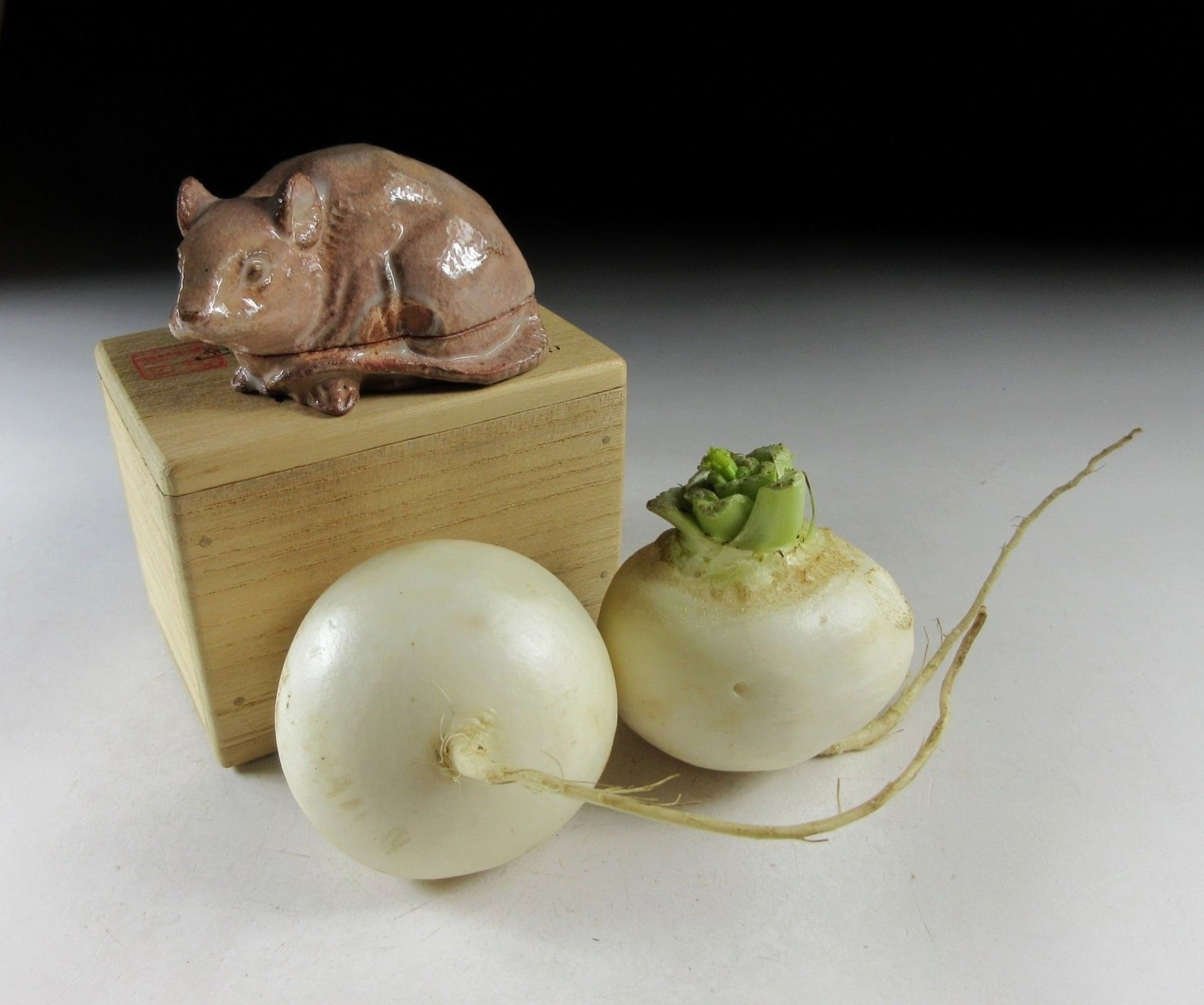 This listing is for an Asahi-ware kogo made around 20 years ago by Asahi Hosai XIV. It is moulded to resemble a rat and coated in transparent white glaze. Its size and shape is suitable for both woodchip and kneaded incense, although pottery kogo are typically used for kneaded incense during the cooler months. This piece was most likely made to commemorate the Year of the Rat back in 1996. The stamp of the potter can be found on the bottom, and it comes with its original signed storage box. It also comes with a stamped yellow wrapping cloth for when the item is not in use.