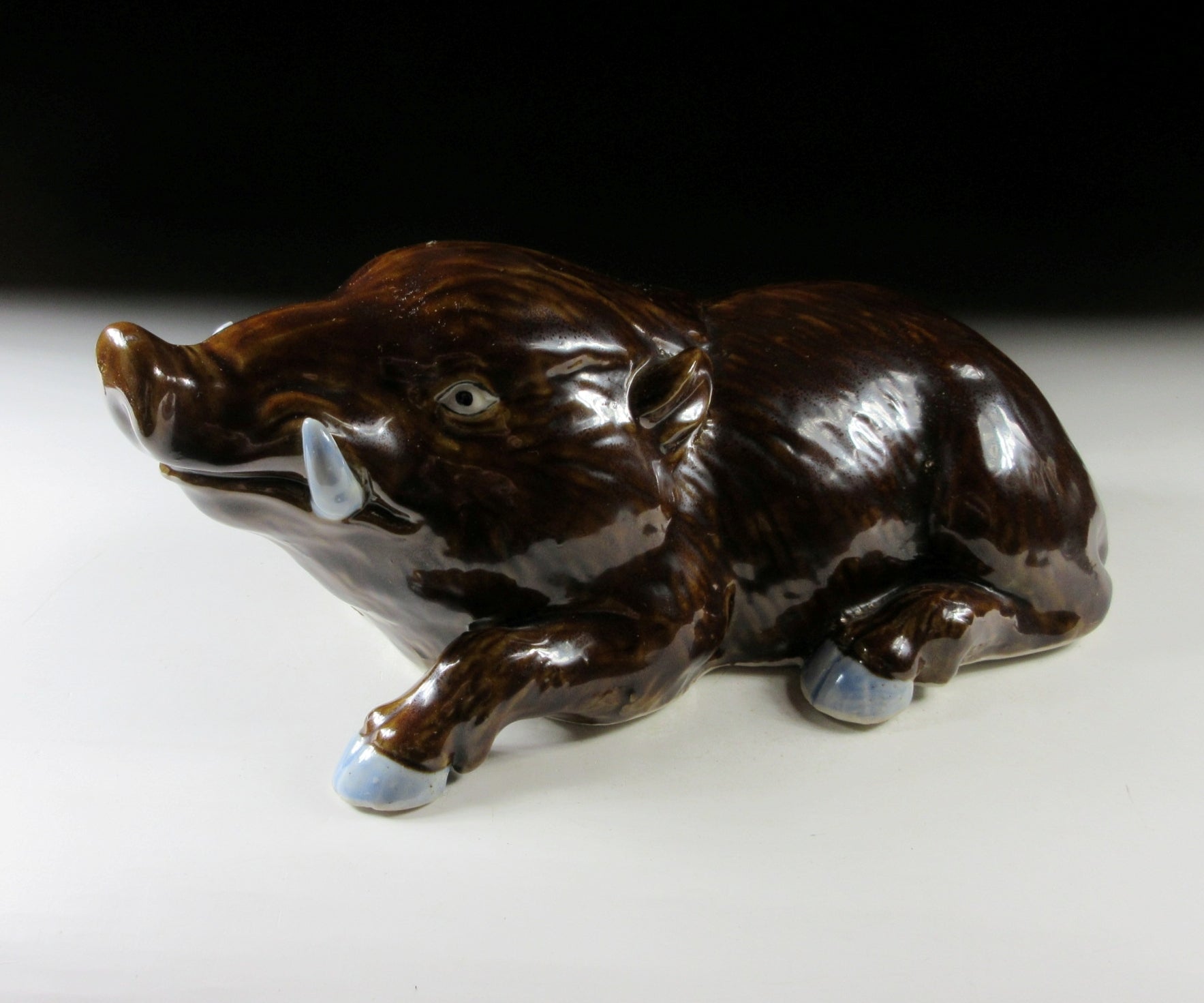 This listing is for a Kutani-ware okimono made around 20-30 years ago by master potter, Asakura Isokichi II. It is made from a slip mould and moulded to resemble a wild boar. The piece is coated in brown glaze with light blue trim for the tusks and hooves. This piece was most likely made to commemorate the Year of the Boar back in either 1983 or 1995. The stamp of the potter can be found on the bottom.