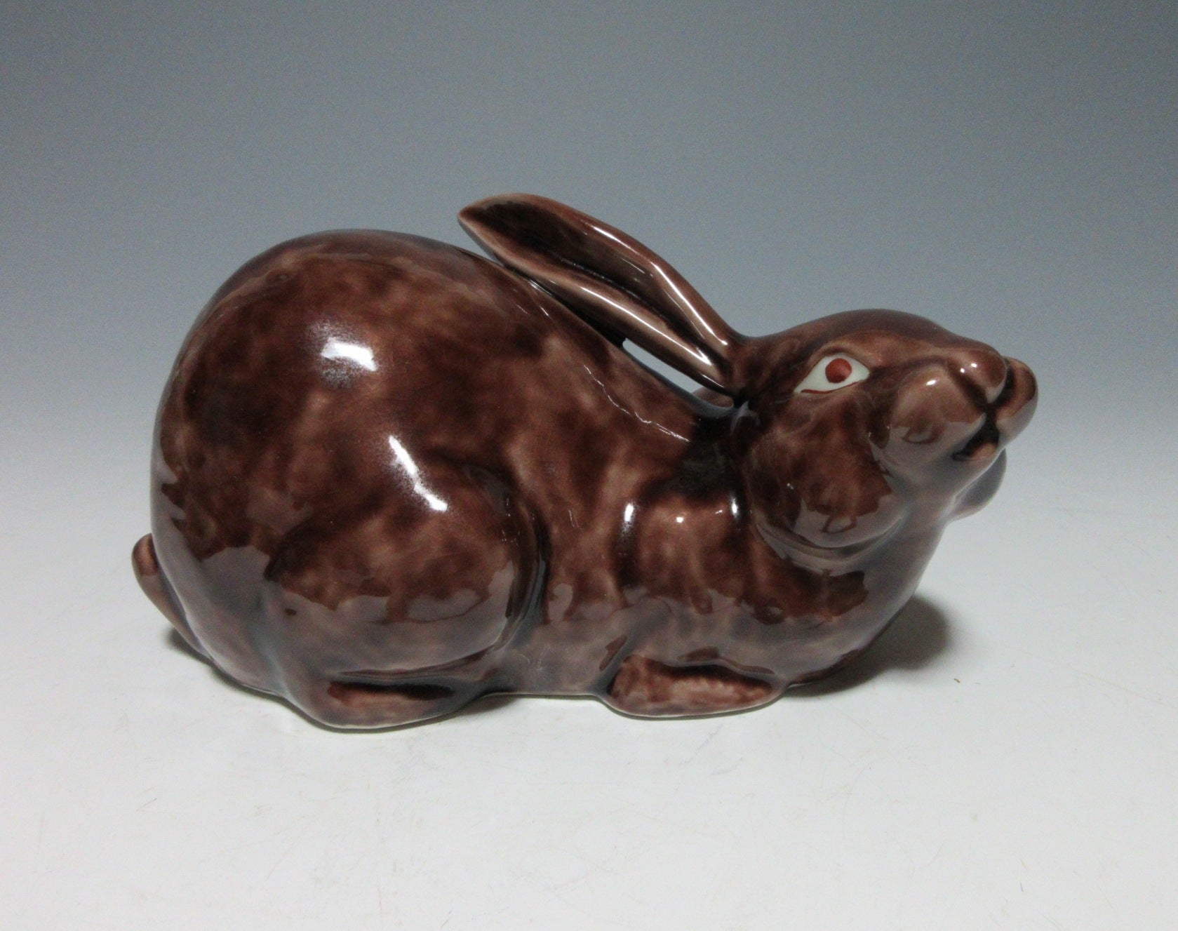 This listing is for a Kutani-ware rabbit okimono made around 20 years ago by noted potter Asakura Isokichi III. It is made from a slip mould and coated in glossy purple glaze. Purple is one of the traditional glaze colours and belongs to the ‘go-sai’ five colour palette. This piece was most likely made to commemorate the Year of the Rabbit back in 1999. The signature and stamp of the potter can be found on the bottom, and it comes with its original signed wooden storage box.