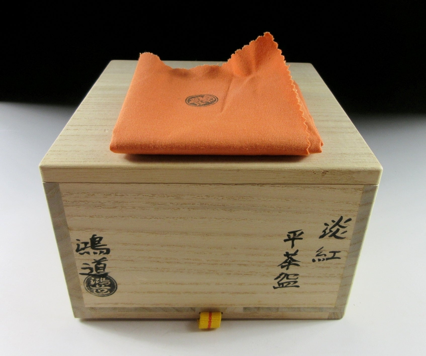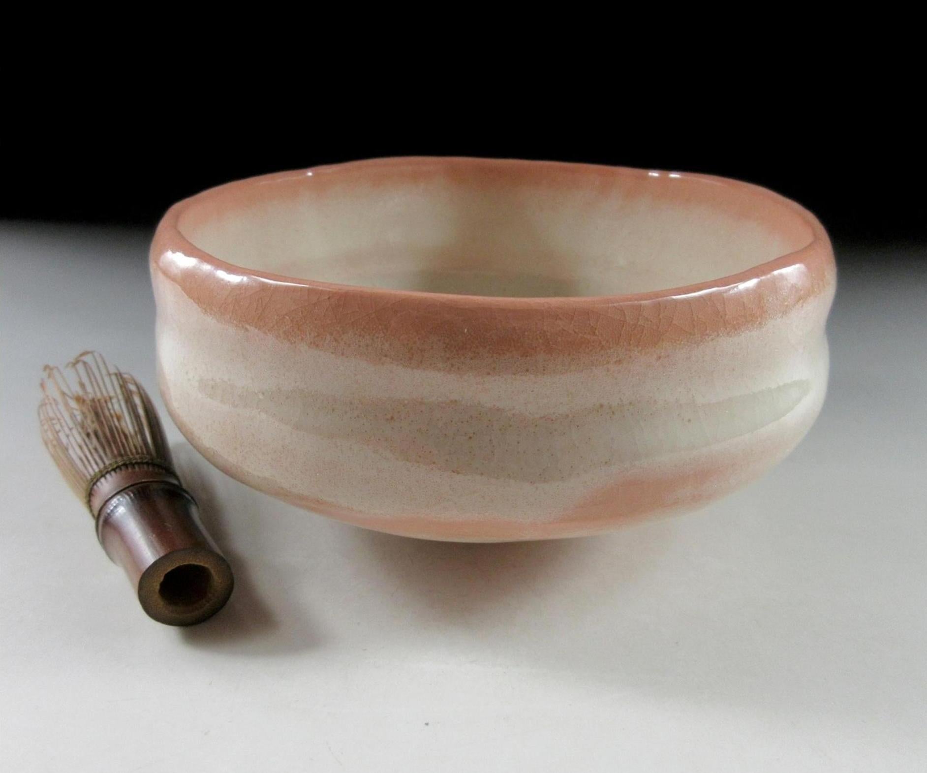 This listing is for an ‘awa-beni’ pale red raku chawan made around 5 years ago and signed ‘Kodo’. It is hand-turned and the flat hira type used during the summer season. Hira chawan are shallow bowls with low sides designed to cool tea down faster. This particular bowl is rather solid with nice thick walls, and it has a reasonably plump rim. The stamp of the potter can be found on the bottom, and it comes with its original signed wooden storage box. It also comes with a signed orange coloured wrapping cloth for when the item is not in use. *PLEASE NOTE THAT THE BAMBOO TEA WHISK AND TEA SCOOP ARE NOT INCLUDED.