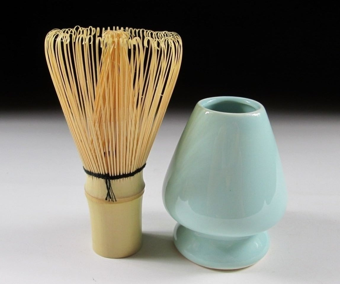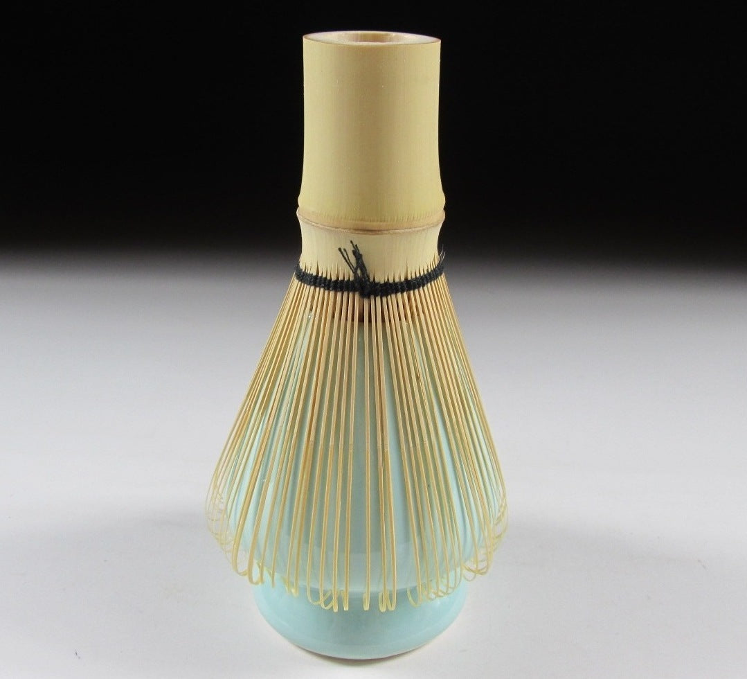 This listing is for a 100 tine chasen tea whisk and a ceramic tea whisk shaper. The chasen is tulip shaped and split from one piece of bamboo into 100 small prongs. The 100 tine type is considered to be better quality because more prongs result in more foam and a better frothy texture. The set also includes a ceramic kusenaoshi tea whisk shaper. The shaper’s job is to help your chasen maintain its shape whilst drying. Care should be taken when placing your chasen on the shaper. Not placing the tines properly may result in broken ends. The shaper in this listing has a nice smooth surface which won’t snag the tines on your tea whisk.
