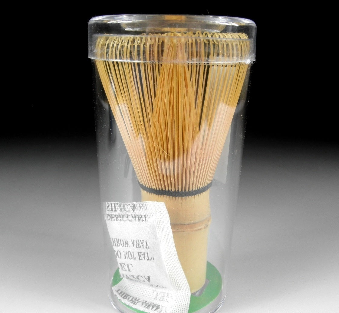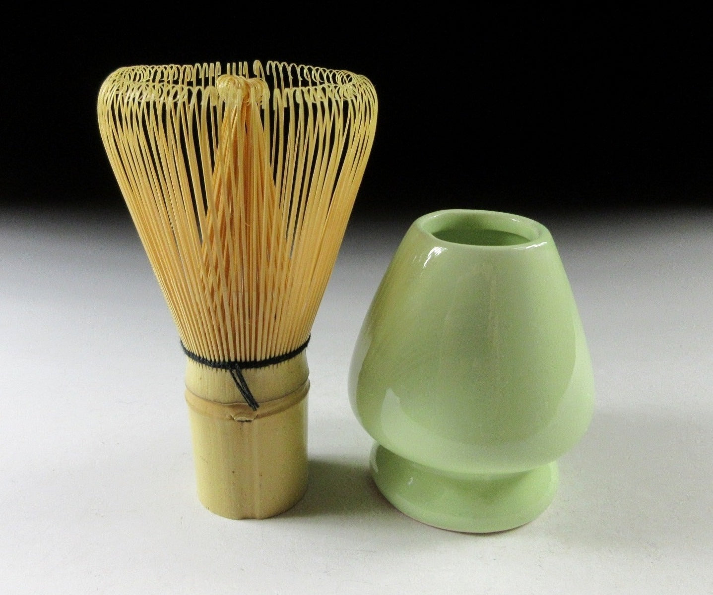 This listing is for a 100 tine chasen tea whisk and a ceramic tea whisk shaper. The chasen is tulip shaped and split from one piece of bamboo into 100 small prongs. The 100 tine type is considered to be better quality because more prongs result in more foam and a better frothy texture. The set also includes a green ceramic kusenaoshi tea whisk shaper. The shaper’s job is to help your chasen maintain its shape whilst drying. Care should be taken when placing your chasen on the shaper. Not placing the tines properly may result in broken ends. The shaper in this listing has a nice smooth surface which won’t snag the tines on your tea whisk.