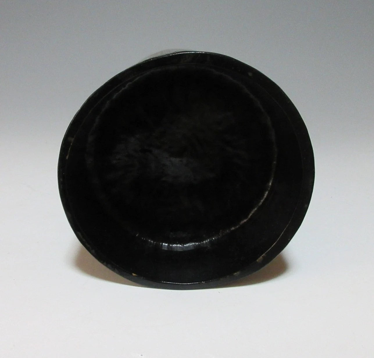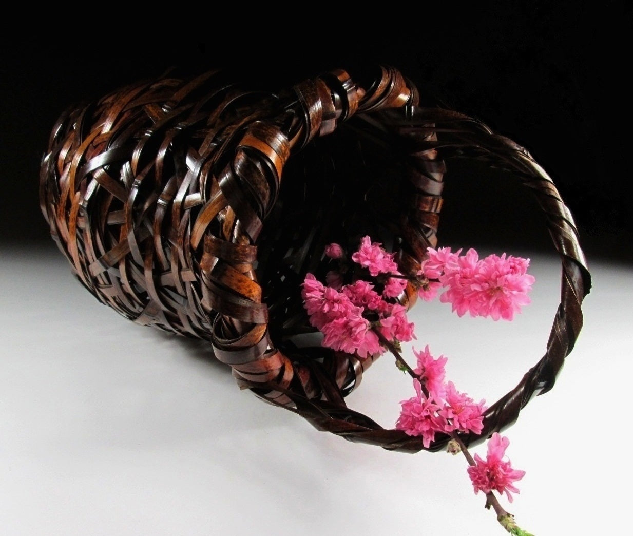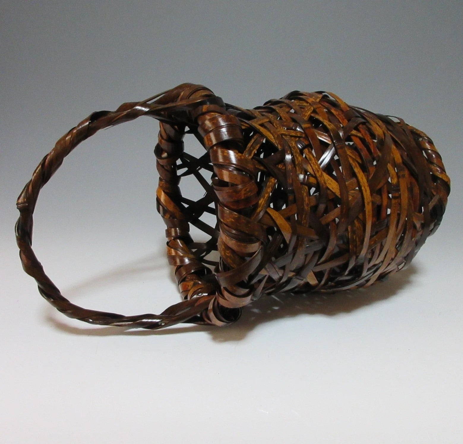 This listing is for a splendid ikebana basket made around 30-40 years ago. It is made of thin strips of woven bamboo that have been lacquered brown, and there’s a braided handle attached to the top. The basket is not symmetrical, it has more of an irregular shape which in my opinion makes its attractive. The insert on the interior is made of lacquered bamboo and it’s reasonably easy to take in and out.