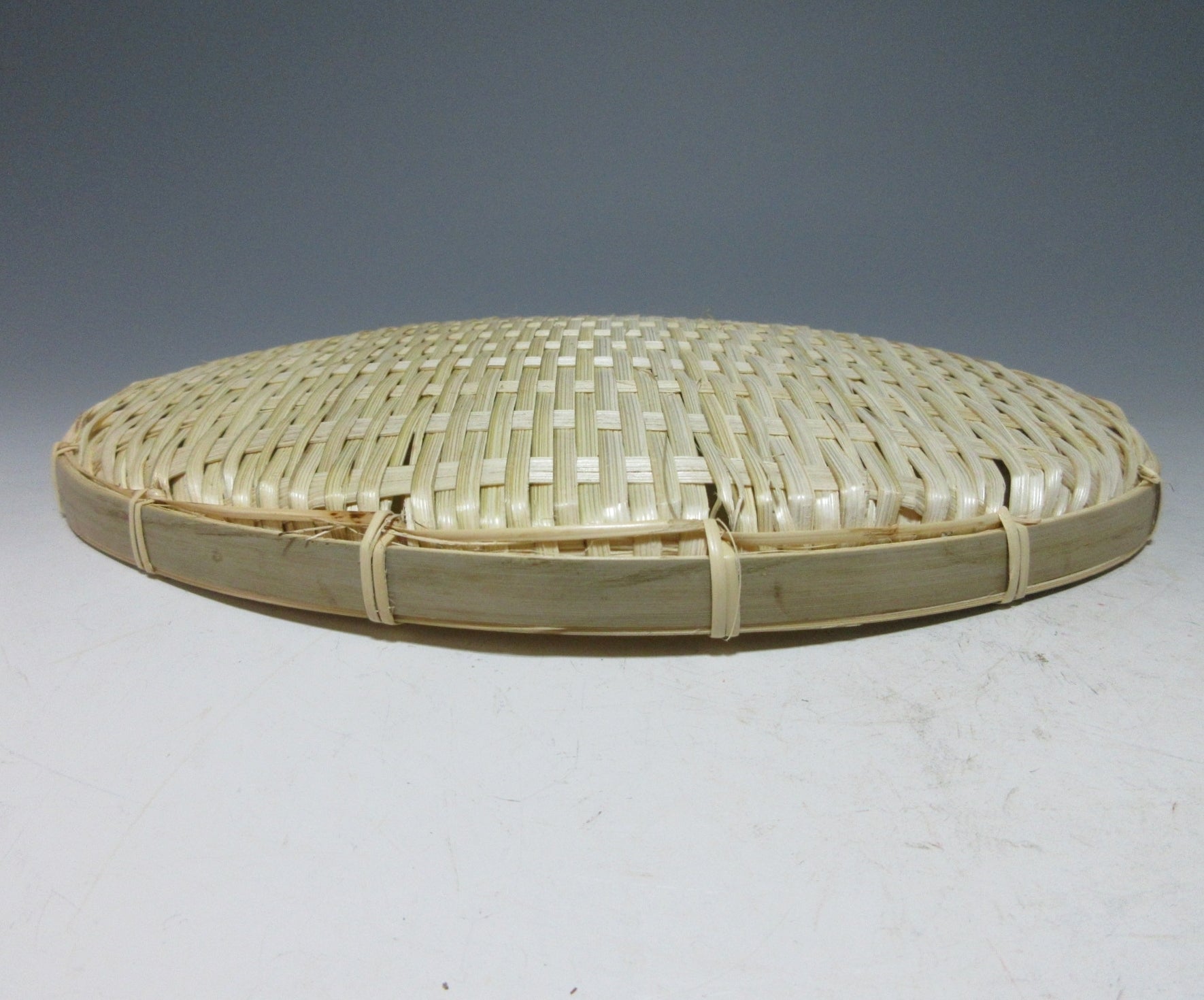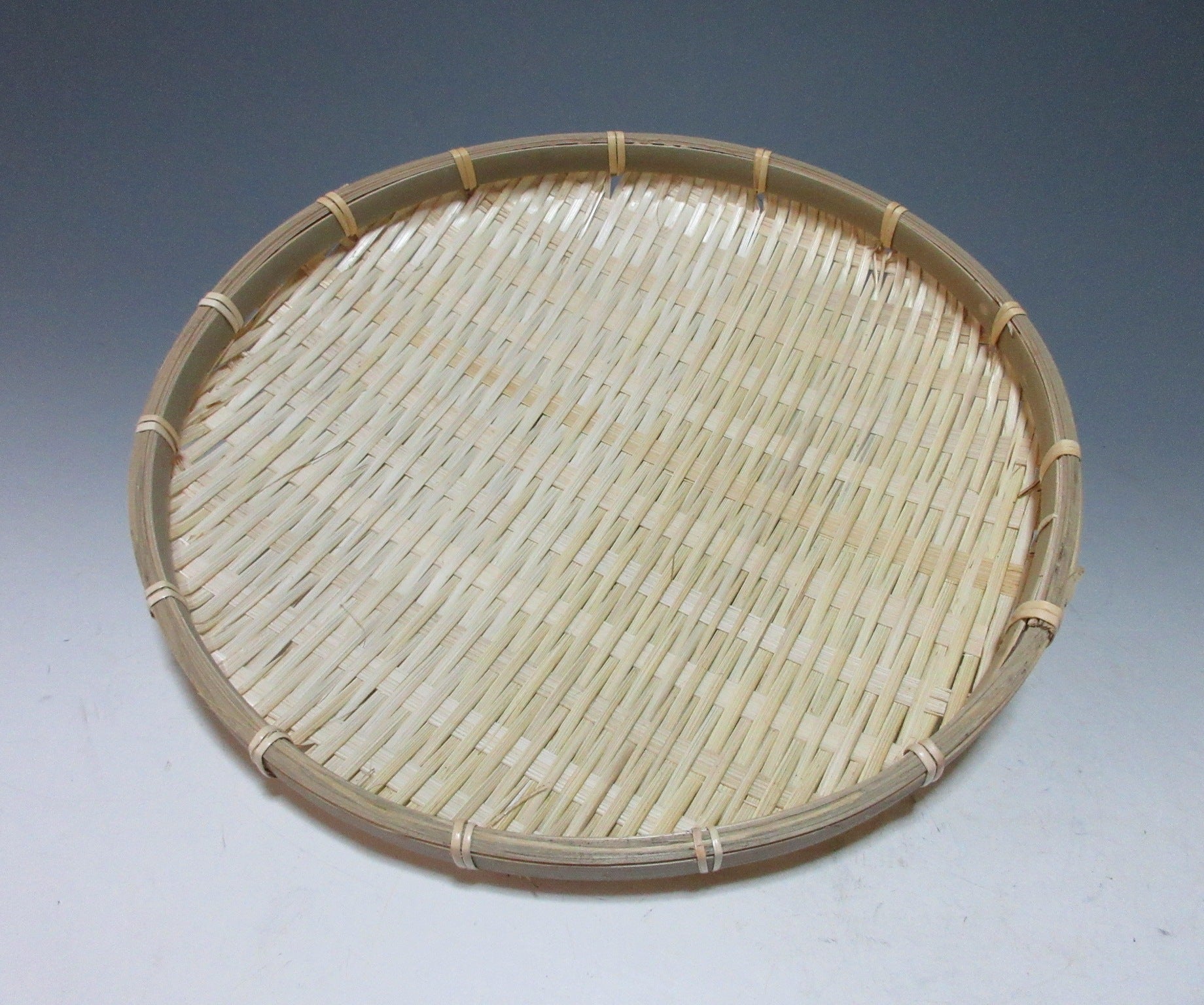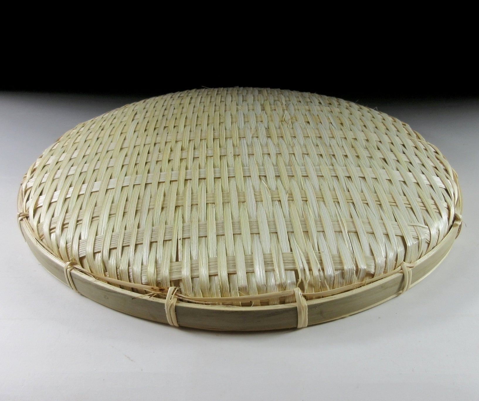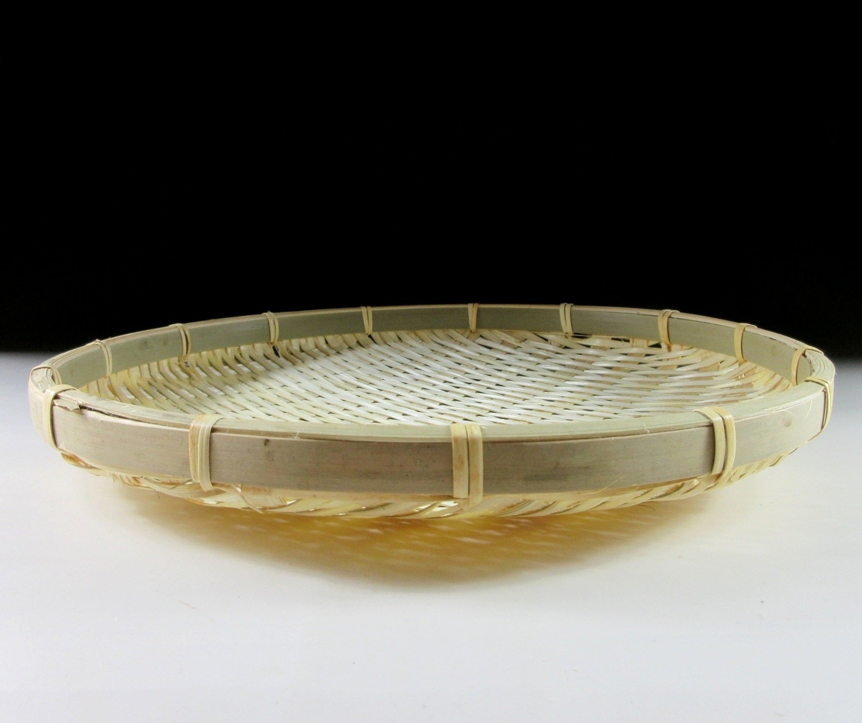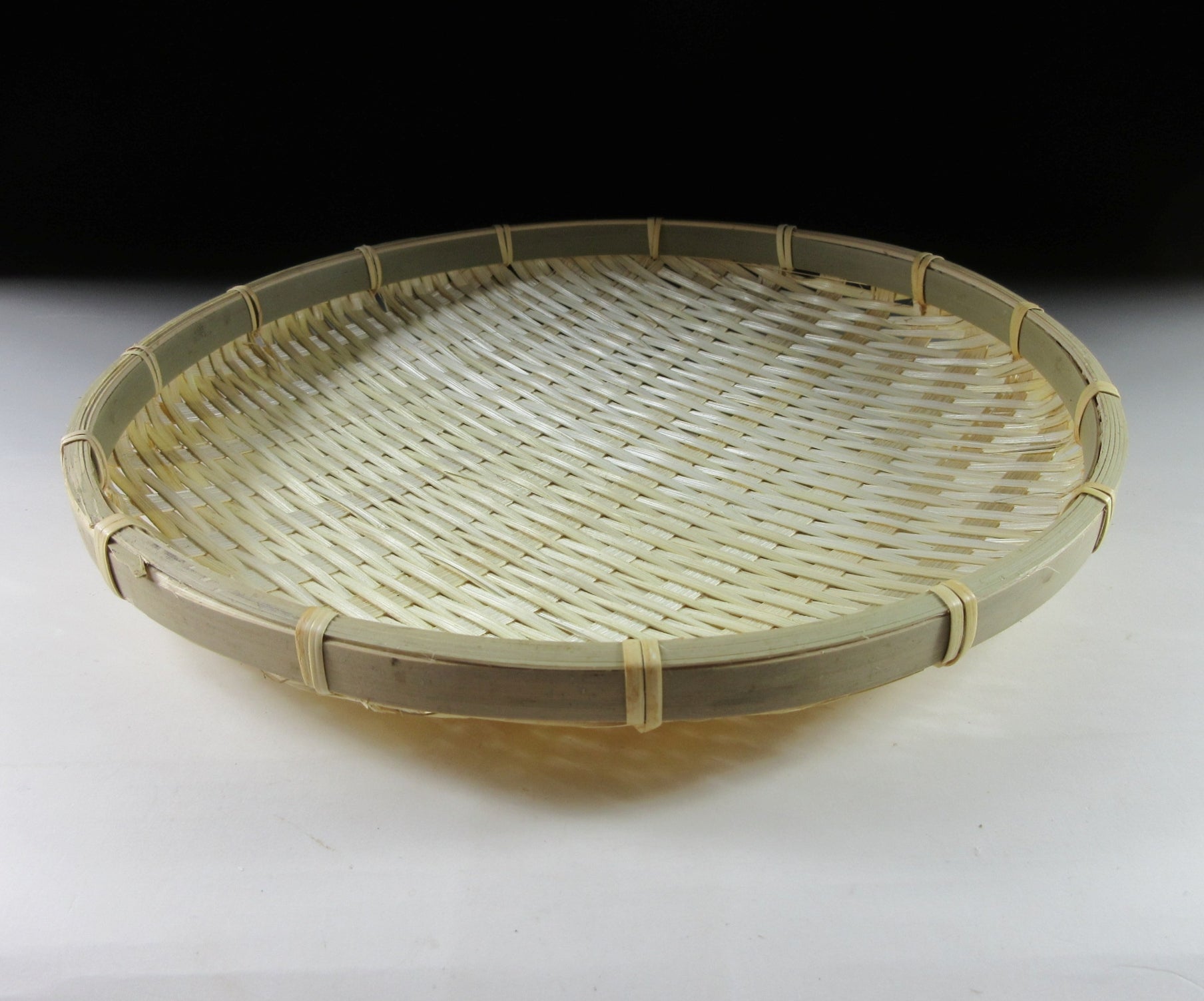 This listing is for a bamboo kitchen basket. It has a wide, shallow shape and is made of thin strips of natural bamboo. It is lightweight and easy to clean with water, but care must be taken to dry it thoroughly before storing. This type of basket is particularly useful for holding fruit and vegetables, and it holds up well in humid climates.