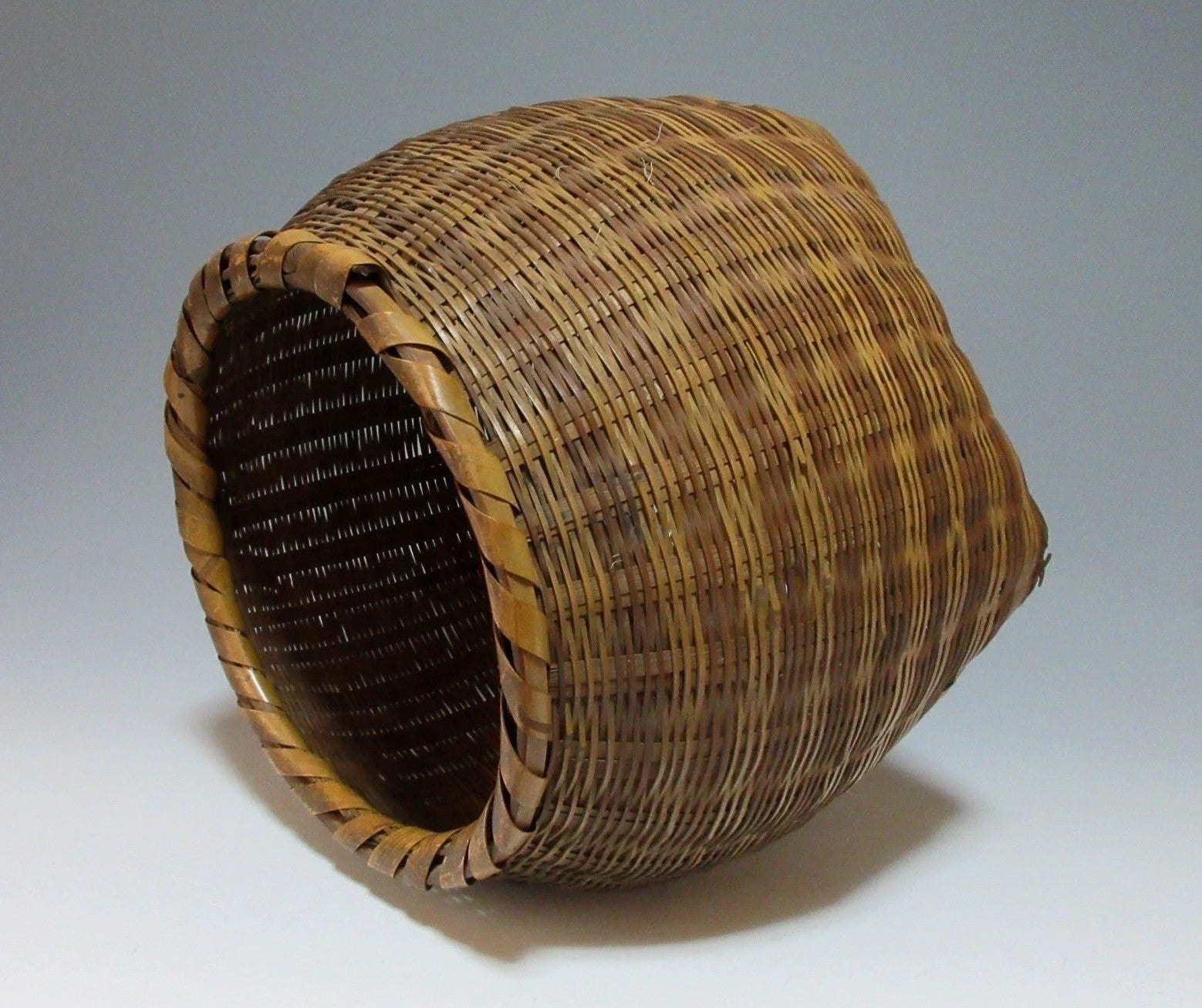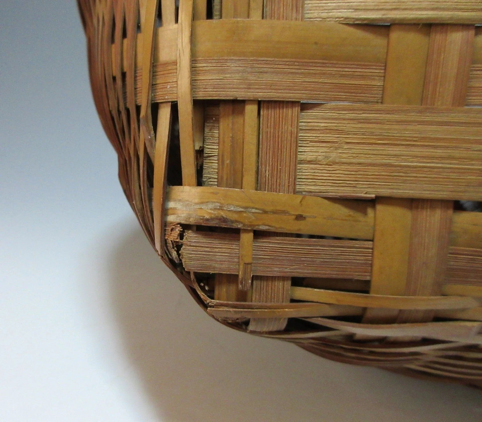 This particular item is OLD and there is some broken bamboo on the sides (not much and not serious) and on the four corners on the bottom. The rim is in good condition, also there is writing in pen on the bottom. The basket is discoloured from age but it’s still a very strong and sturdy basket.