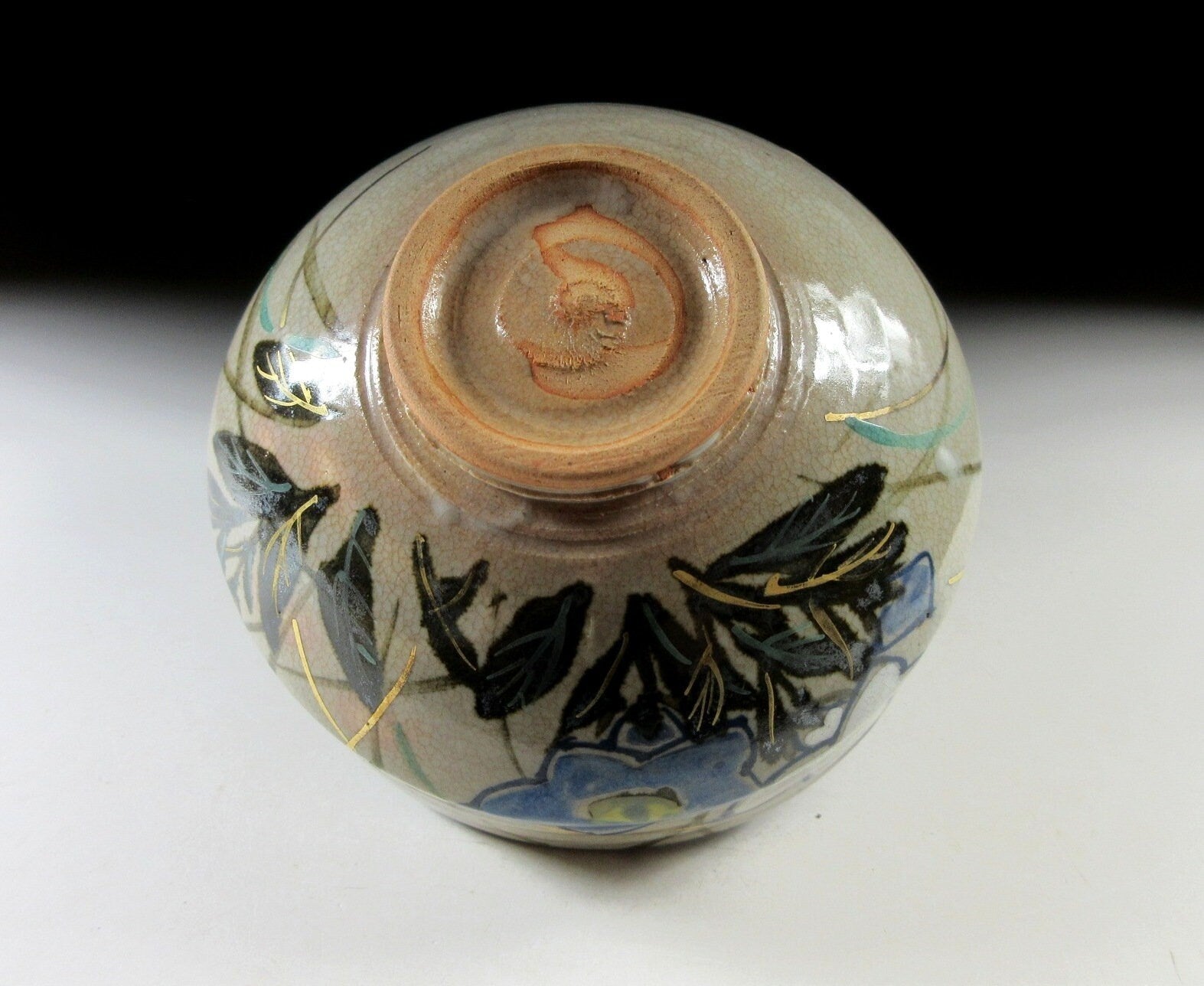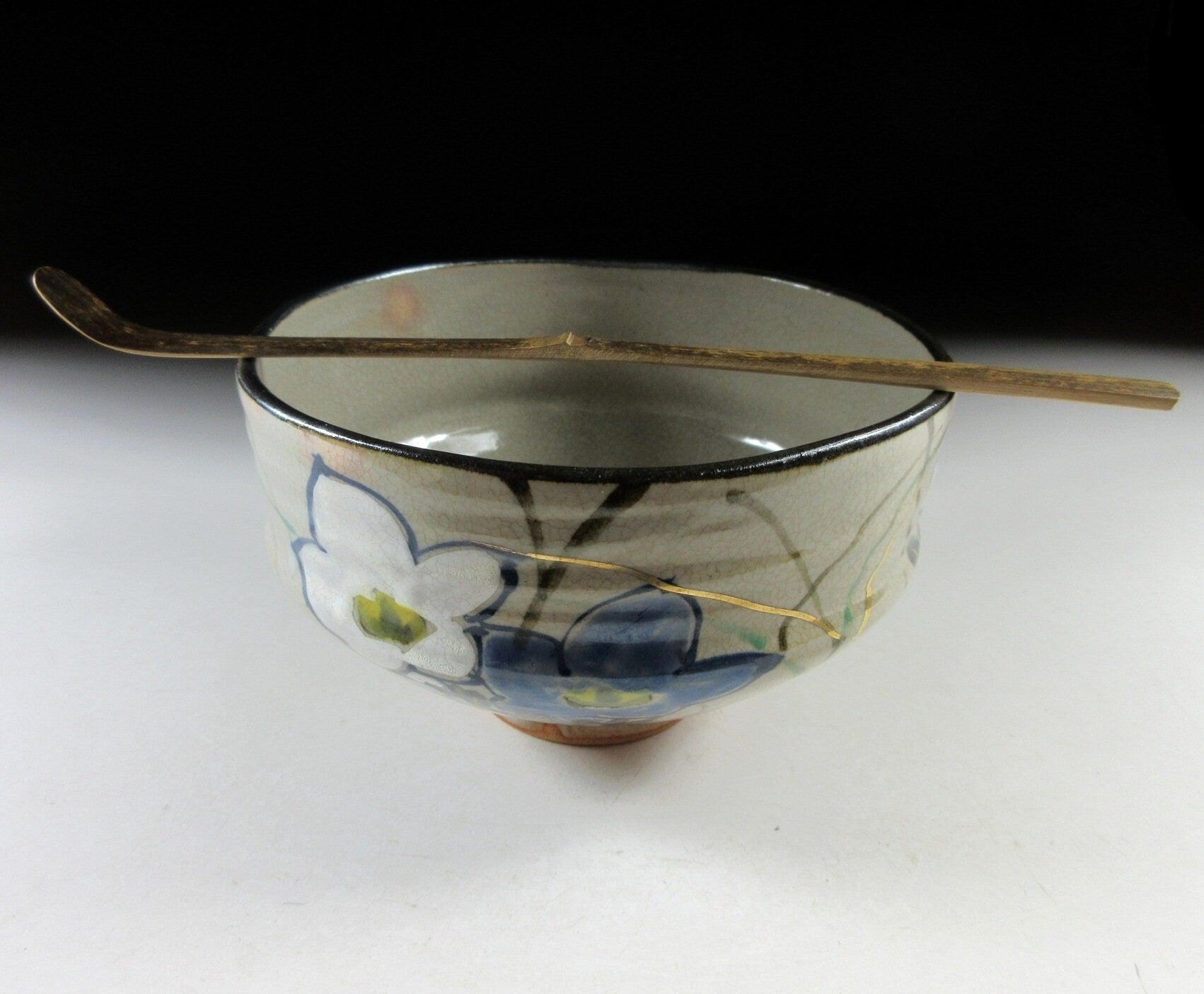 This listing is for a Kyo-ware chawan made around 20 years ago. It is wheel-thrown and decorated with hand-painted autumn grass and bellflowers over a transparent white glazed background. Bellflowers are one of the seven flowers of autumn, and they’re often used to decorate textiles, scrolls and tableware. The official seven flowers of autumn are bush clover, pampas grass, Japanese arrowroot, dianthus, golden lace, hemp agrimony, and the Japanese bellflower. These seasonal favourites have been popular since the latter half of the eighth century when a collection of waka poems known as Manyo-shu were compiled by a waka poet named Yamanoue-no-Okura. This piece is an attractive chawan with a pleasant combination of colours, however please note that there’s no potters mark to identify who made it. *PLEASE NOTE THAT THE CHASHAKU TEA SCOOP IS NOT INCLUDED.
