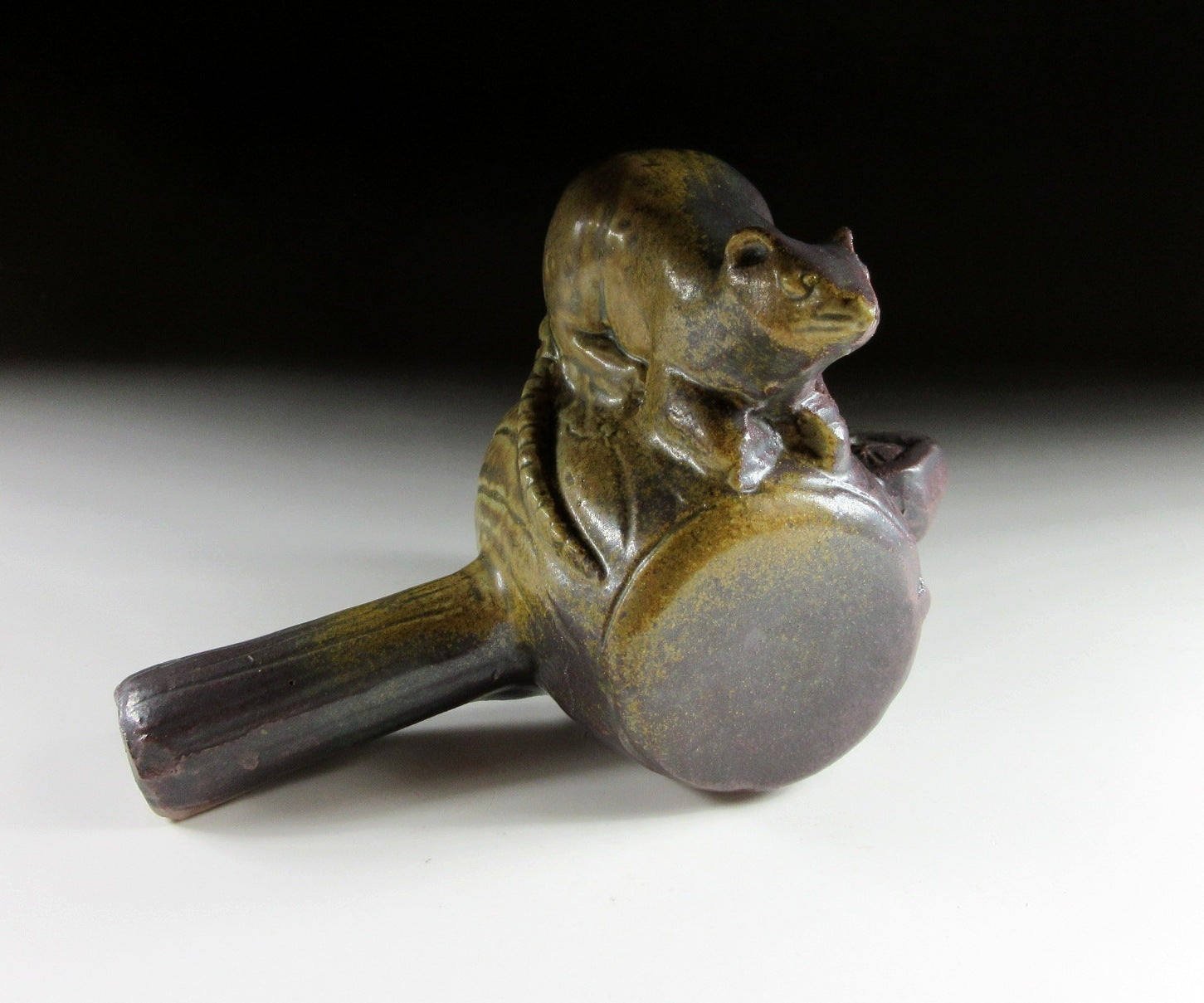 This listing is for a Bizen-ware okimono made around 20 years ago. It was made from a slip mould and is moulded to resemble a cheeky rat perked up on an uchide-no-kozuchi, otherwise known as a mallet of fortune. It is believed that striking an uchide-no-kozuchi will bring anything you wish for, making it a very popular motif during New Year. This piece was most likely made to commemorate the Year of the Rat back in 1996. The signature of the potter can be found on the bottom, sorry no box.