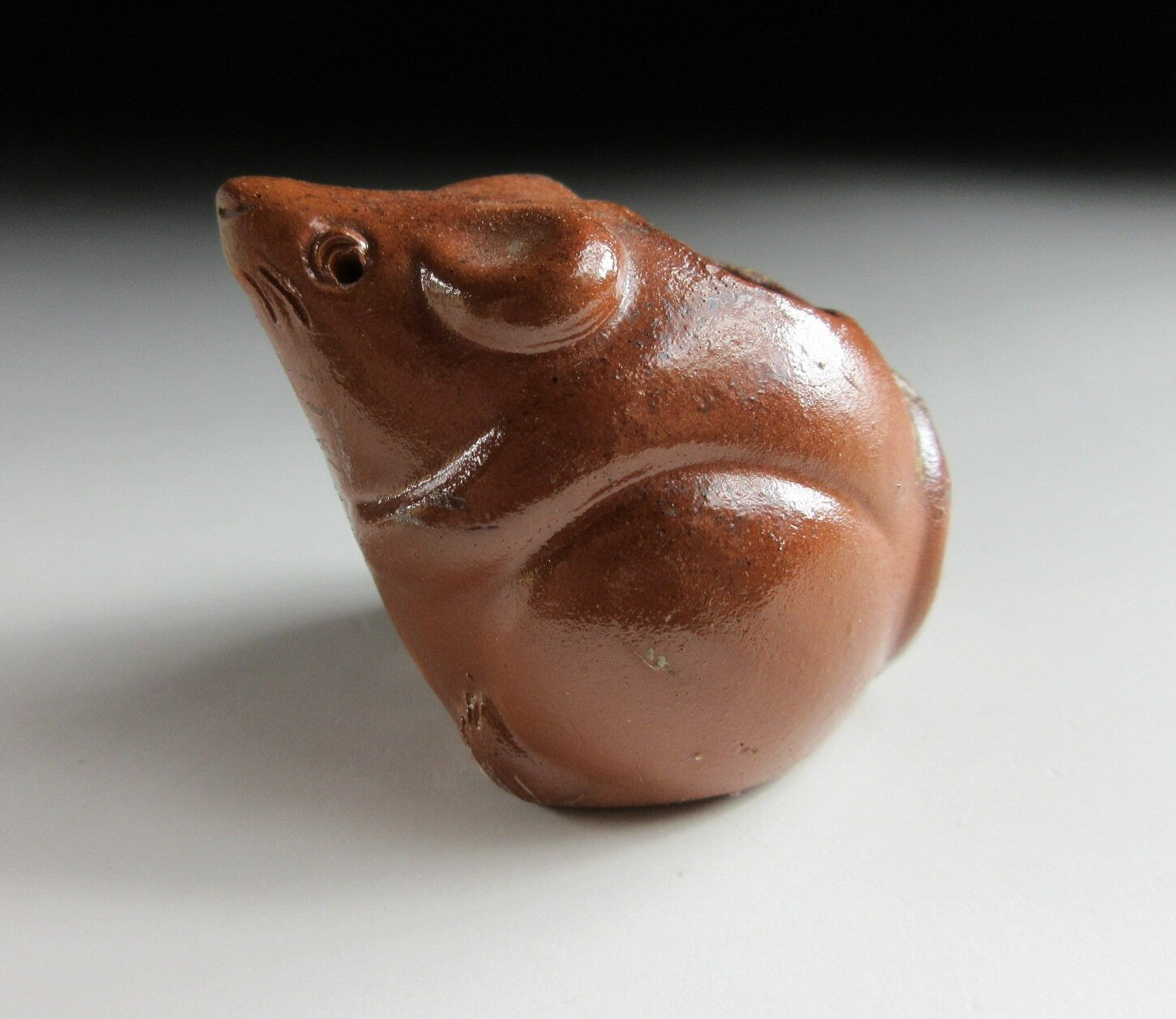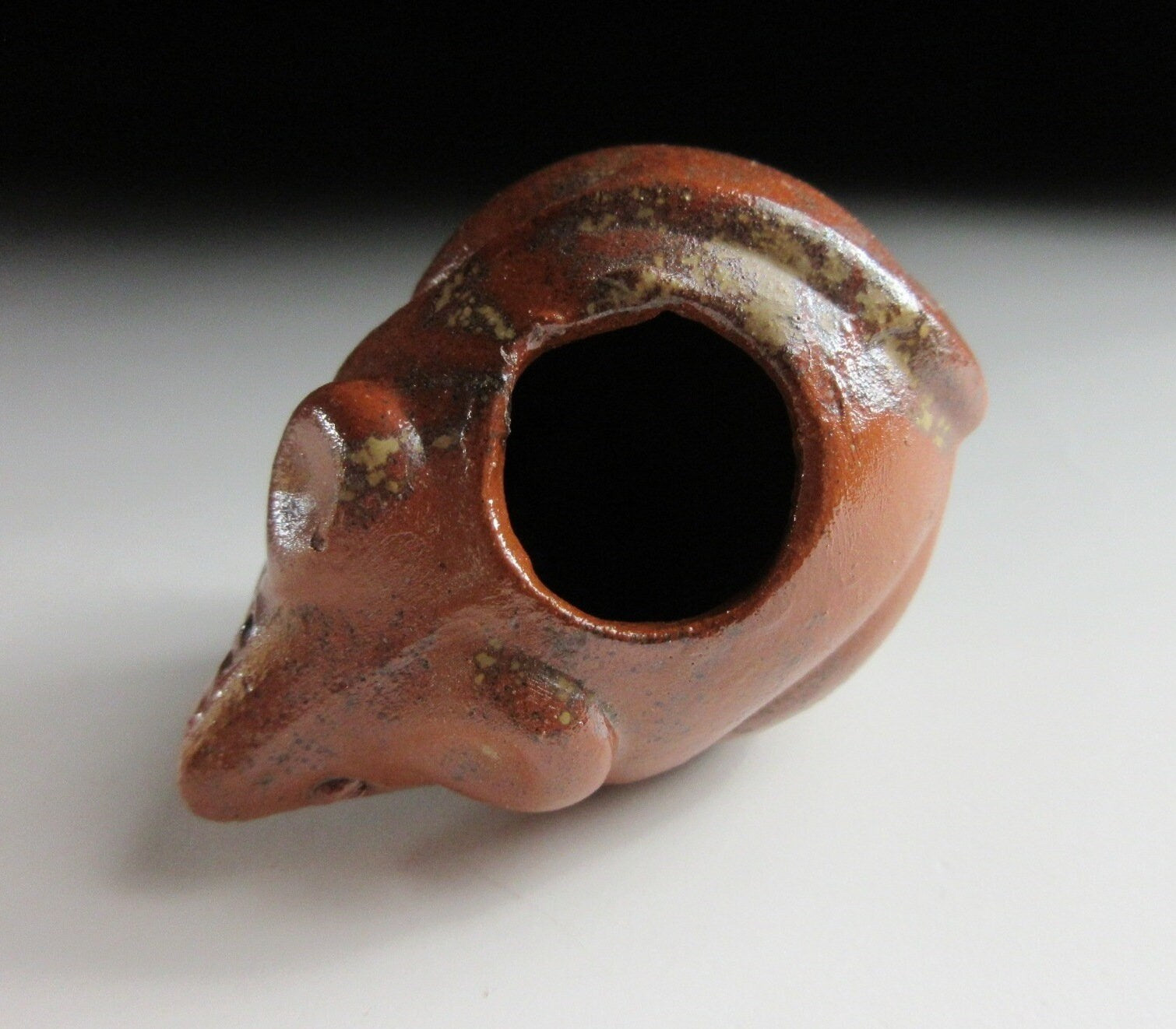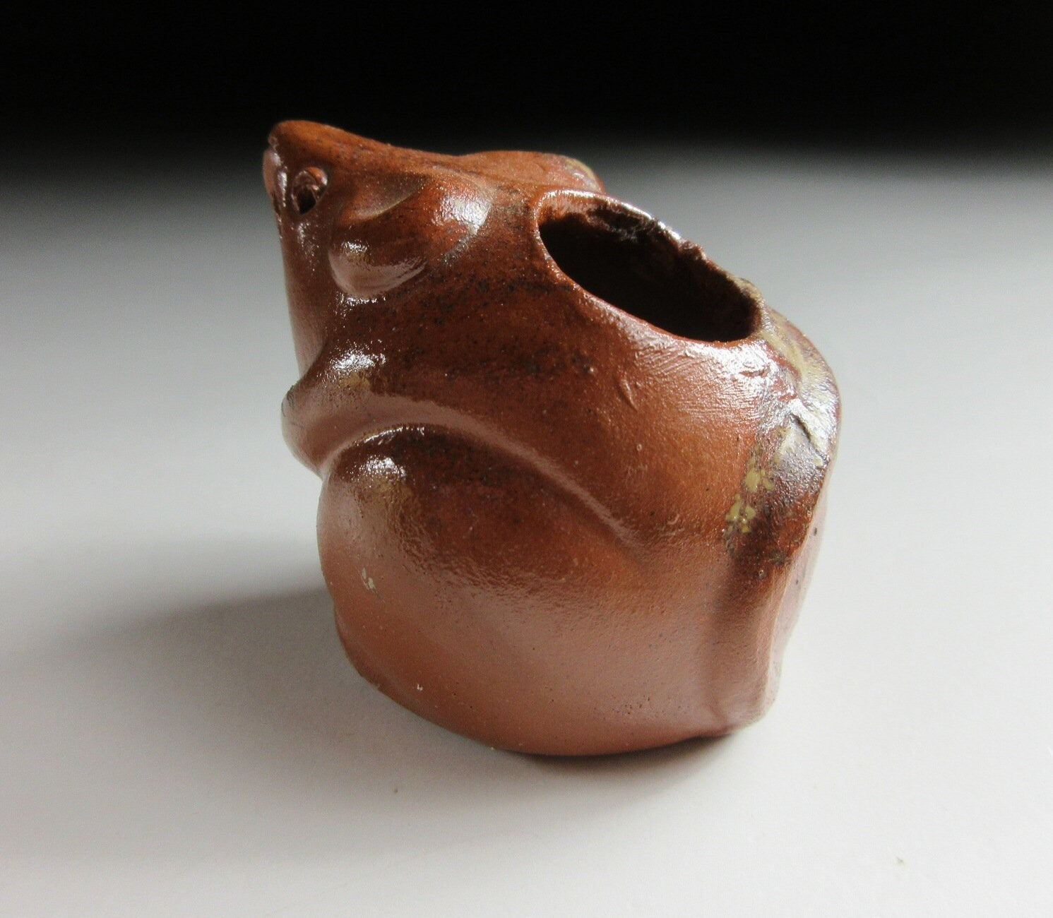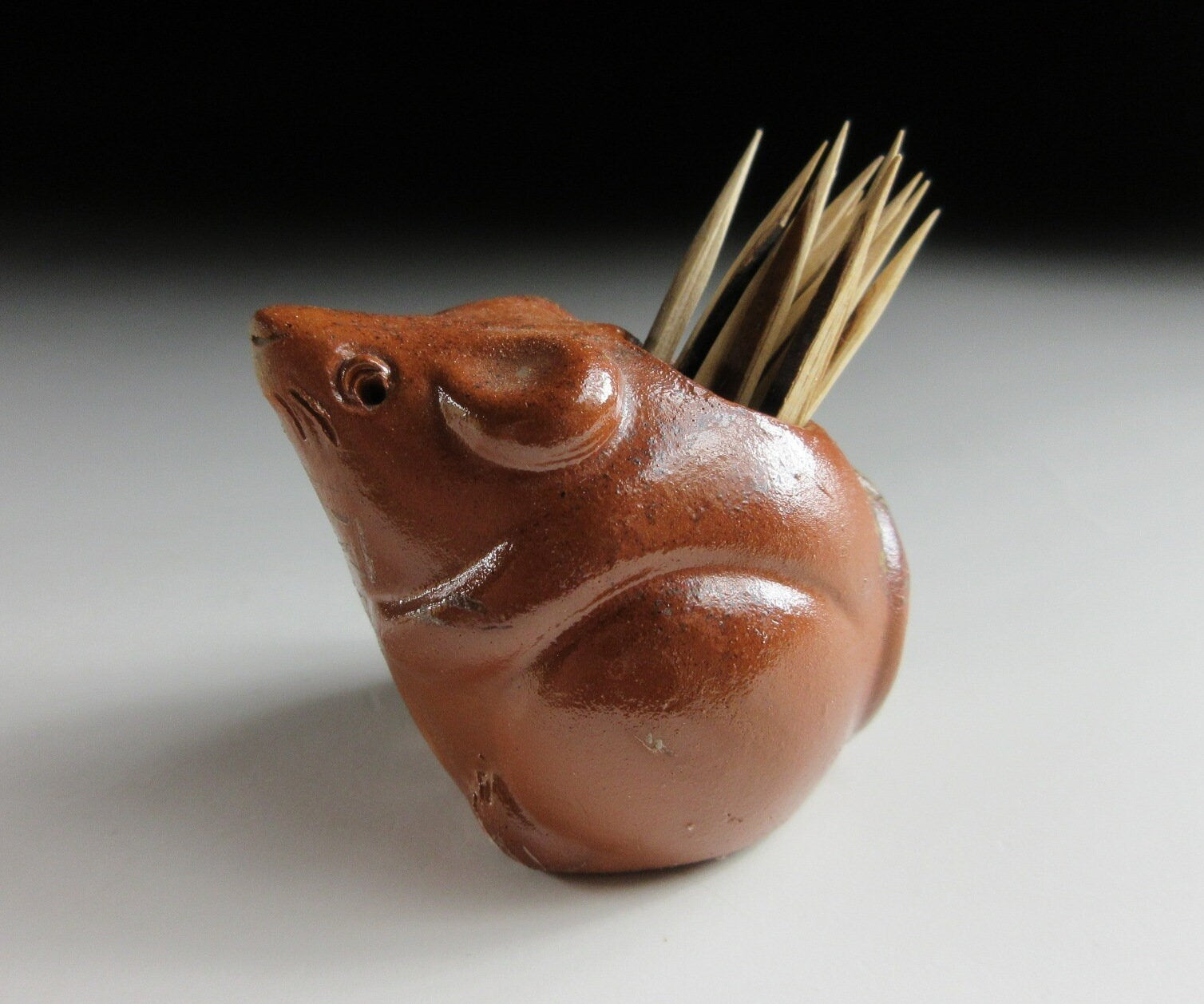 This listing is for a small wood-fired Bizen-ware Year of the Rat toothpick holder made by Kataoka Seikan. It was made using a mould and features goma and hidasuki markings. Hidasuki refers to the process of wrapping wares with cords of straw, which are then fired off resulting brilliant shades of red. Toothpick holders like these are also ideal for growing air plants. The signature of the potter can be found on the bottom, sorry no box.