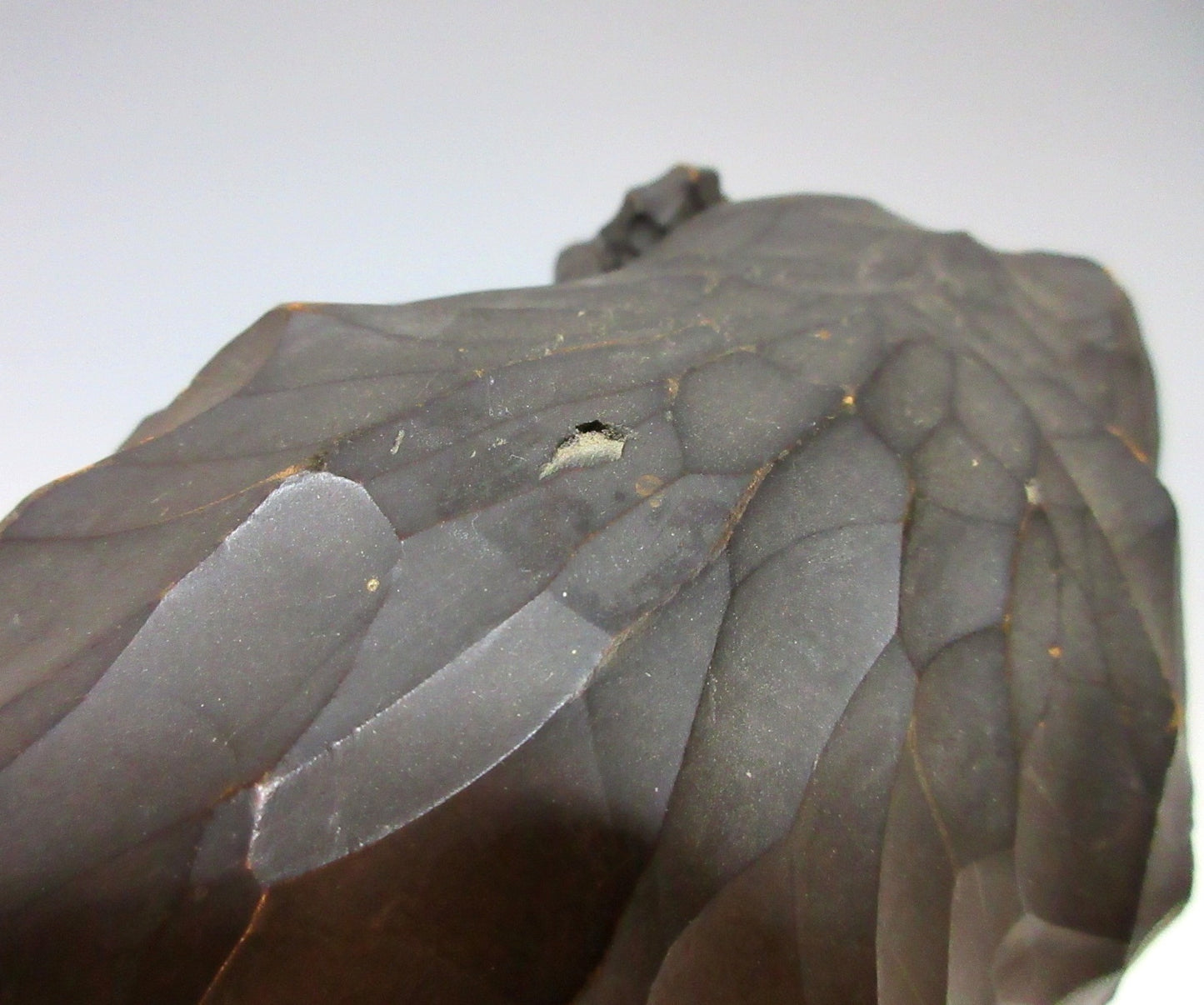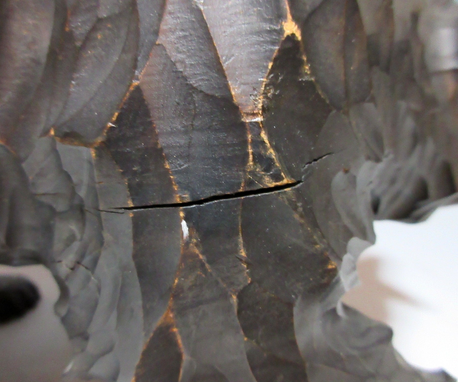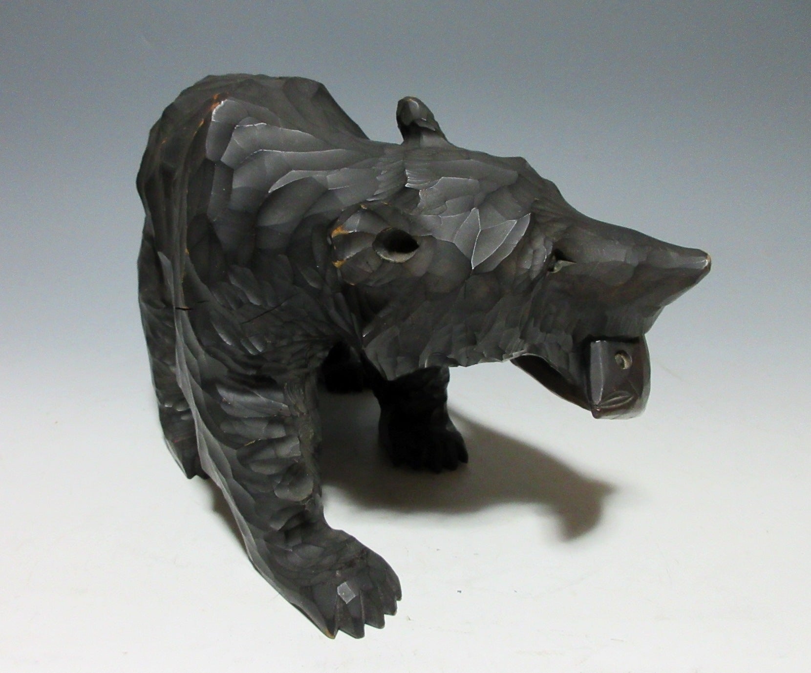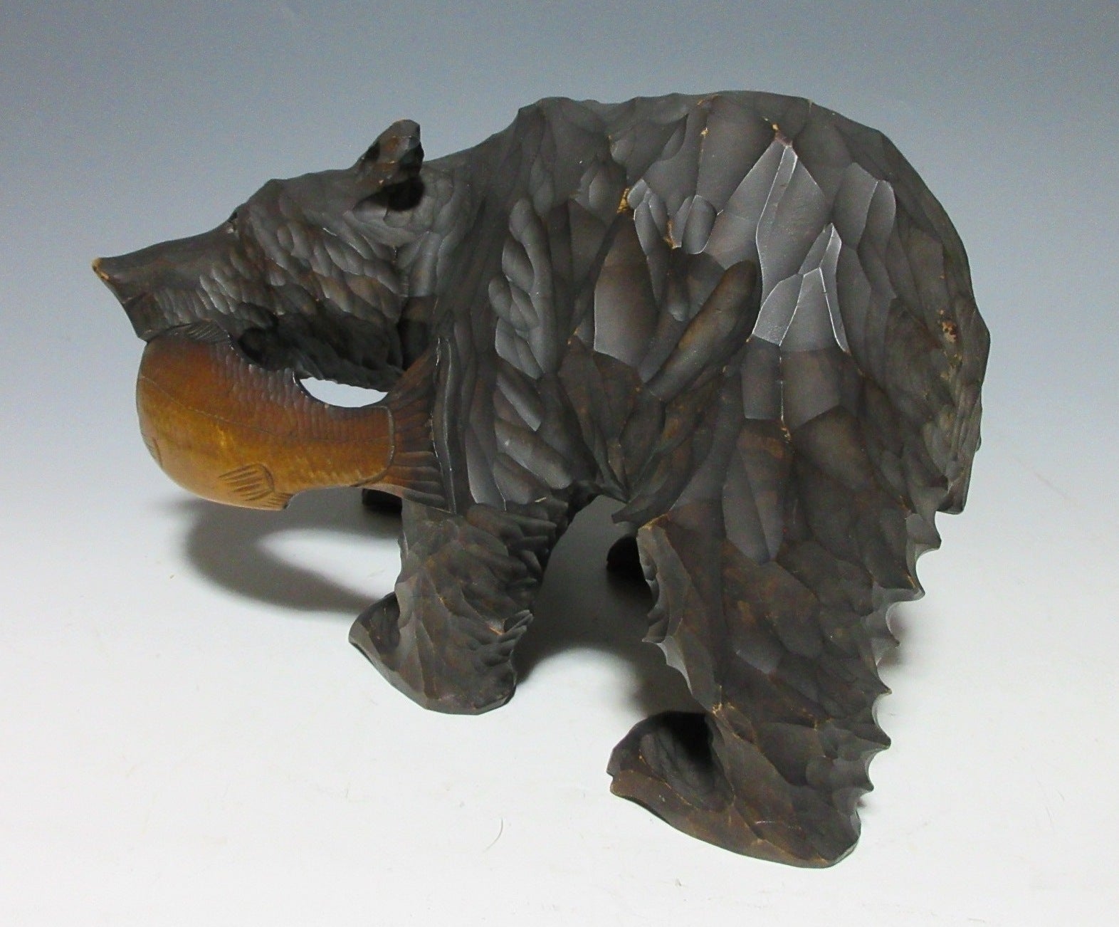 It’s in pretty good condition aside from worn lacquer (nose, salmon, ears, and along some of the fur), and it has a split in the back. There’s also a nick in the wood on top from when it was made.