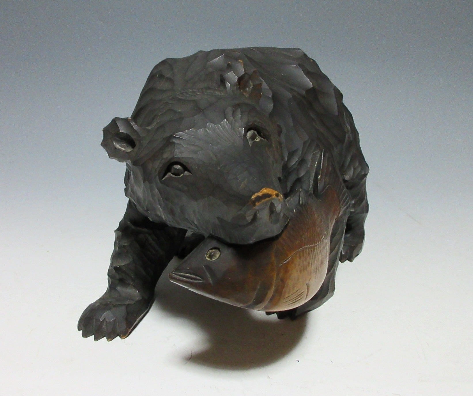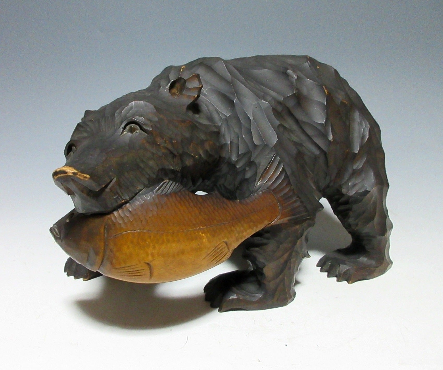 This listing is for a vintage higuma bear carving from the northern island of Hokkaido. The texture of the fur is rigorously carved, and it is depicted with a freshly caught salmon in its mouth. The entire bear has been fashioned from one single piece of wood, and it is hand carved. This piece is rather heavy, please read below regarding shipping and upgrades.