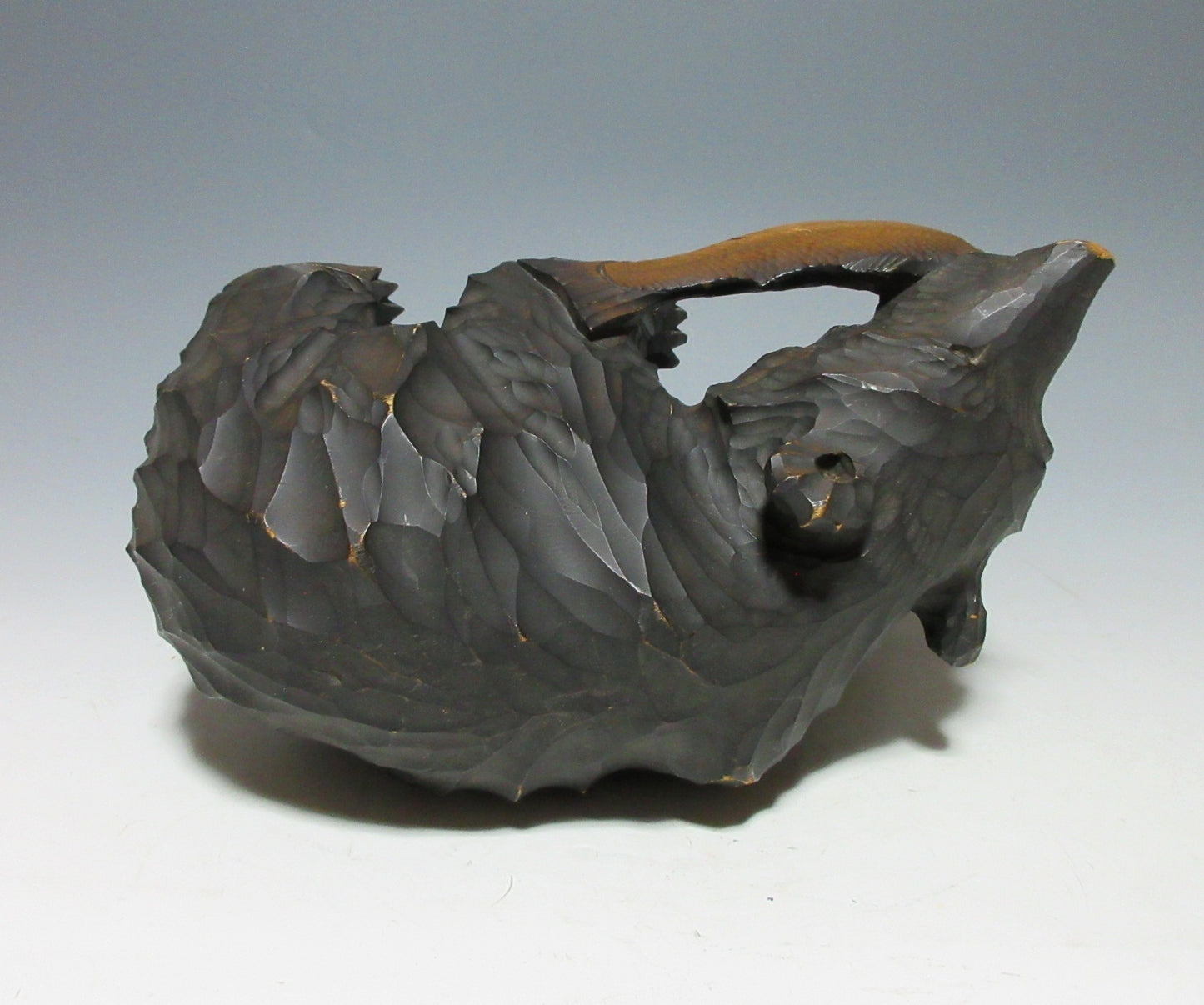 The Ainu people of Japan first started commercial wood carving back in the1920s. Traditionally their carvings consisted of religious objects, however dire economic circumstances forced them to turn to wood carving for tourists. Their wares, particularly the Higuma bear carvings, became very popular as souvenirs due to their very realistic appearance. The Emperor himself acquired a Higuma bear made by a highly talented carver named Umetaro Matsui in 1938. Following this Matsui won many awards for his work, and gradually these ornate carvings became recognised as beautiful works of art.