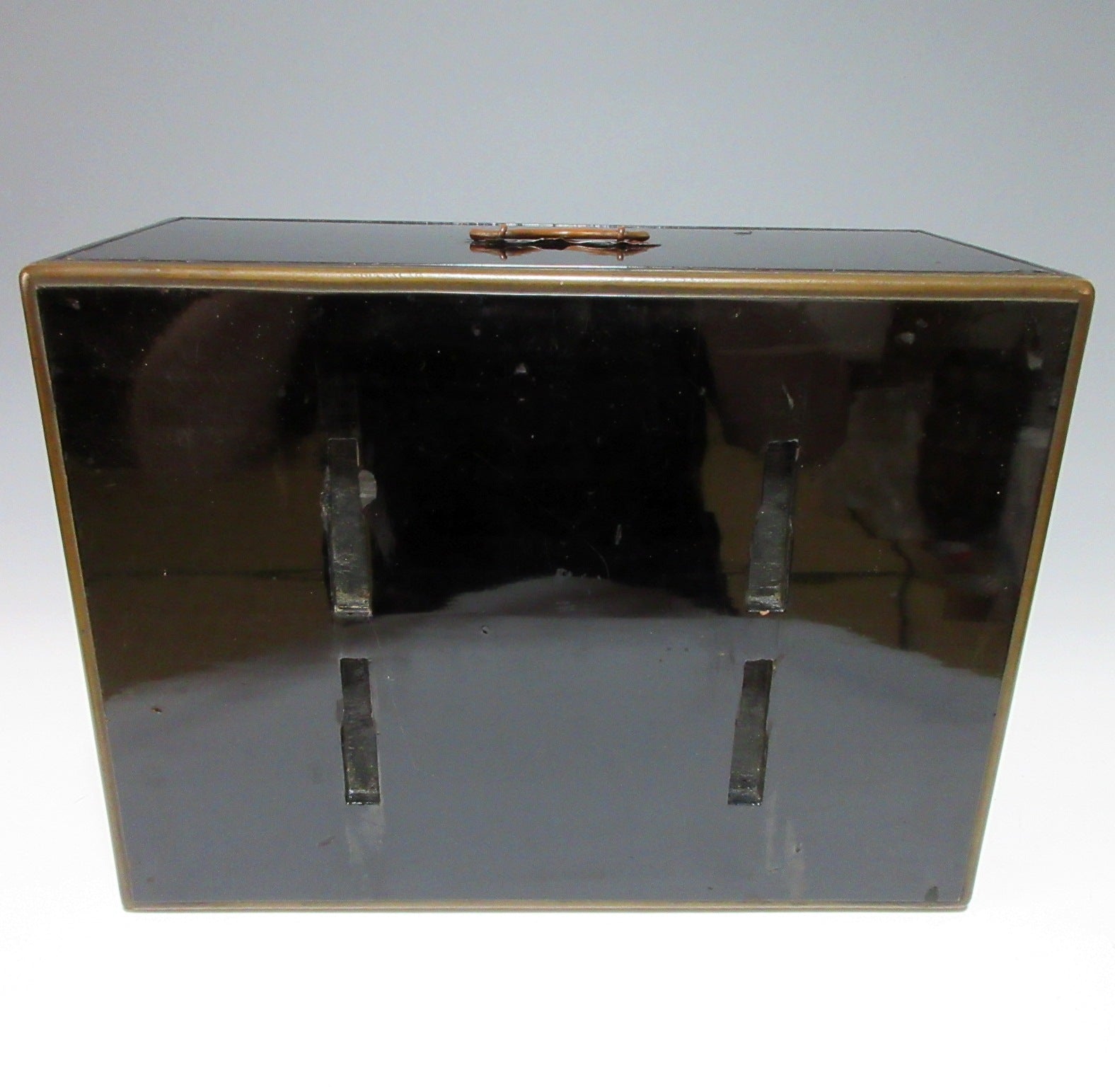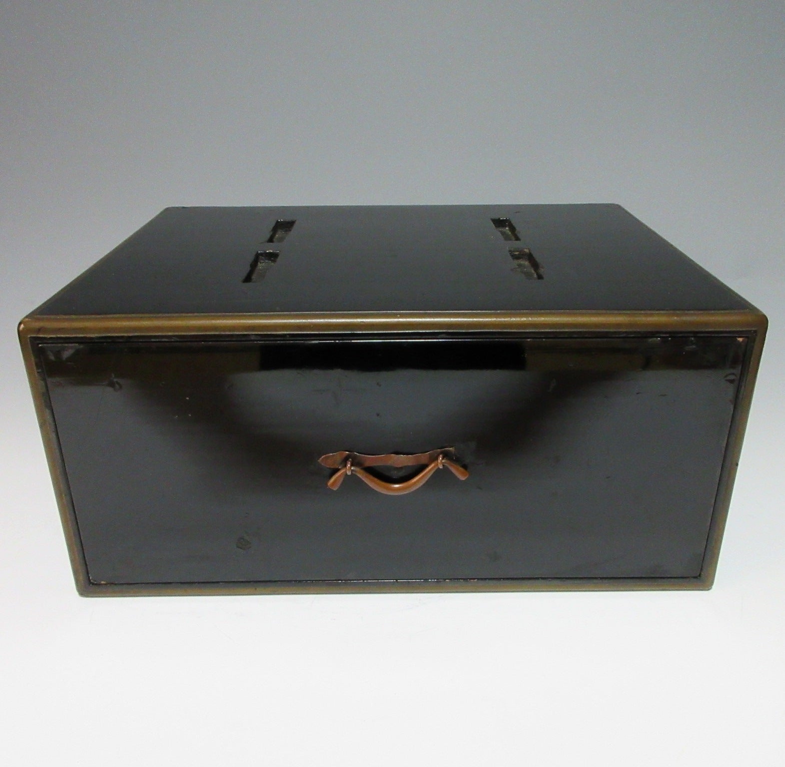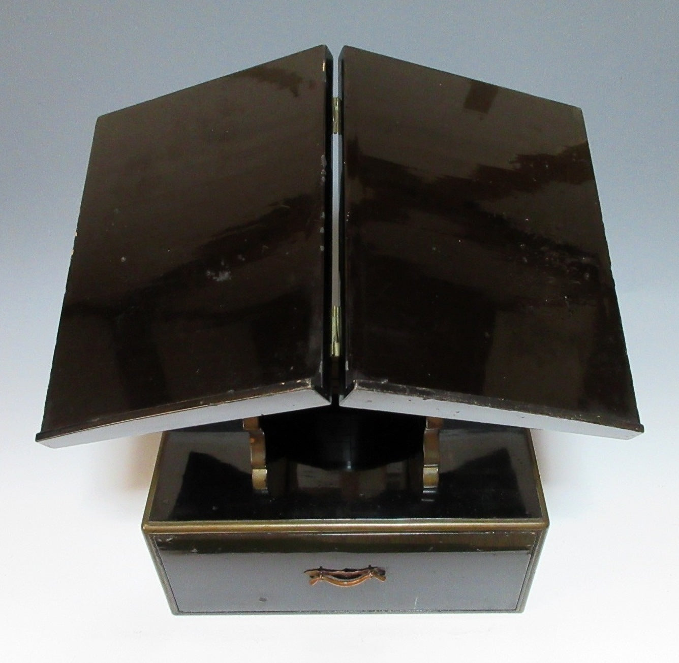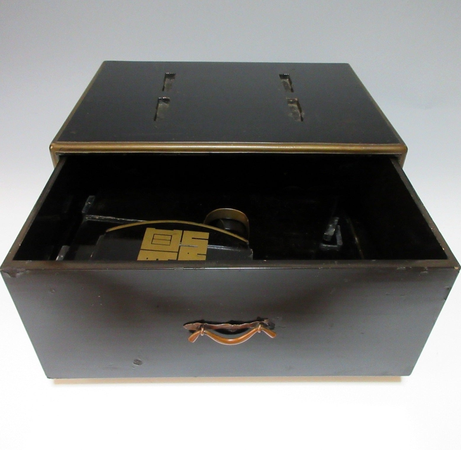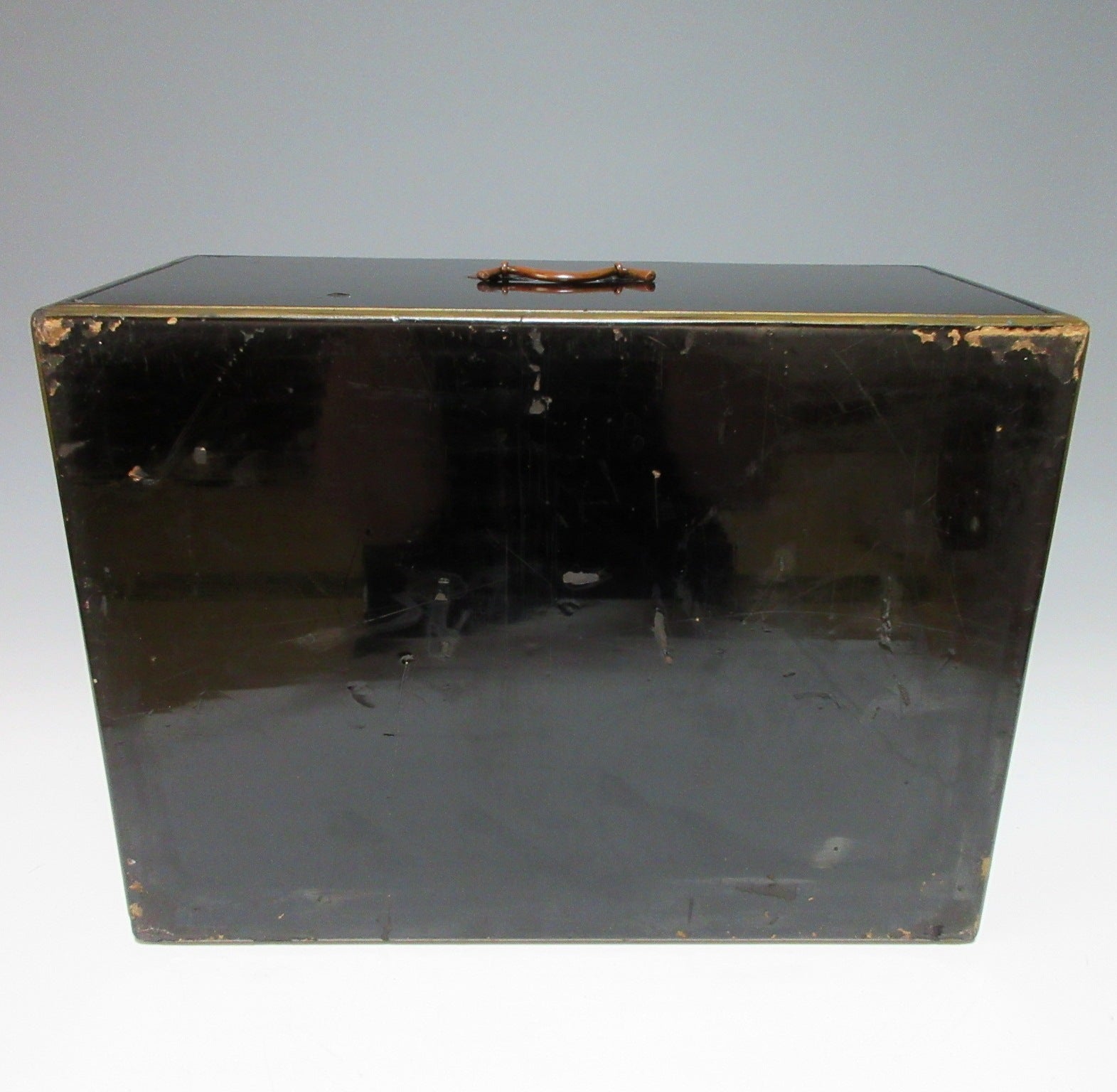 The drawer part: Scratches, scuffing, some lacquer worn (mainly along edges), some lacquer has flaked off in places, one end broken off the thin metal plate that the handle is attached to. There are many scratches on the bottom, some dents, chipped lacquer, scuffing, as well as general wear on the interior.