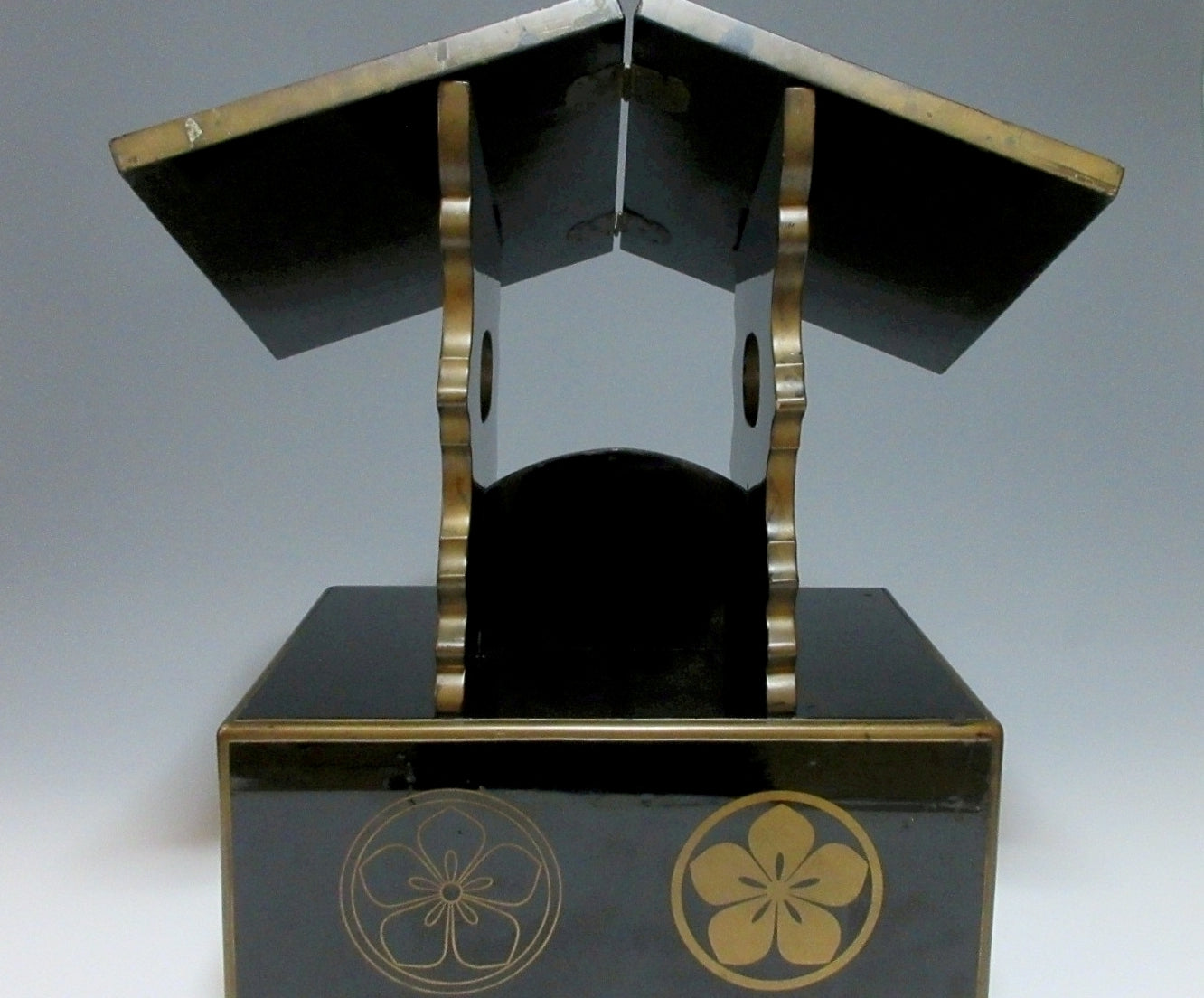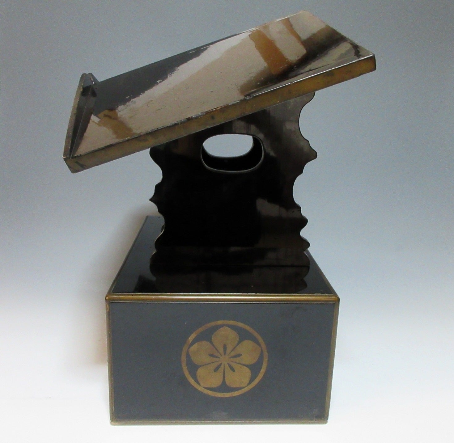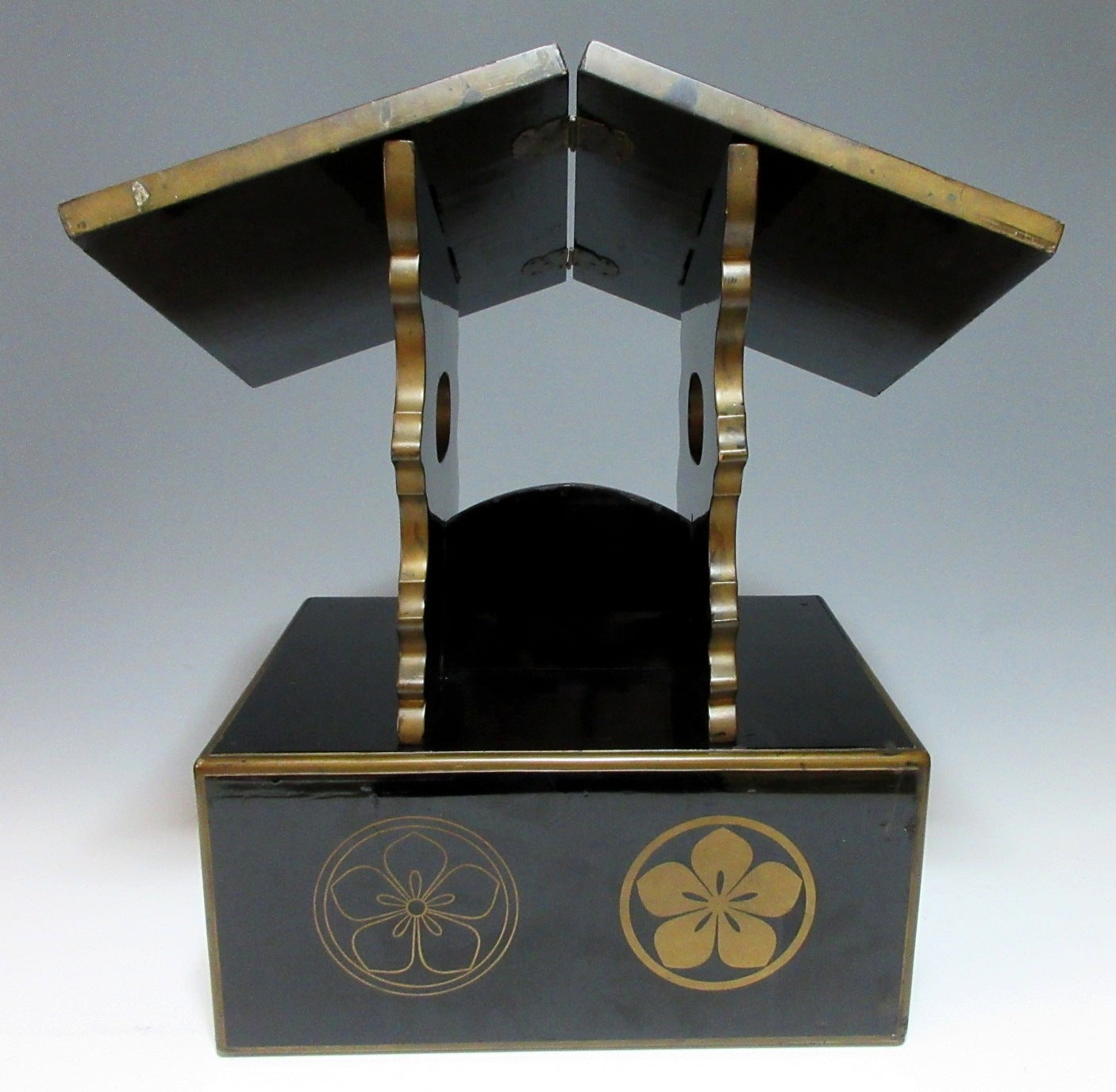 This listing is for an urushi lacquer midai made around 70-80 years ago. A midai is a lectern reading desk with a slanted top. It is an altar fitting used for reading scriptures, and unlike conventional lecterns, midai are low because they’re used by monks sitting on the floor. The midai in this listing is made of wood and coated in black lacquer, and it is decorated with a sakura kamon family crest commonly associated with the Ota clan. The slanted part folds in the centre, and the stand can be detached. The detached parts are stored in the drawer part when not in use. It is not uncommon for scripts and prayer books to be stored in the drawer as well.