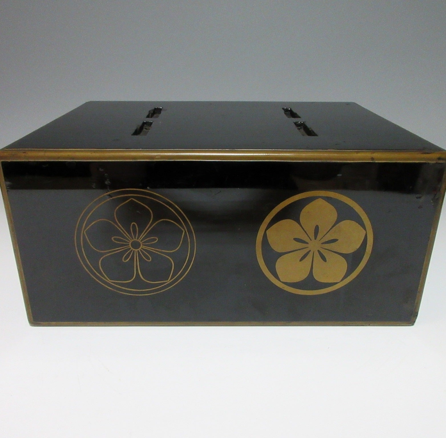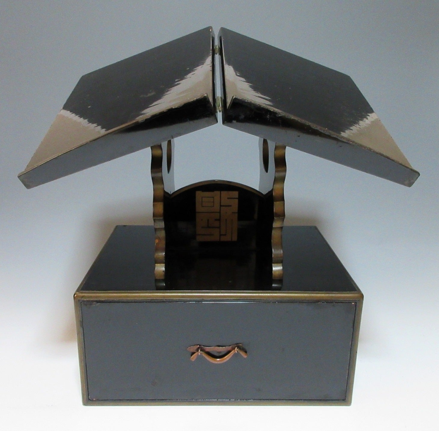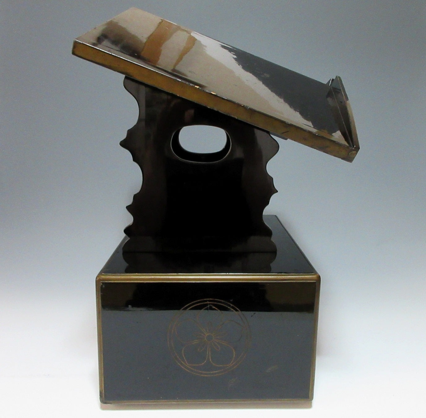 This listing is for an urushi lacquer midai made around 70-80 years ago. A midai is a lectern reading desk with a slanted top. It is an altar fitting used for reading scriptures, and unlike conventional lecterns, midai are low because they’re used by monks sitting on the floor. The midai in this listing is made of wood and coated in black lacquer, and it is decorated with a sakura kamon family crest commonly associated with the Ota clan. The slanted part folds in the centre, and the stand can be detached. The detached parts are stored in the drawer part when not in use. It is not uncommon for scripts and prayer books to be stored in the drawer as well.